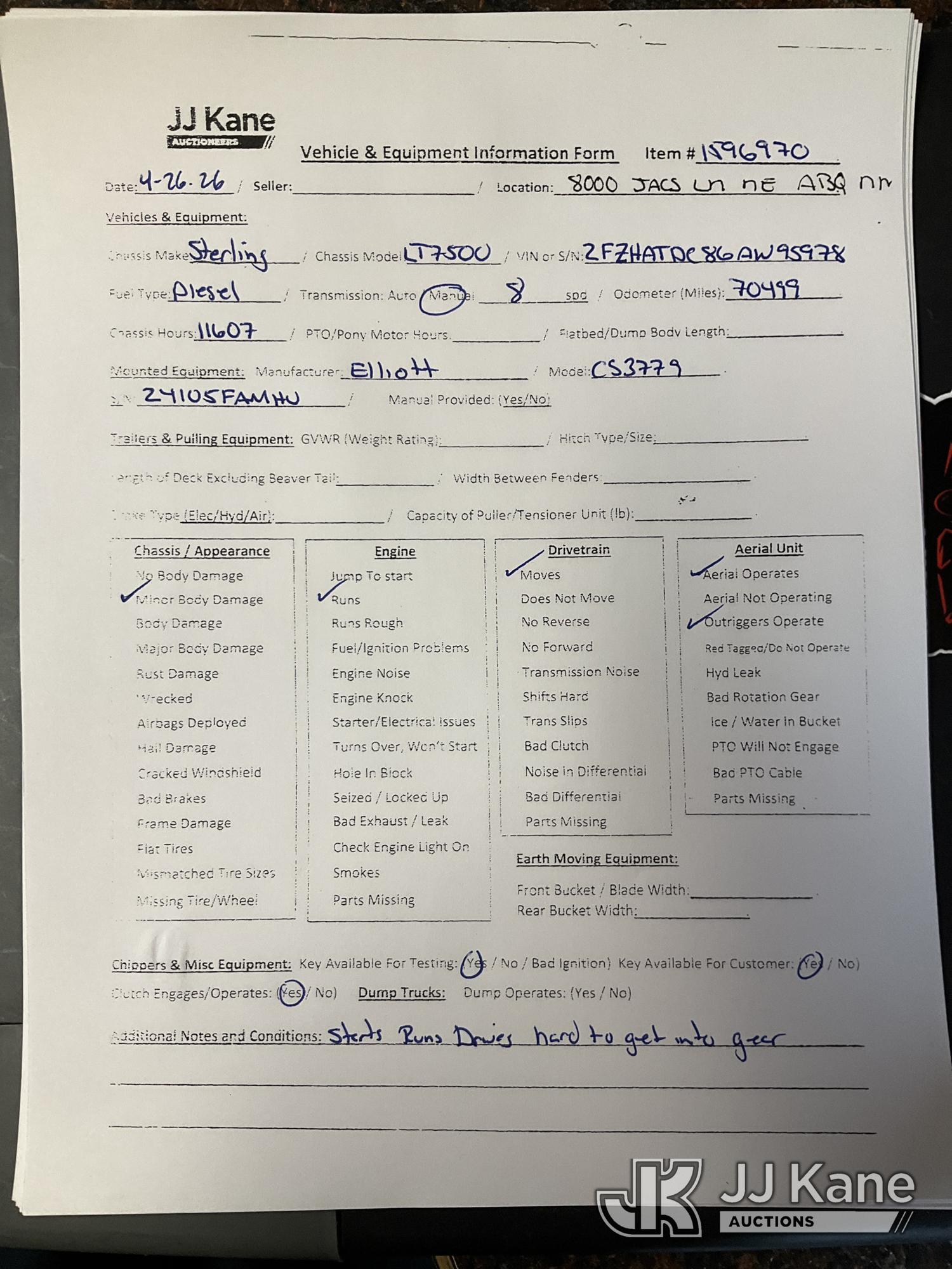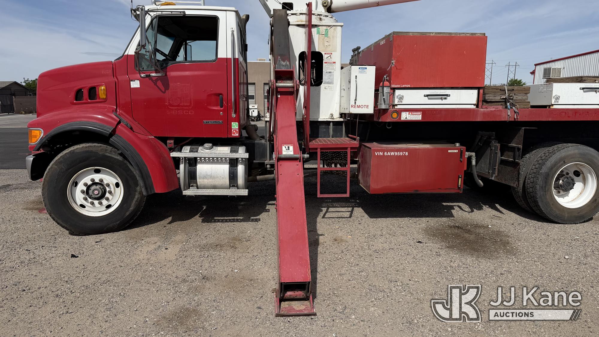 Elliott 24105FAMHU, 24-Ton Hydraulic Truck Crane s/n CS3779, with 114ft sheave height, 4 section hyd boom, 26ft stowable swing-away jib, headache ball, heel winch, LMI with display and hydraulic function lockout for load capacities, control console is equipped with anti-two-block system, 5 hydralic outriggers, mounted behind cab on 2006 Sterling LT7500 T/A Flatbed/Utility Truck, 7.2L 6X4, DIESEL, 8-spd w/ Lo-Lo, A/C, (Exempt from Odometer Disclosure - Reads 70,499 miles) ((Runs, Moves & Upper Operates) (Hard To Get Into Gear)) (Reads 11,607 hours) This is a Titled Item*