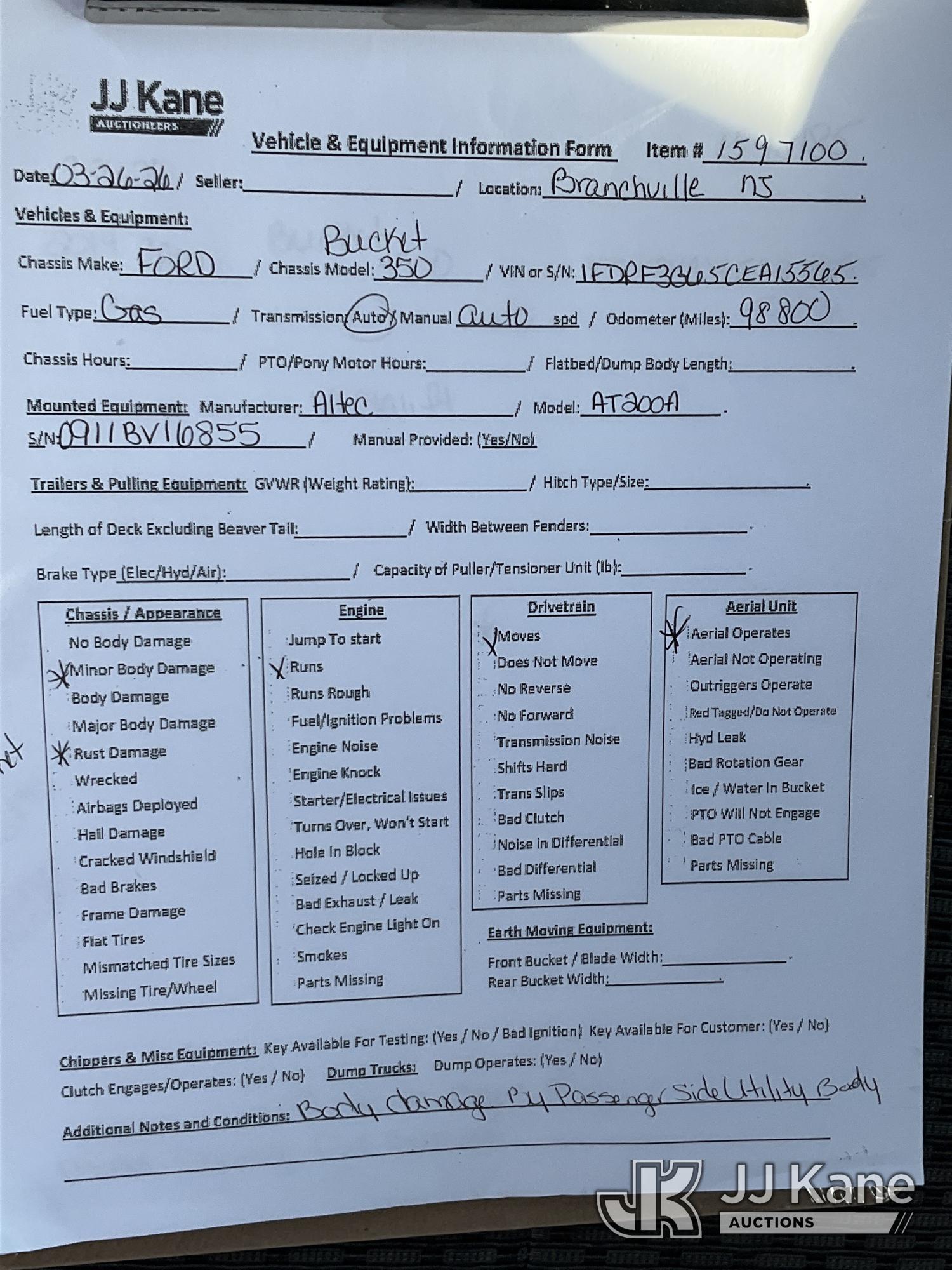 Altec AT200A, 35 ft, Telescopic Non-Insulated Bucket Truck s/n 0911BV16855, with Single-Man Bucket, mounted behind cab on 2012 Ford F350 2WD Service Truck, 8-cyl gas, Auto, A/C, (98,800 miles) (Runs, Moves & Upper Operates) (Removal is by Appointment Only, Buyer MUST make a appointment prior to picking up, Buyer/Transporter Must have PAID IN FULL RELEASE. No onsite assistance available, Please Come prepared.) This is a Titled Item*