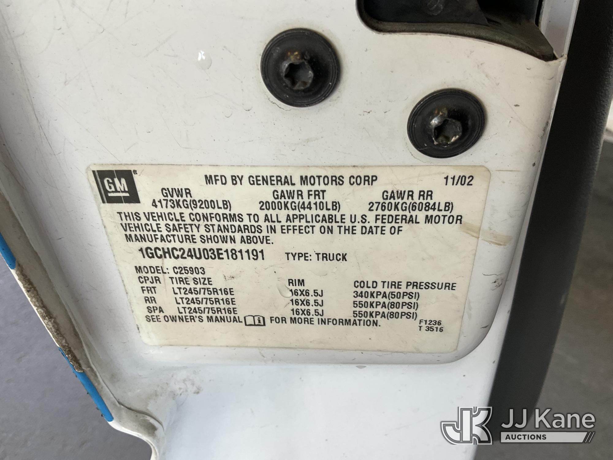 2003 Chevrolet Silverado 2500HD 2WD Pickup Truck, s/n 1GCHC24U03E181191, 6.0L V8 OHV 16V RWD, GAS, Auto, A/C, with Tow package, toolbox, (Exempt from Odometer Disclosure - Reads 151,552 miles) (Not Running, Charging System Issue, Conditions Unknown, Missing Belt, Must Be Towed) (Bidding Restricted to Licensed Vehicle Dealers Only), This is a Titled Item*