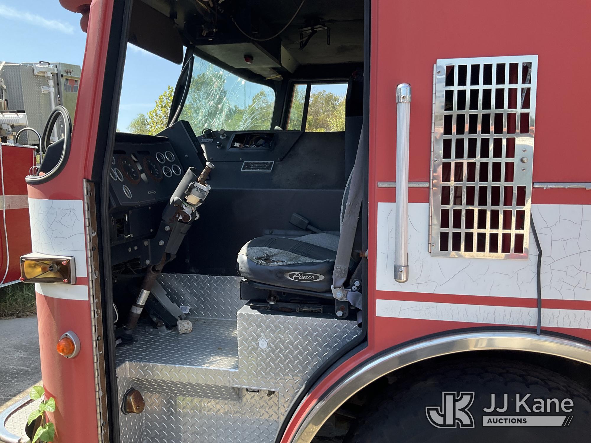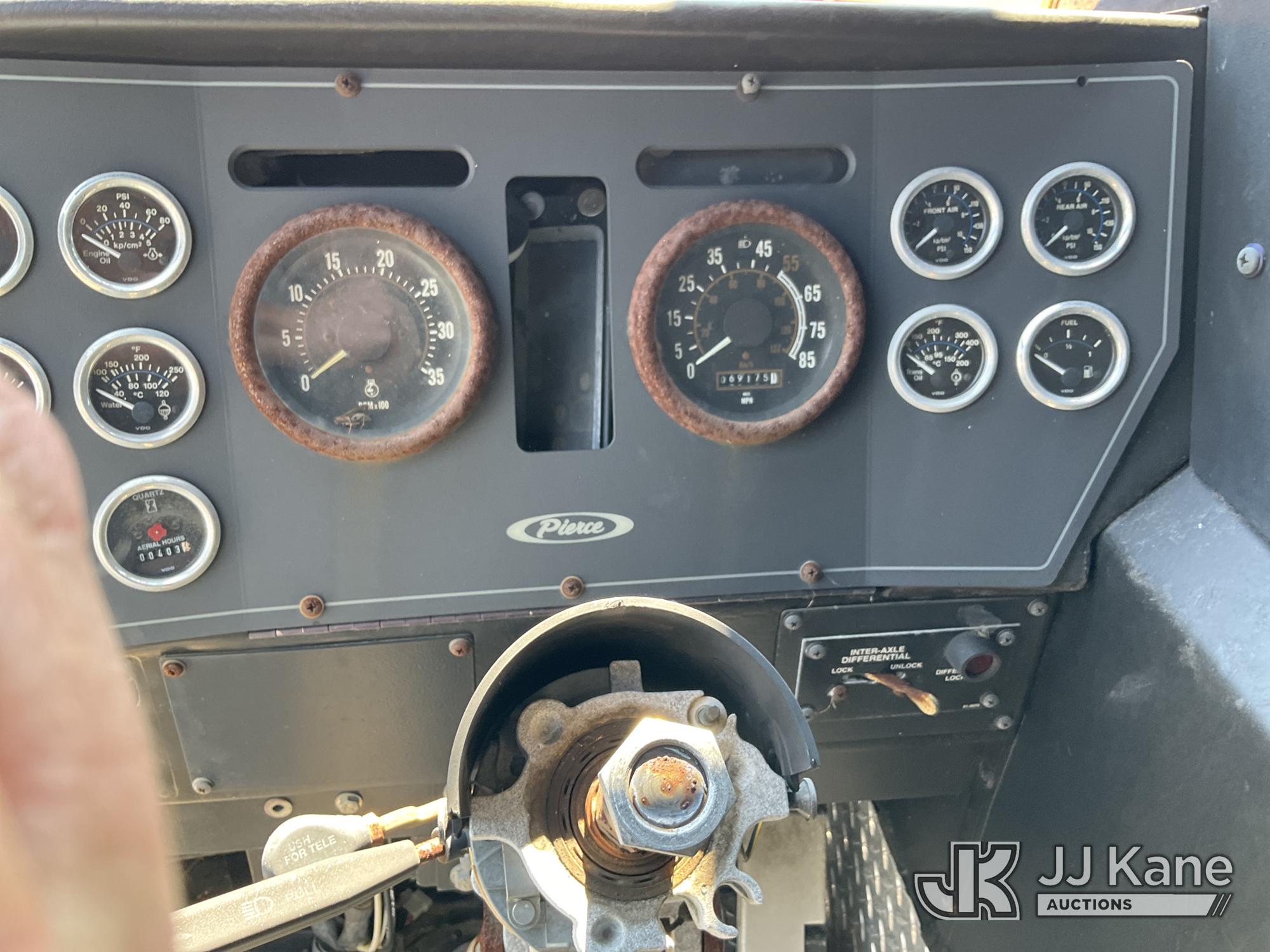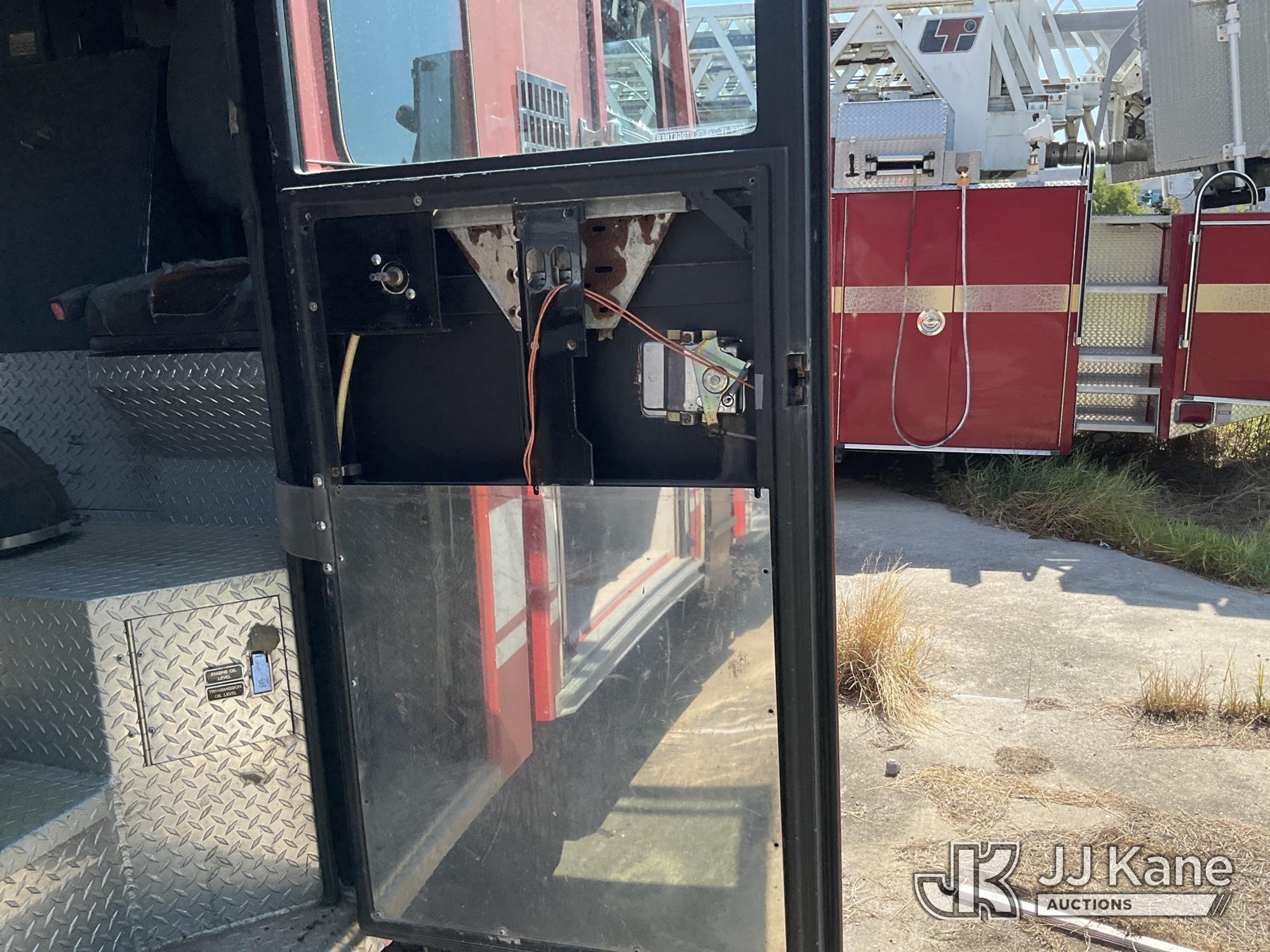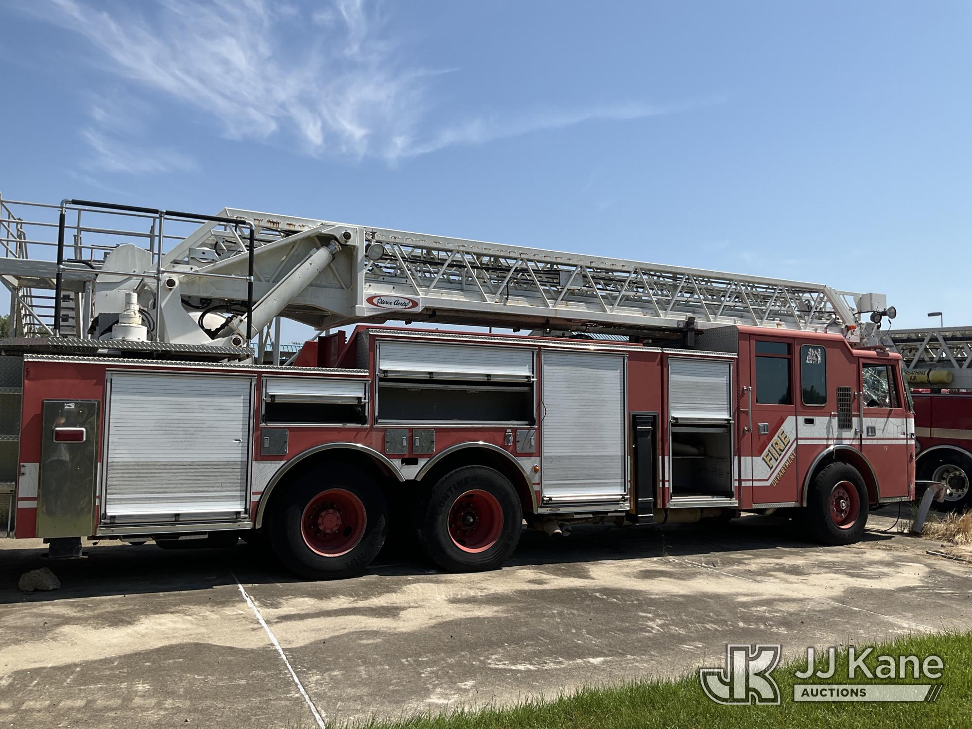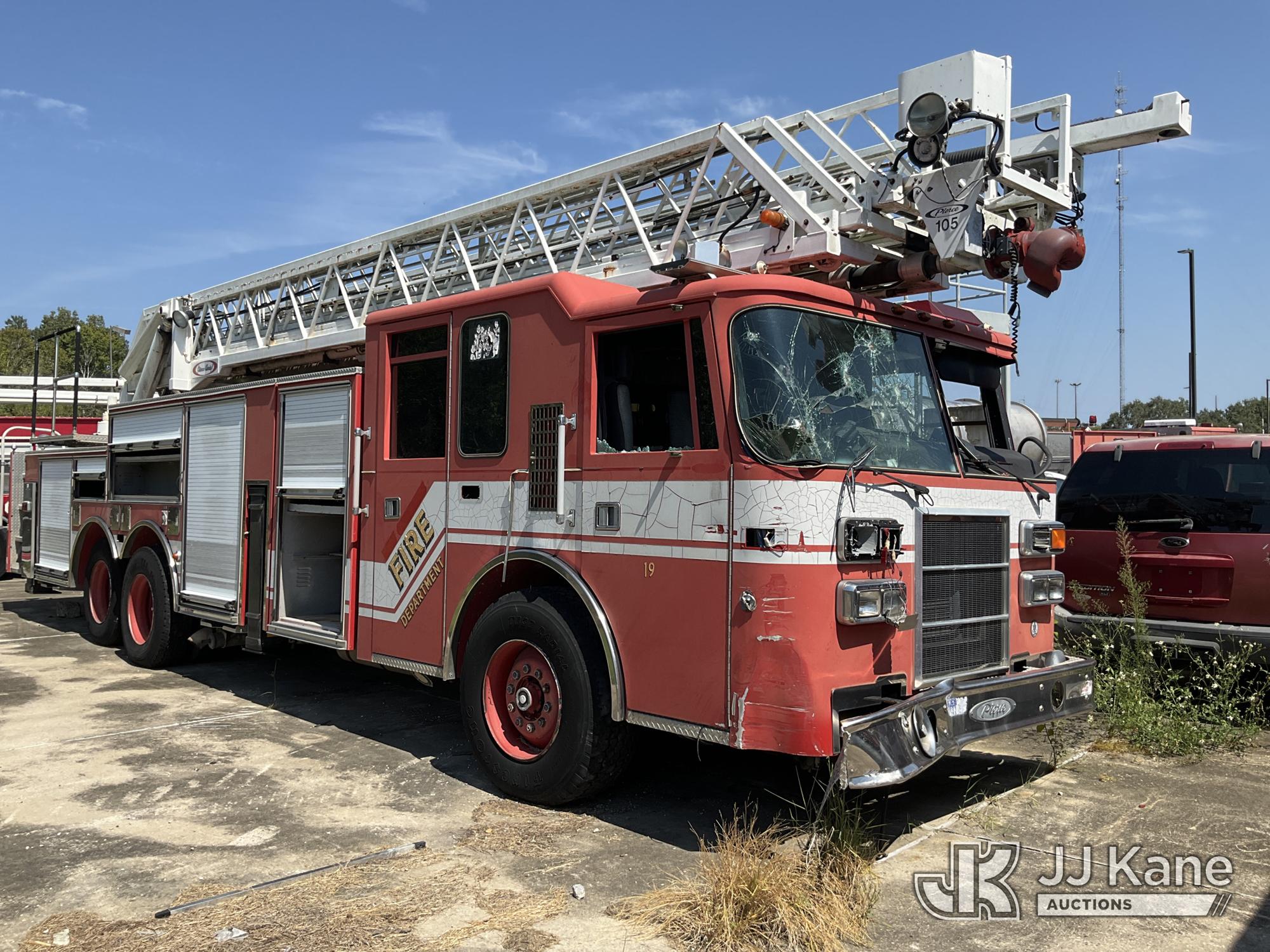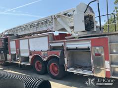 1999 Pierce Model Tilt Cab Ladder Truck/Fire Truck, 12.7L L6 DIESEL Auto, (Exempt from Odometer Disclosure - Reads 69,175 miles) (Not Running, Condition Unknown, Missing Door, Missing Steering Wheel, Missing Various Items, Missing and Broken Glass, No Upper Placard) This is a Titled Item*