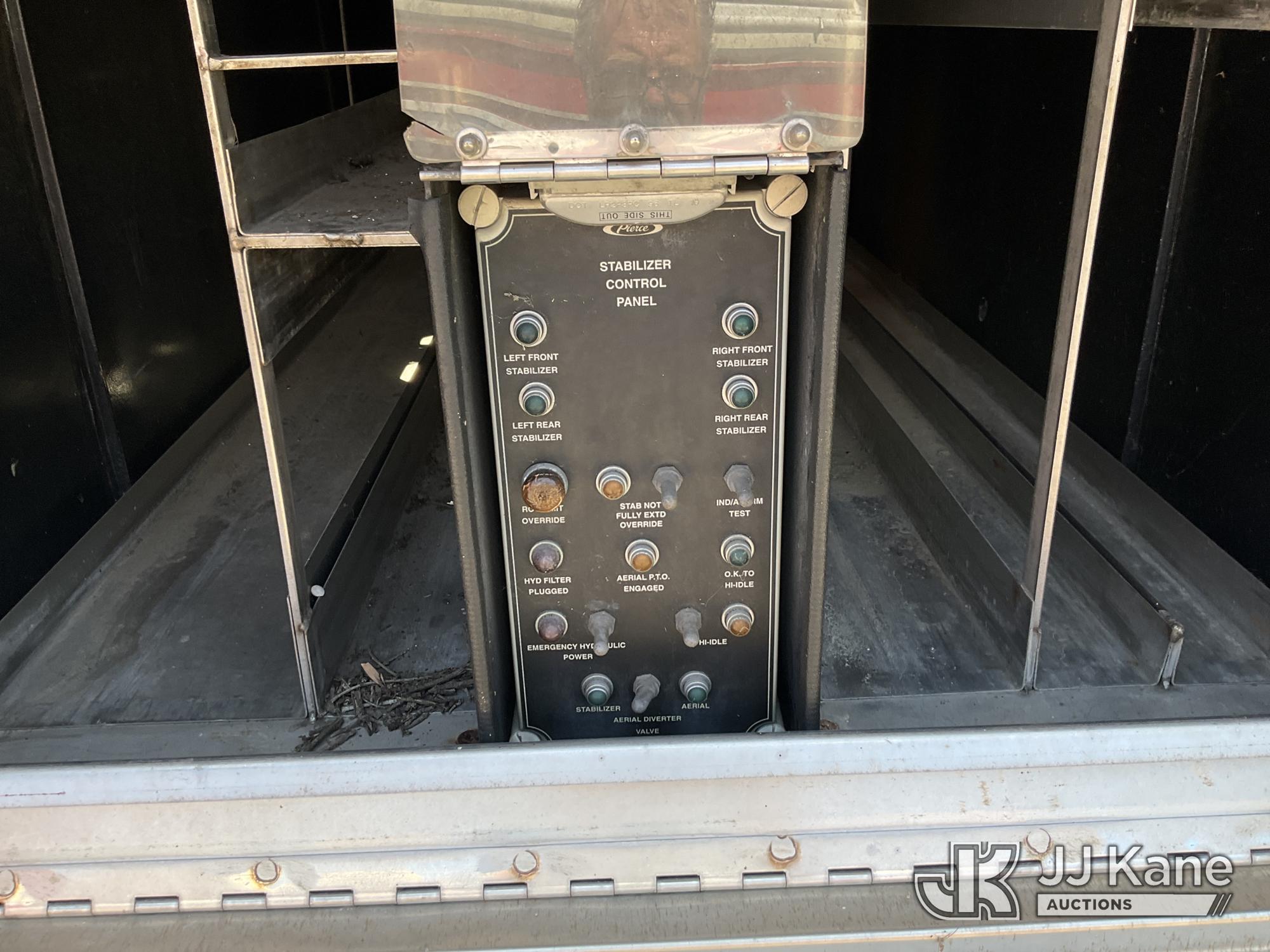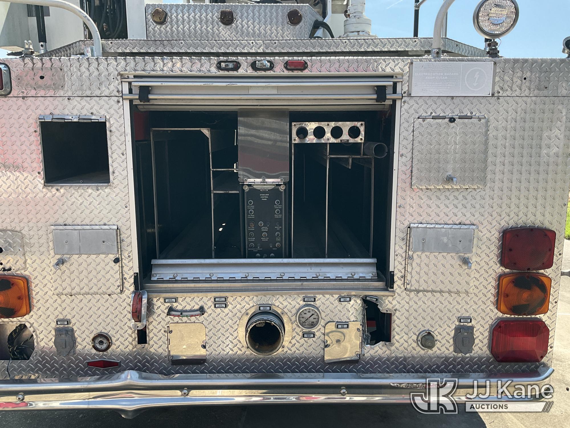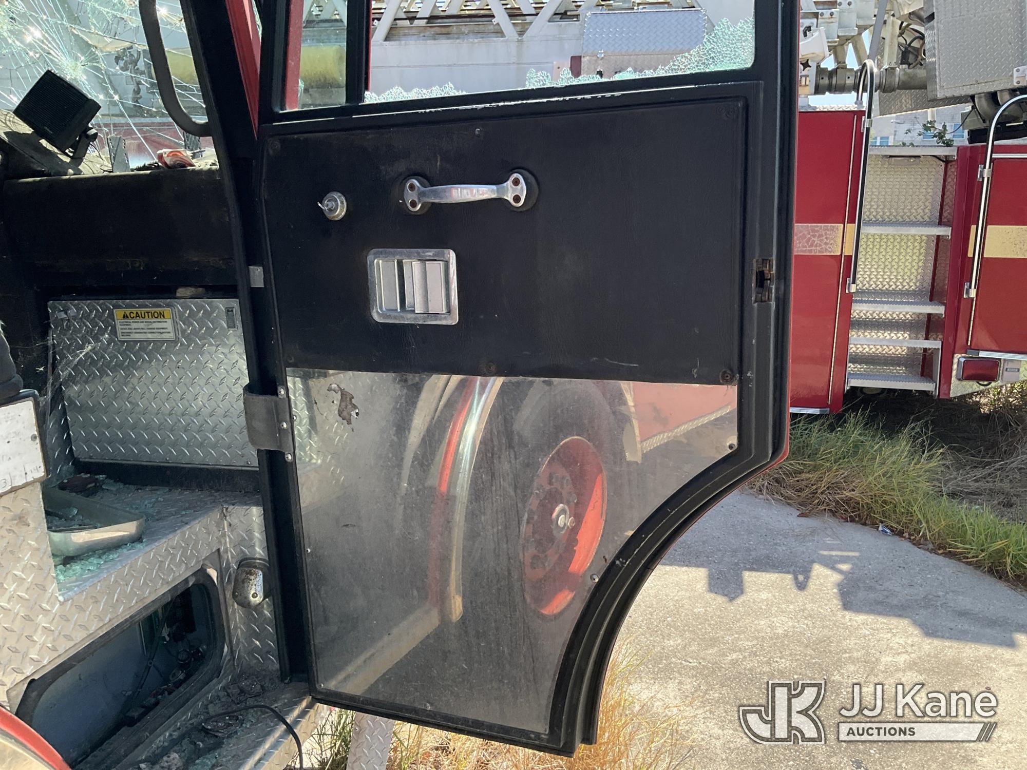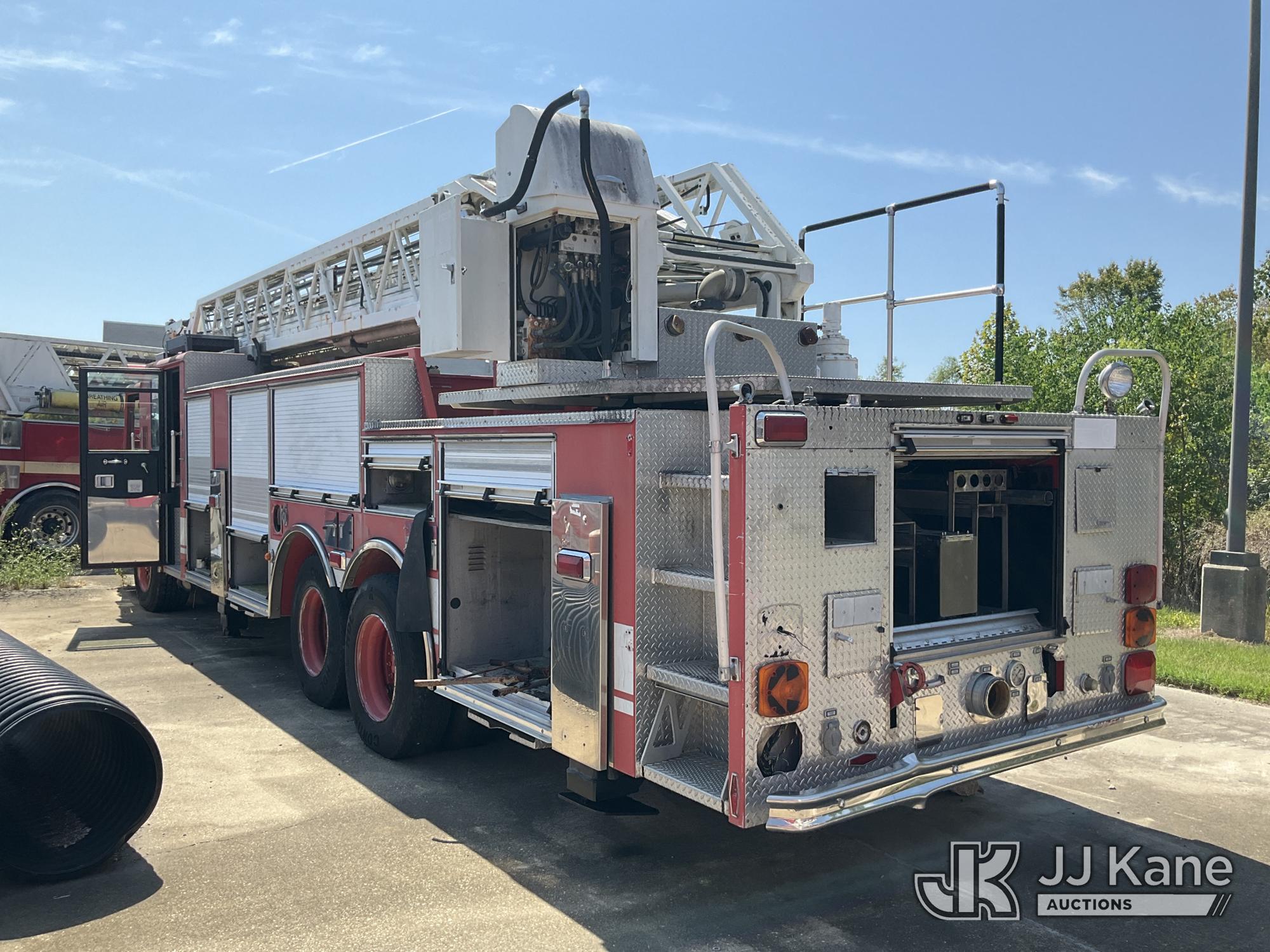 1999 Pierce Model Tilt Cab Ladder Truck/Fire Truck, 12.7L L6 DIESEL Auto, (Exempt from Odometer Disclosure - Reads 69,175 miles) (Not Running, Condition Unknown, Missing Door, Missing Steering Wheel, Missing Various Items, Missing and Broken Glass, No Upper Placard) This is a Titled Item*