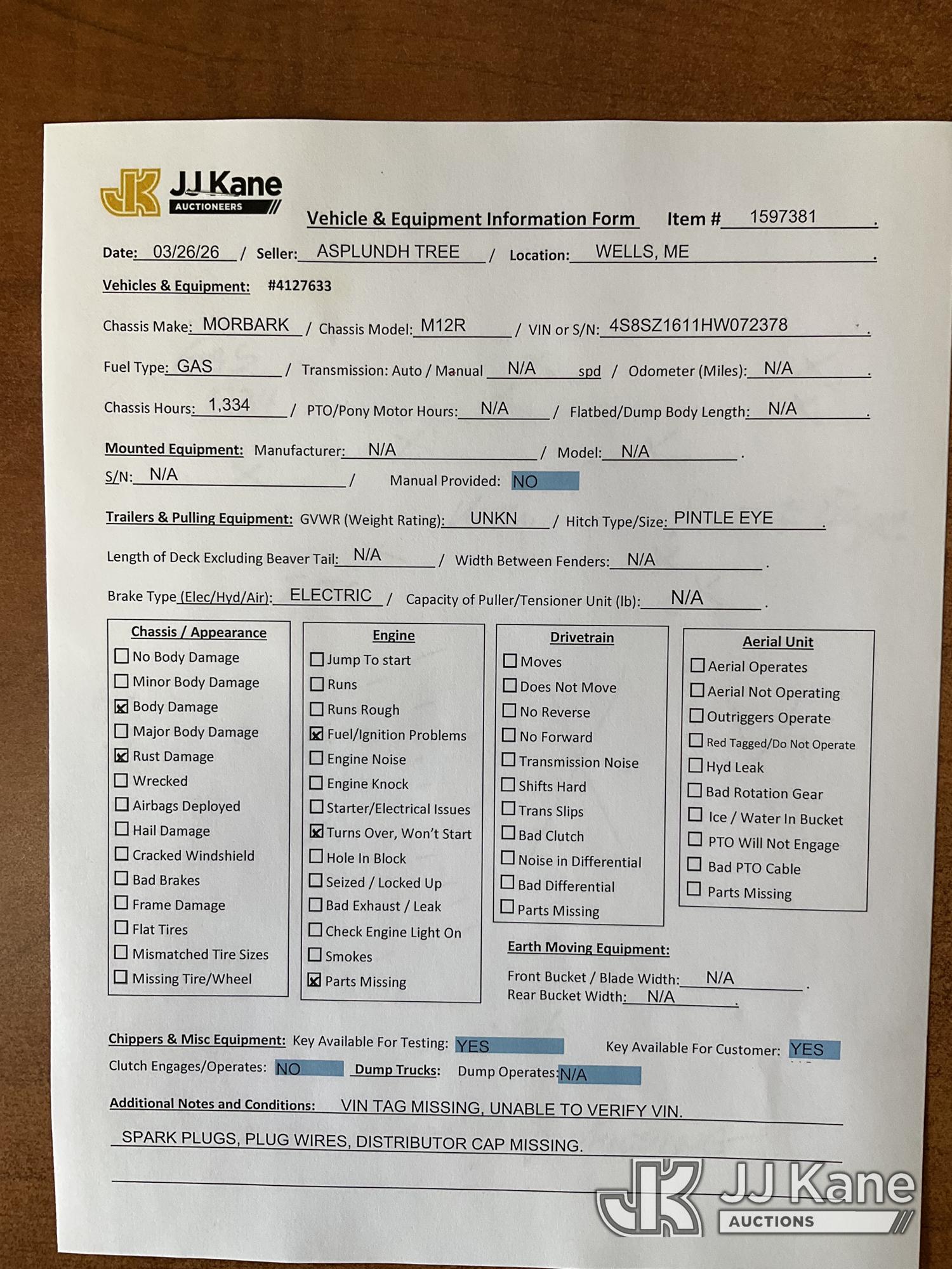 2017 Morbark M12R Chipper (12in Drum), Gas, trailer mtd. (Not Running, Fuel Problems, Turns Over Won't Start, Condition Unknown, Spark Plugs, Plug Wires & Distributor Cap Missing, Rust Damage) (Seller States: Needs coil new battery plugs wires and cap) (Reads 1,334 hours) This is a Titled Item*