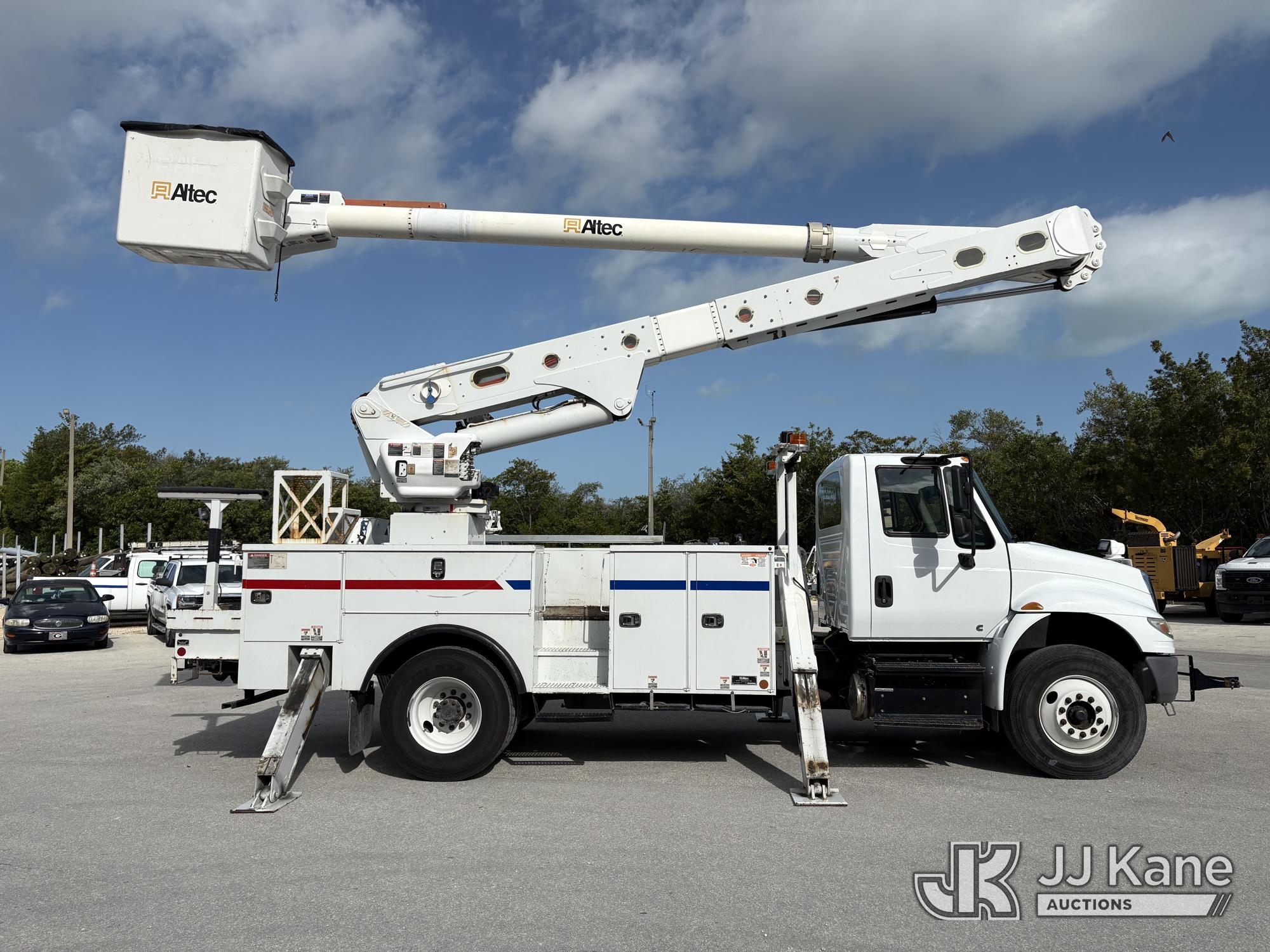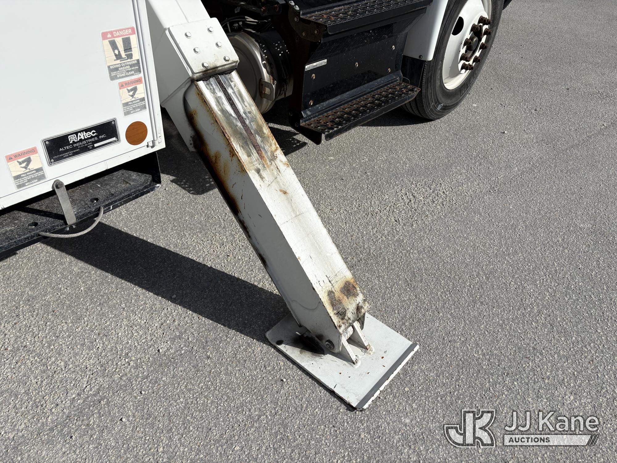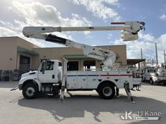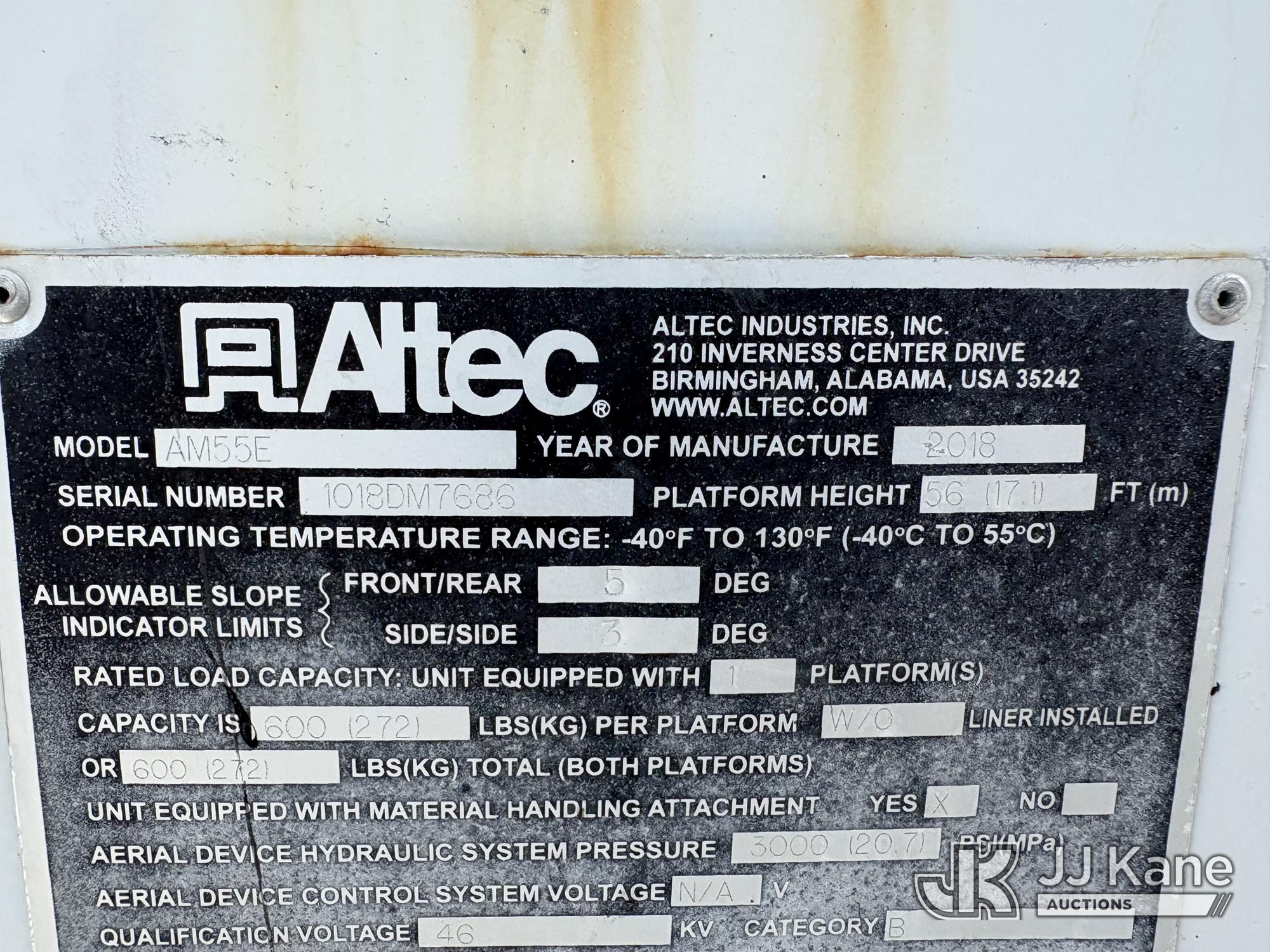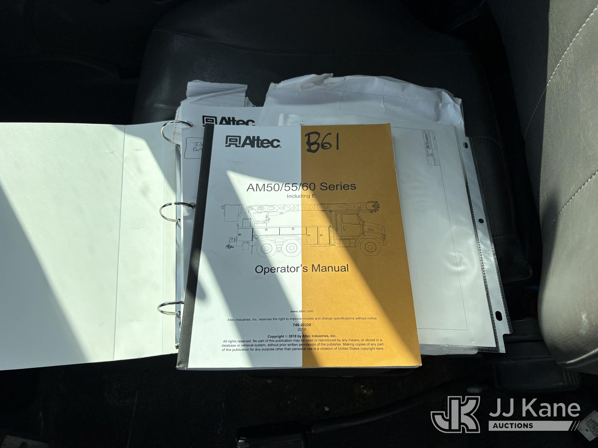 Altec AM55-E, 60 ft, Over-Center Material Handling Bucket Truck s/n 1018DM7686, with two man bucket & 4 hyd outriggers, center mounted on 2019 International 4300 Utility Trailer, Cummins 6.7L Diesel, 4X2, Auto, A/C, (54,203 miles) (Runs, Moves & Upper Operates) (Check Engine Light on.) This is a Titled Item*