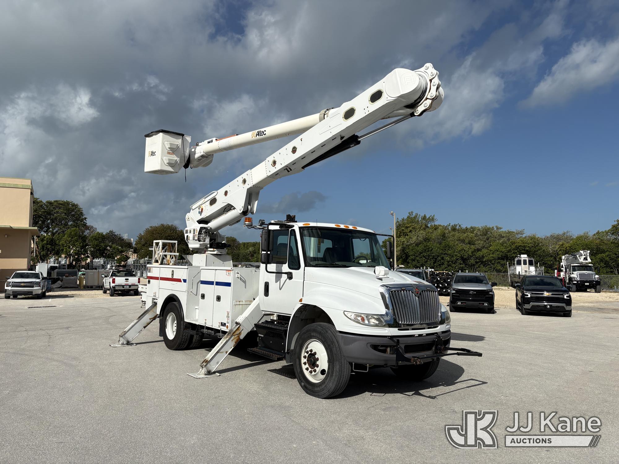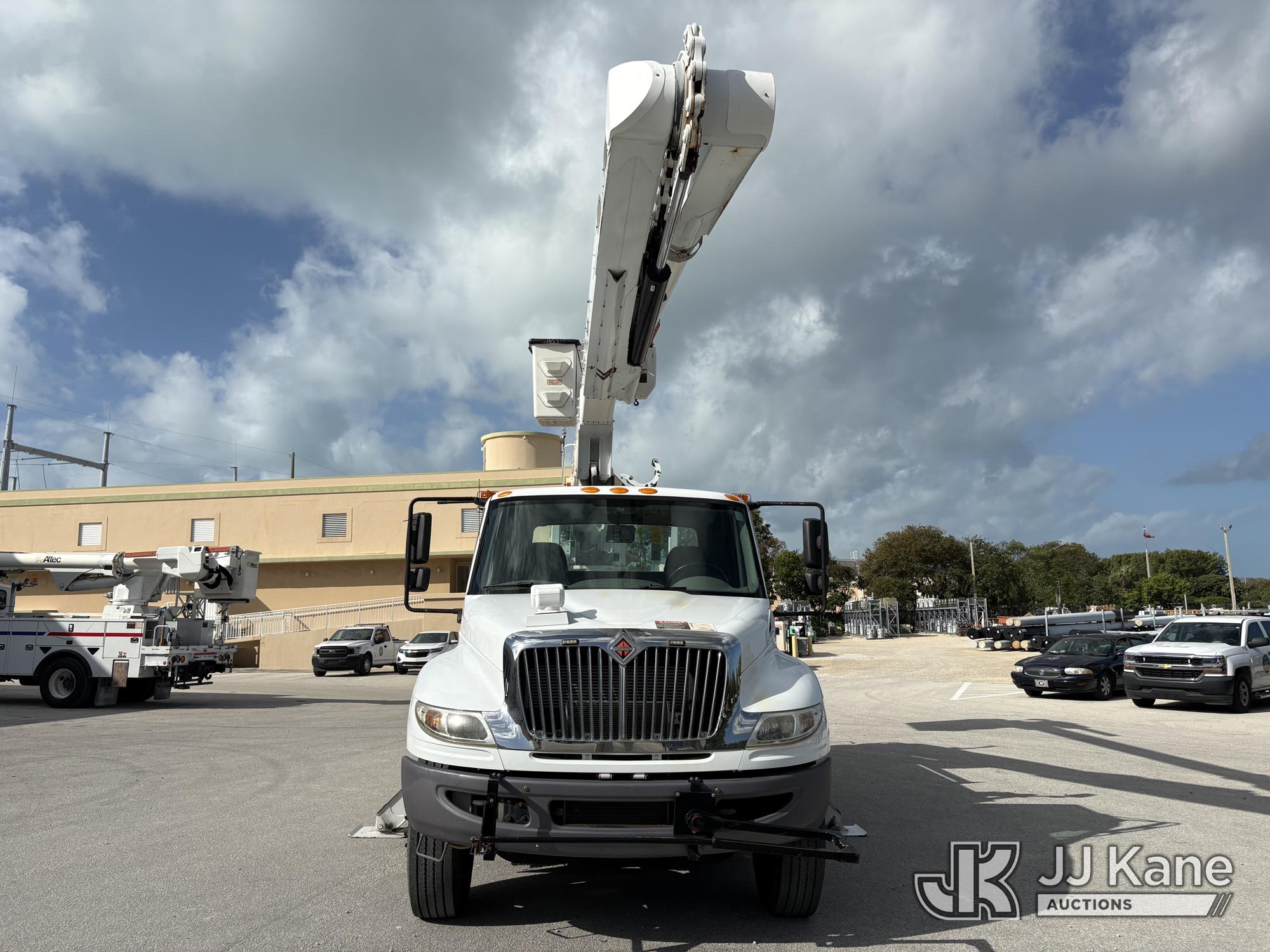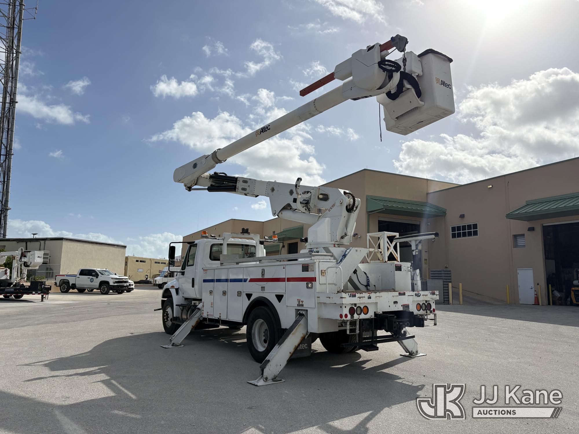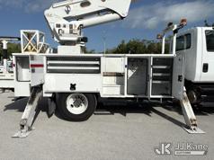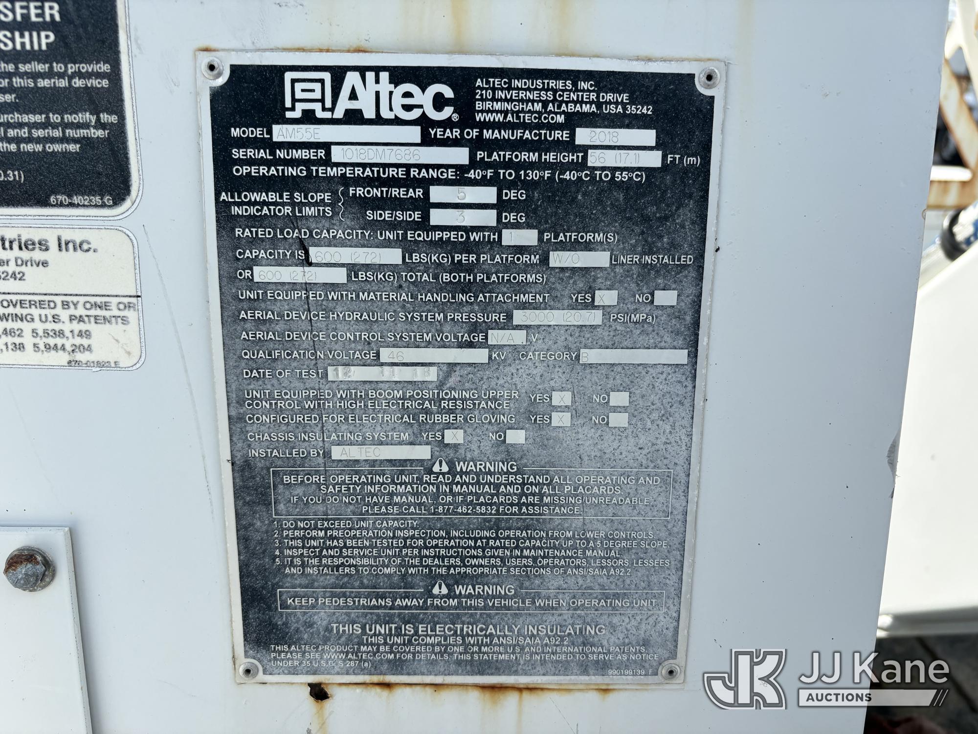 Altec AM55-E, 60 ft, Over-Center Material Handling Bucket Truck s/n 1018DM7686, with two man bucket & 4 hyd outriggers, center mounted on 2019 International 4300 Utility Trailer, Cummins 6.7L Diesel, 4X2, Auto, A/C, (54,203 miles) (Runs, Moves & Upper Operates) (Check Engine Light on.) This is a Titled Item*
