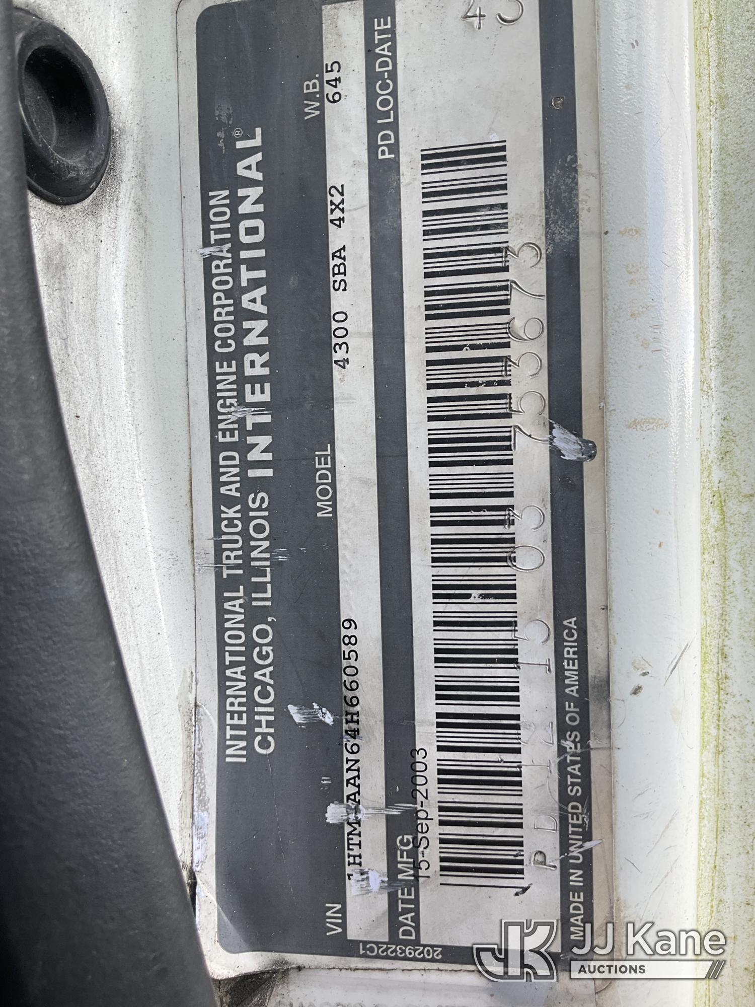 2004 International 4300 Flatbed Truck, 7.6L L6 Diesel, 4X2, Auto, A/C, with PVC tank, (Exempt from Odometer Disclosure - Reads 332,738 miles (unverified)) (Not Running, Turns Over, Condition Unknown) This is a Titled Item*