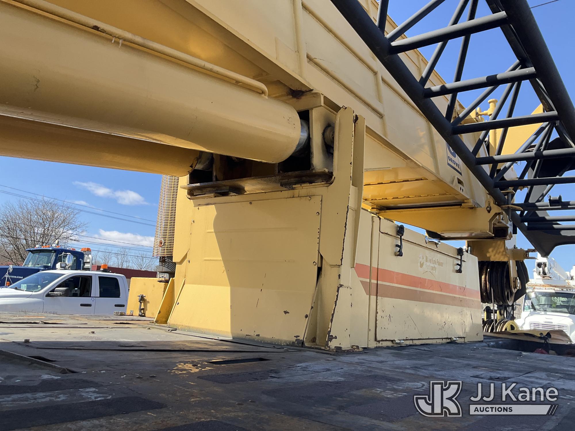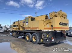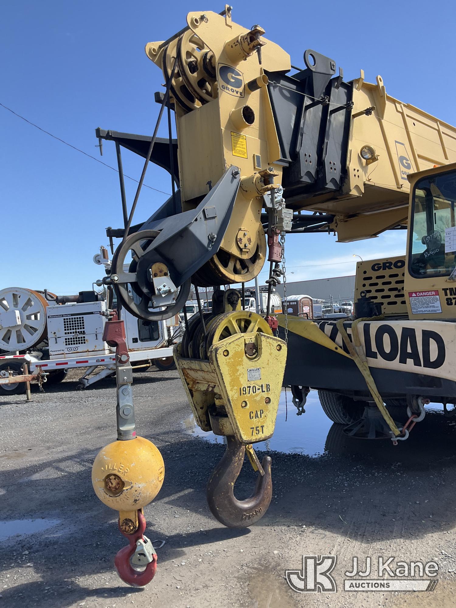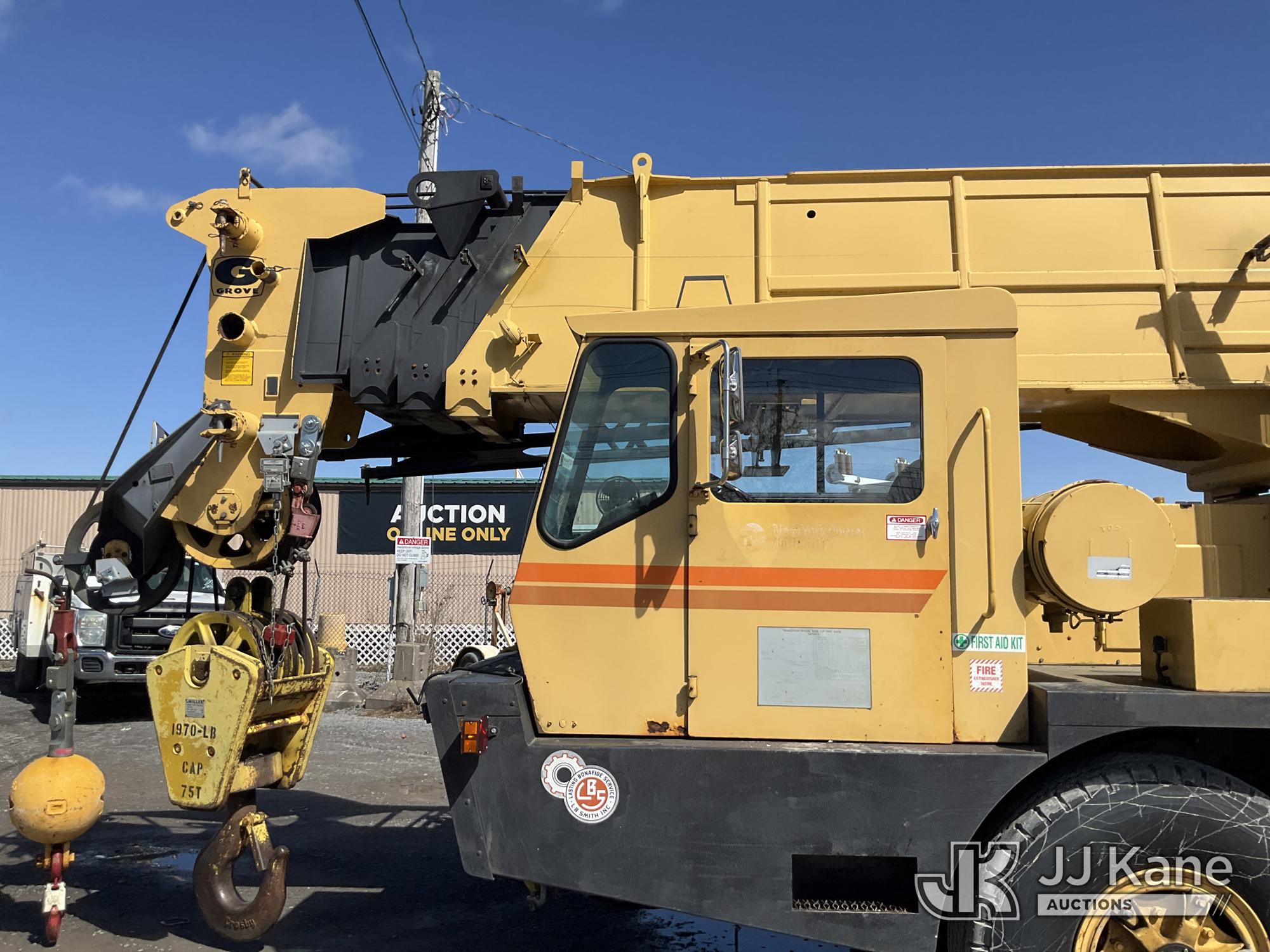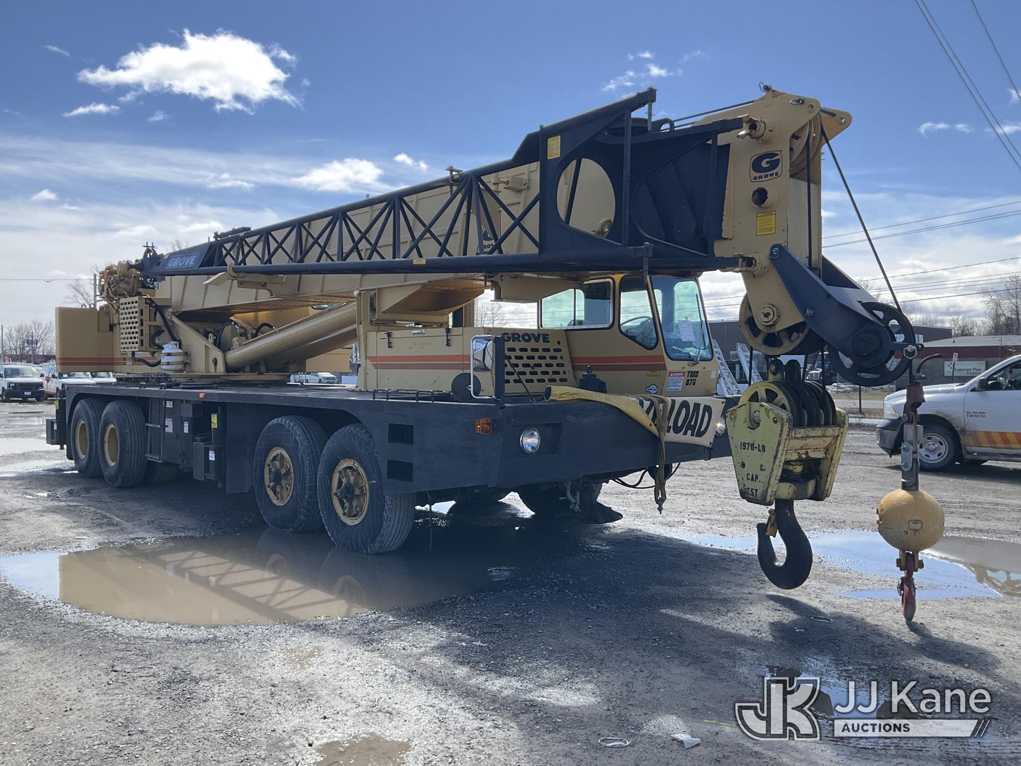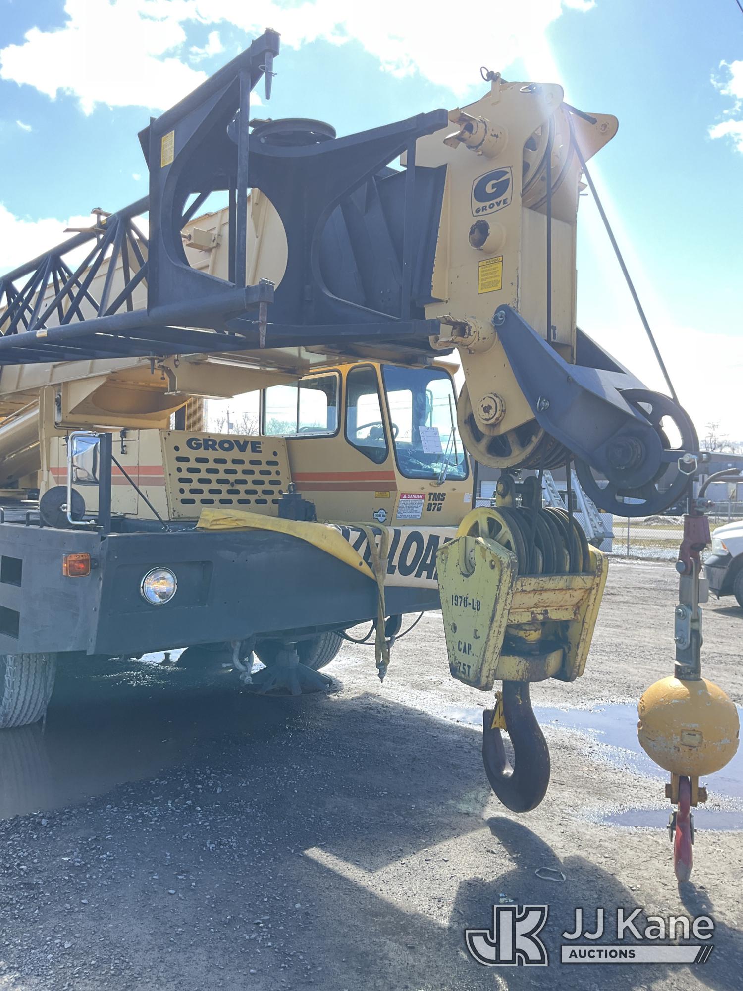 Grove TMS875, 75-Ton Hydraulic Crane s/n 68205, with 36-144 ft Hyd Boom, 32 ft Swing-Away Lattice Jib, Main & Aux Winches, Miller 75-Ton Hook Block, Miller 10-Ton Headache Ball, LSI Robway GS820 Load Management system, Anti-Two Block System & 5 Outriggers, mounted on 1985 Grove 8475G T/A Carrier, s/n LN1PP28003AW, Cummins diesel, 9-spd, with Jacobs Engine Brake, Tandem Front Steering Axles, (1) Spare Tire, (Exempt from Odometer Disclosure - Reads 5,760 miles) (Runs & Moves, Seller States In Operating Condition, (NYS Transferable Registration Only)) (Reads 3,397 hours)*