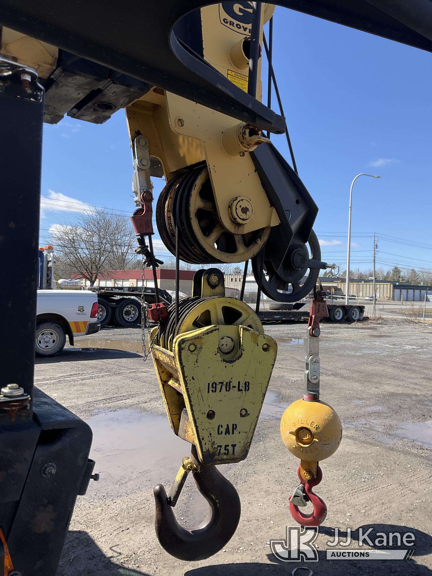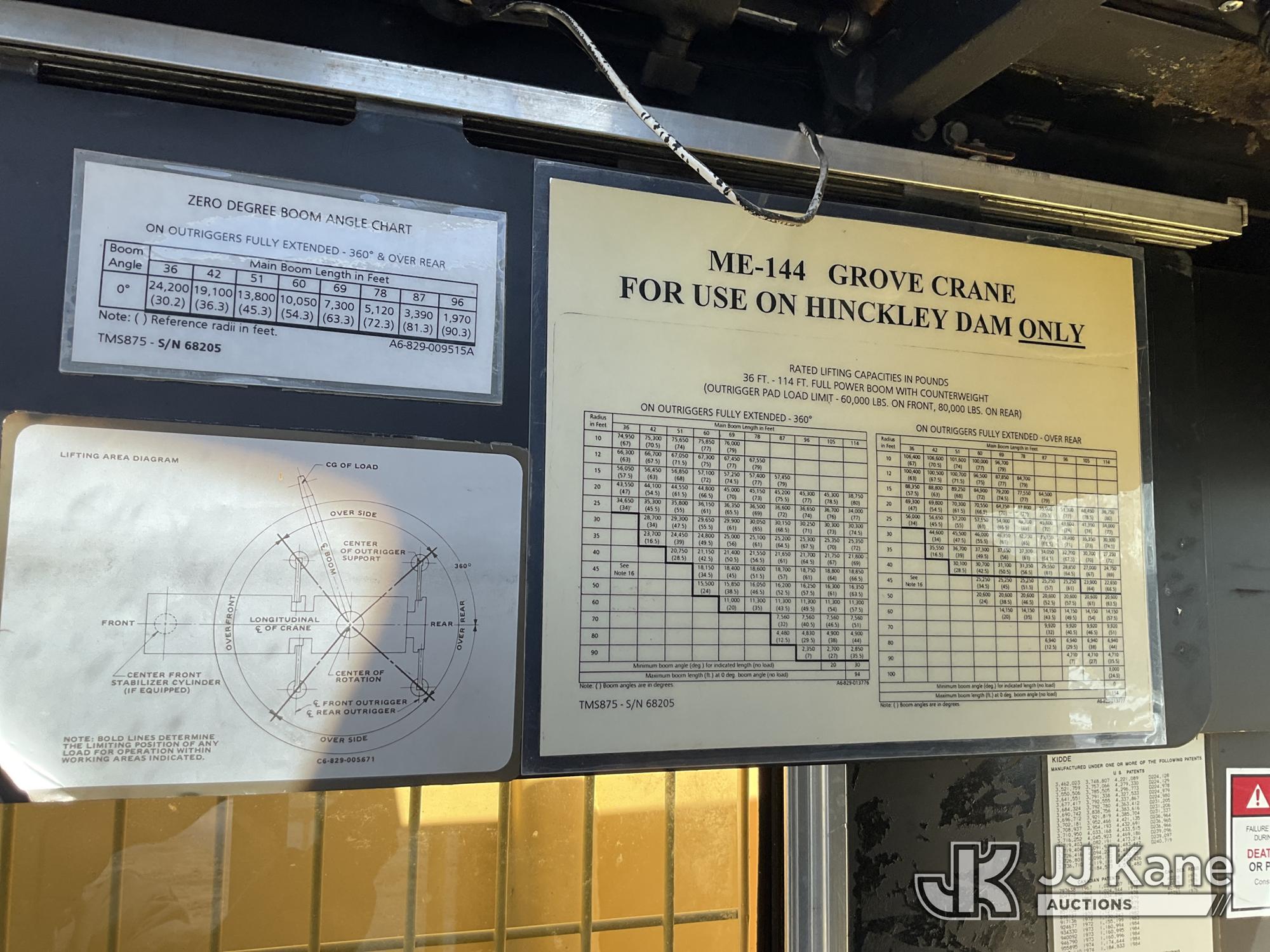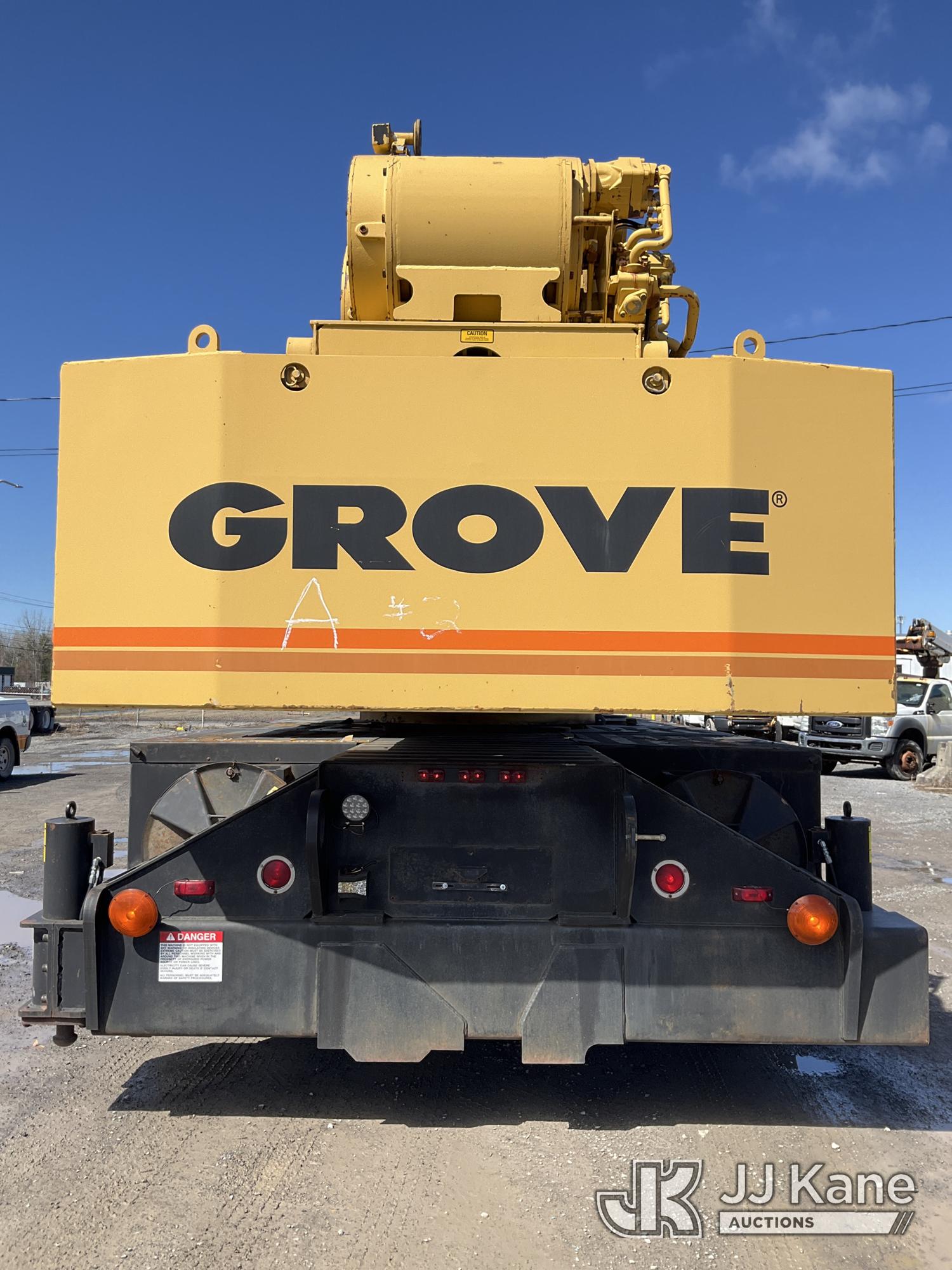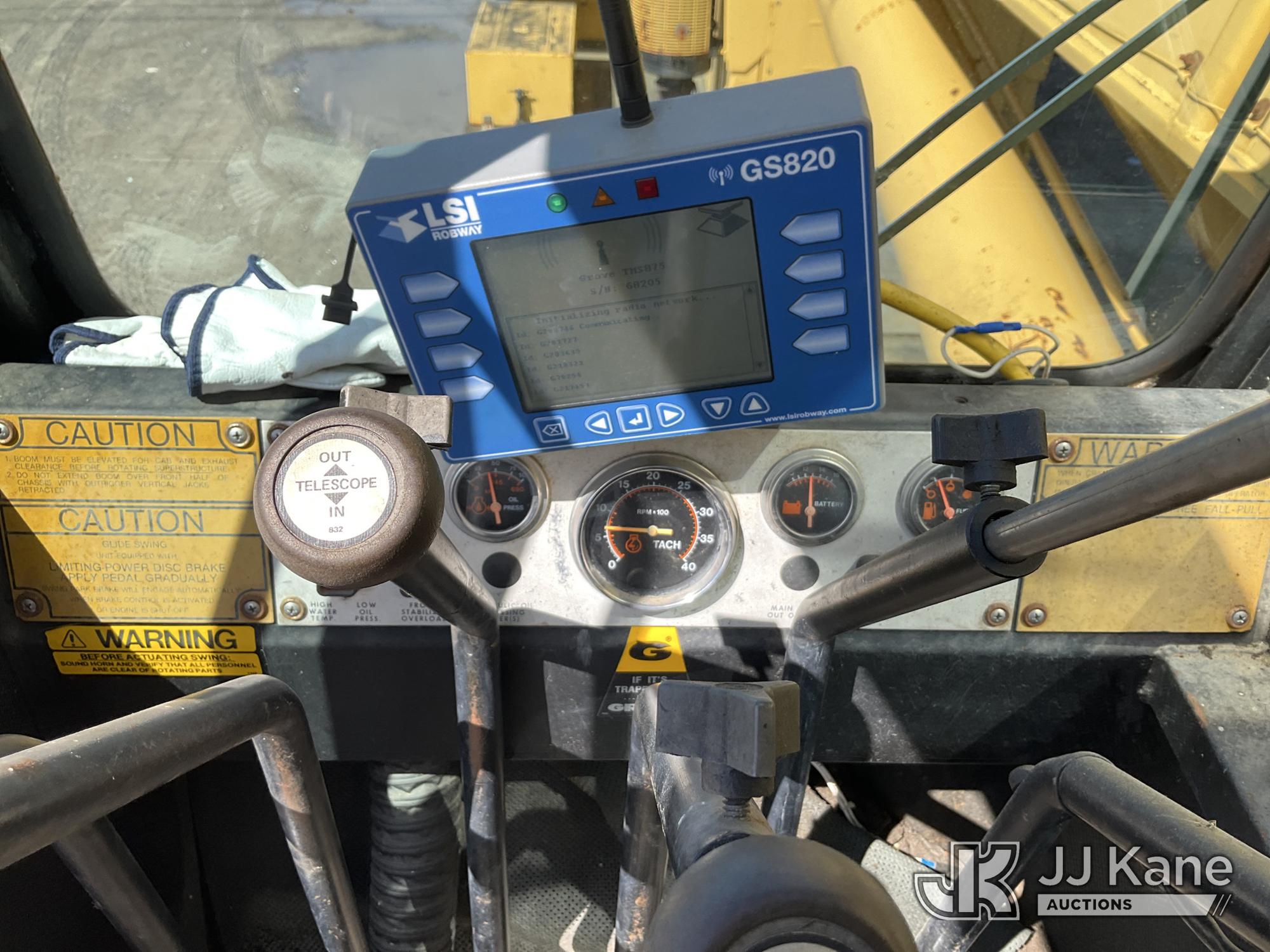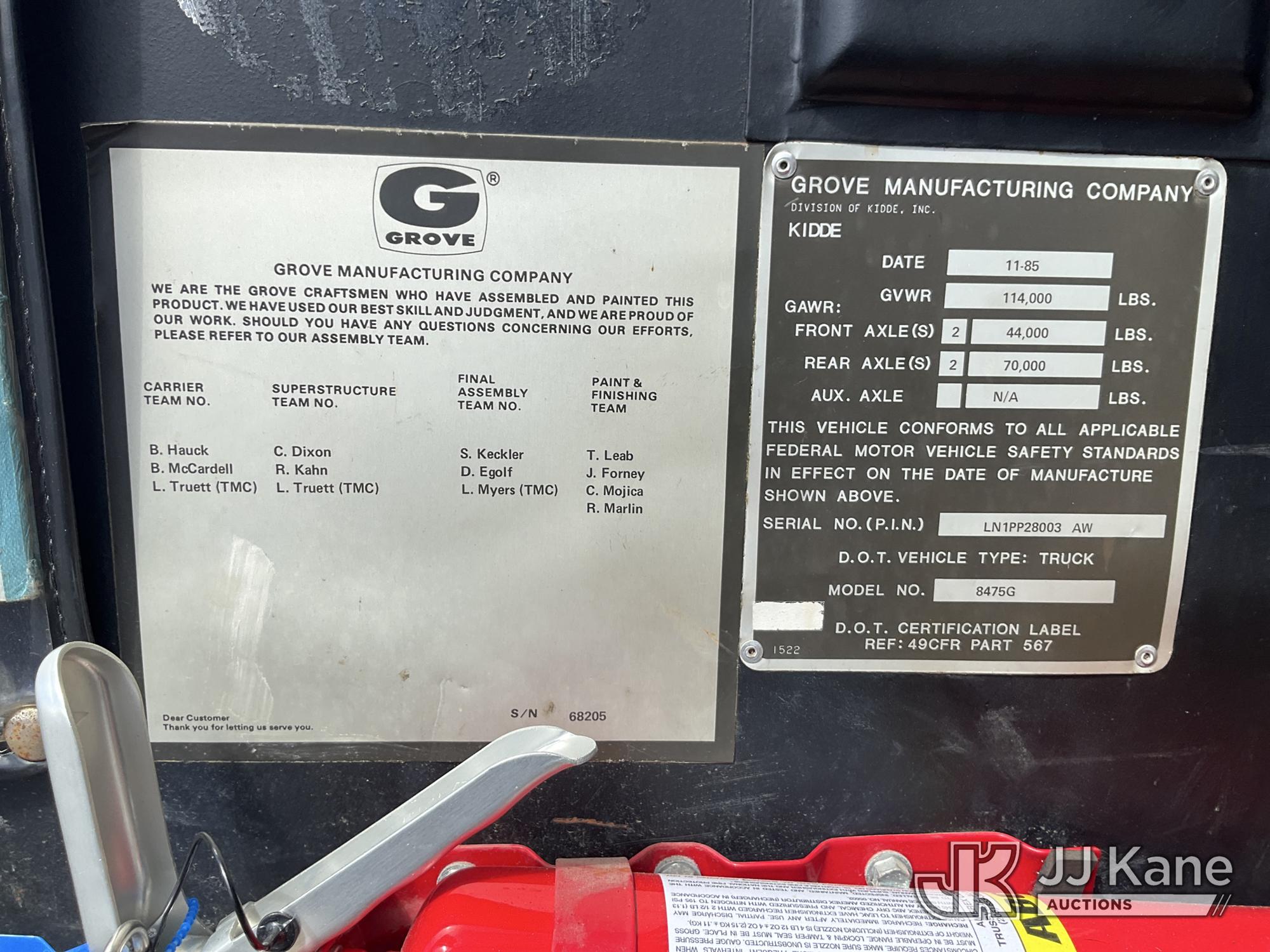 Grove TMS875, 75-Ton Hydraulic Crane s/n 68205, with 36-144 ft Hyd Boom, 32 ft Swing-Away Lattice Jib, Main & Aux Winches, Miller 75-Ton Hook Block, Miller 10-Ton Headache Ball, LSI Robway GS820 Load Management system, Anti-Two Block System & 5 Outriggers, mounted on 1985 Grove 8475G T/A Carrier, s/n LN1PP28003AW, Cummins diesel, 9-spd, with Jacobs Engine Brake, Tandem Front Steering Axles, (1) Spare Tire, (Exempt from Odometer Disclosure - Reads 5,760 miles) (Runs & Moves, Seller States In Operating Condition, (NYS Transferable Registration Only)) (Reads 3,397 hours)*