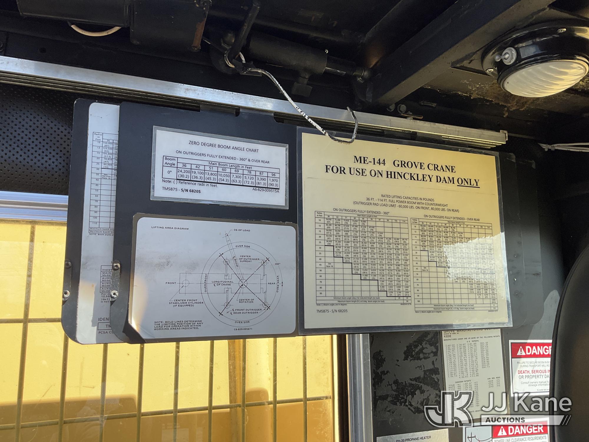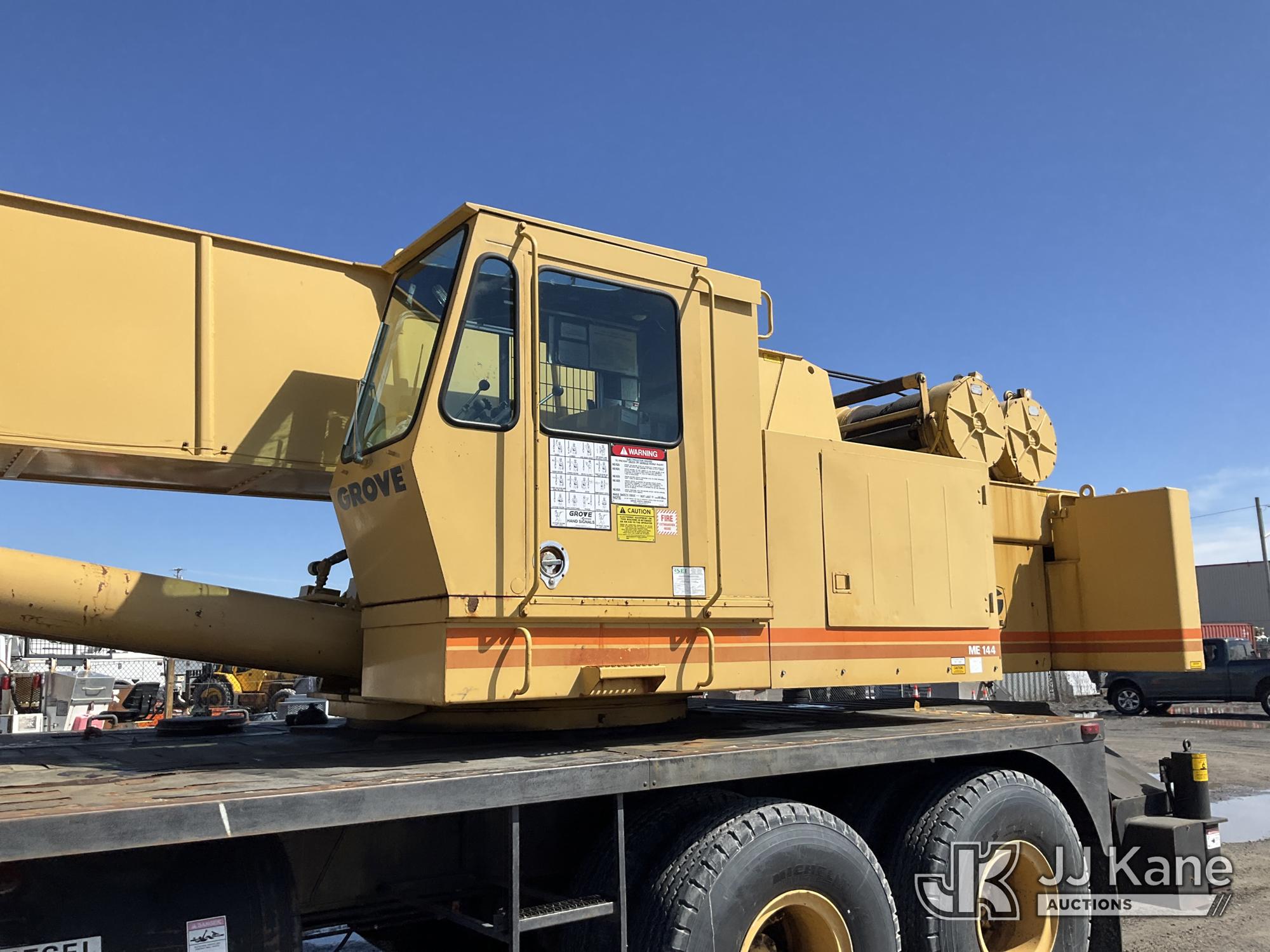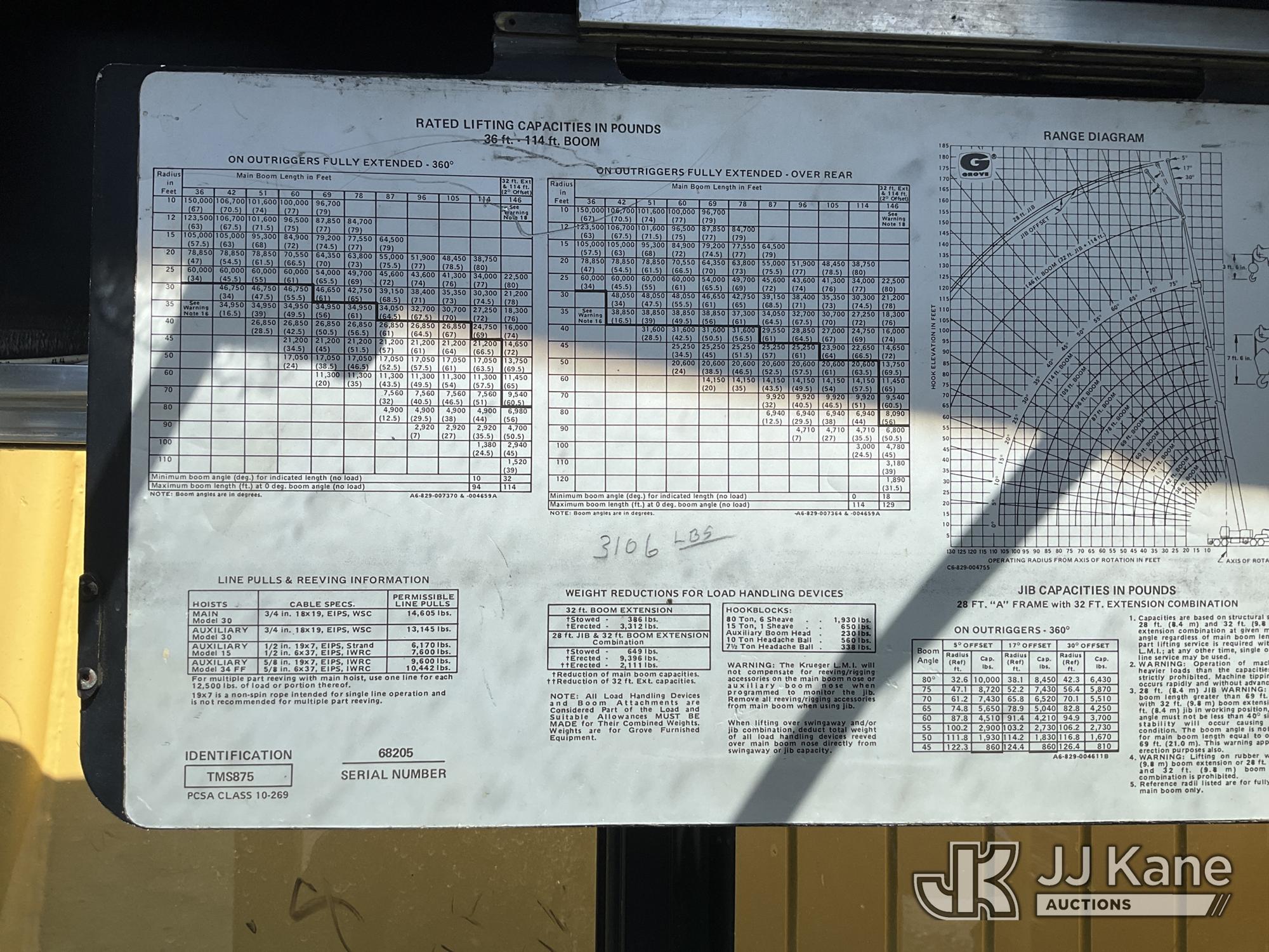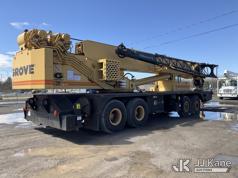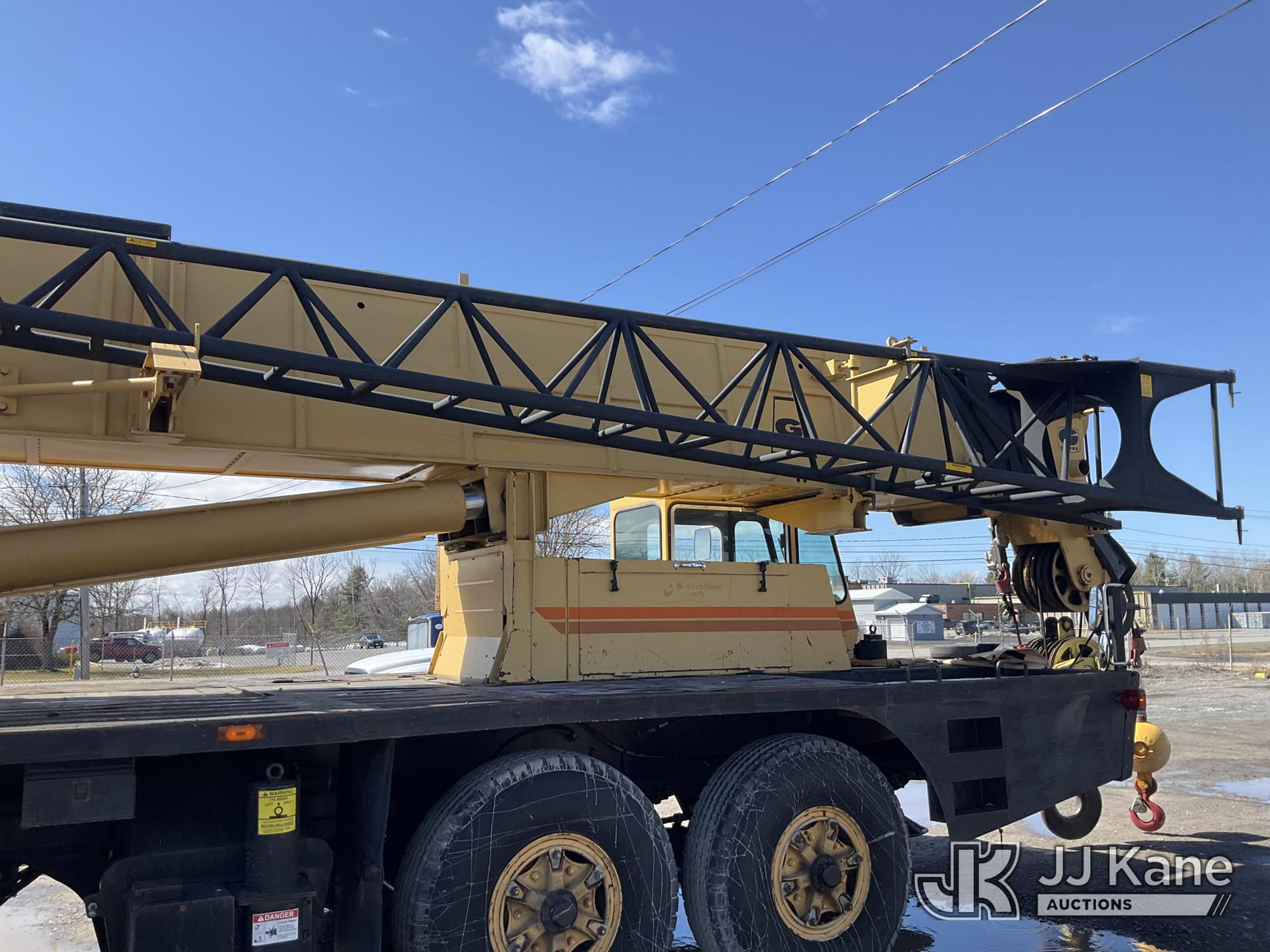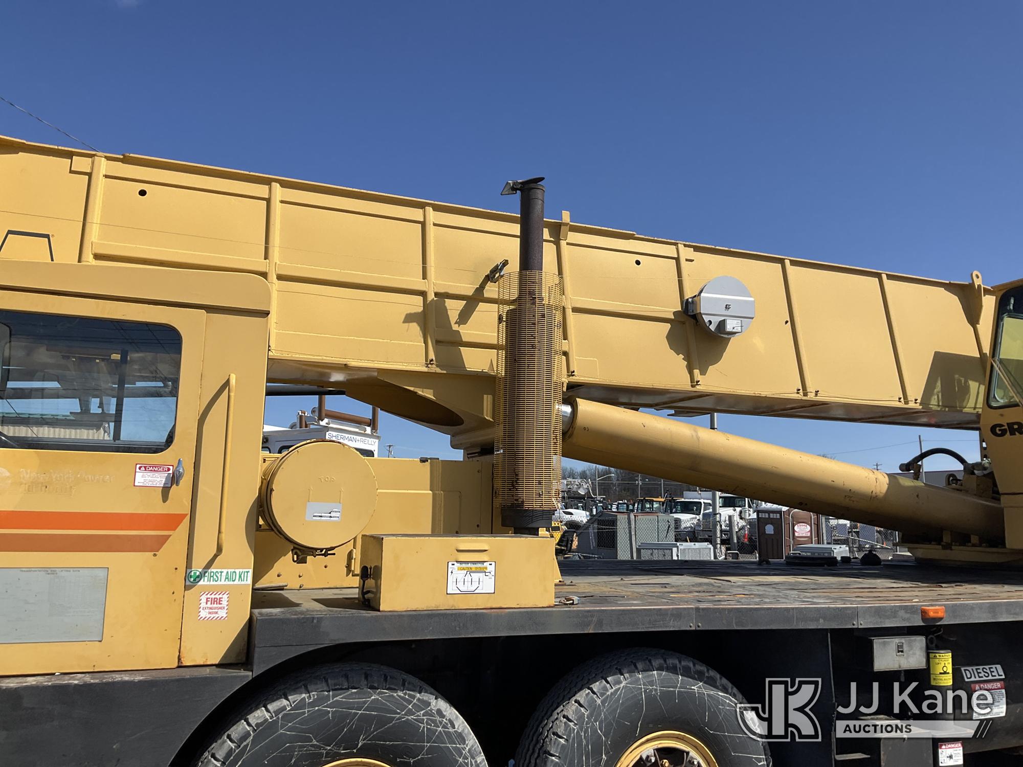 Grove TMS875, 75-Ton Hydraulic Crane s/n 68205, with 36-144 ft Hyd Boom, 32 ft Swing-Away Lattice Jib, Main & Aux Winches, Miller 75-Ton Hook Block, Miller 10-Ton Headache Ball, LSI Robway GS820 Load Management system, Anti-Two Block System & 5 Outriggers, mounted on 1985 Grove 8475G T/A Carrier, s/n LN1PP28003AW, Cummins diesel, 9-spd, with Jacobs Engine Brake, Tandem Front Steering Axles, (1) Spare Tire, (Exempt from Odometer Disclosure - Reads 5,760 miles) (Runs & Moves, Seller States In Operating Condition, (NYS Transferable Registration Only)) (Reads 3,397 hours)*