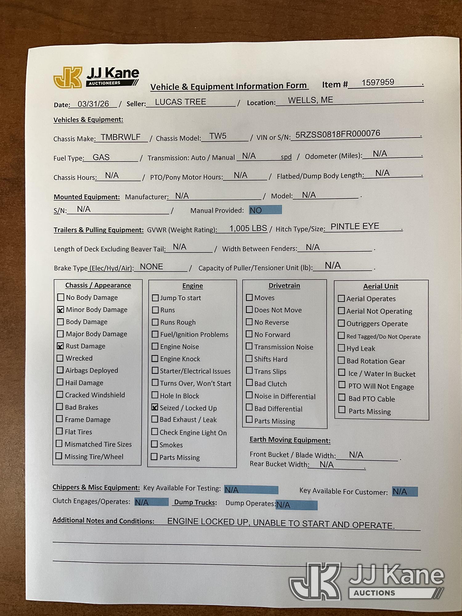 2007 Timberwolf TW-5 Portable Log Splitter, s/n 5RZSS0818FR000076, gas (No Title) (Bad Engine, Not Running) (Removal is by Appointment Only, Buyer MUST make a appointment prior to picking up, Buyer/Transporter Must have PAID IN FULL RELEASE. No onsite assistance available, Please Come prepared.)*