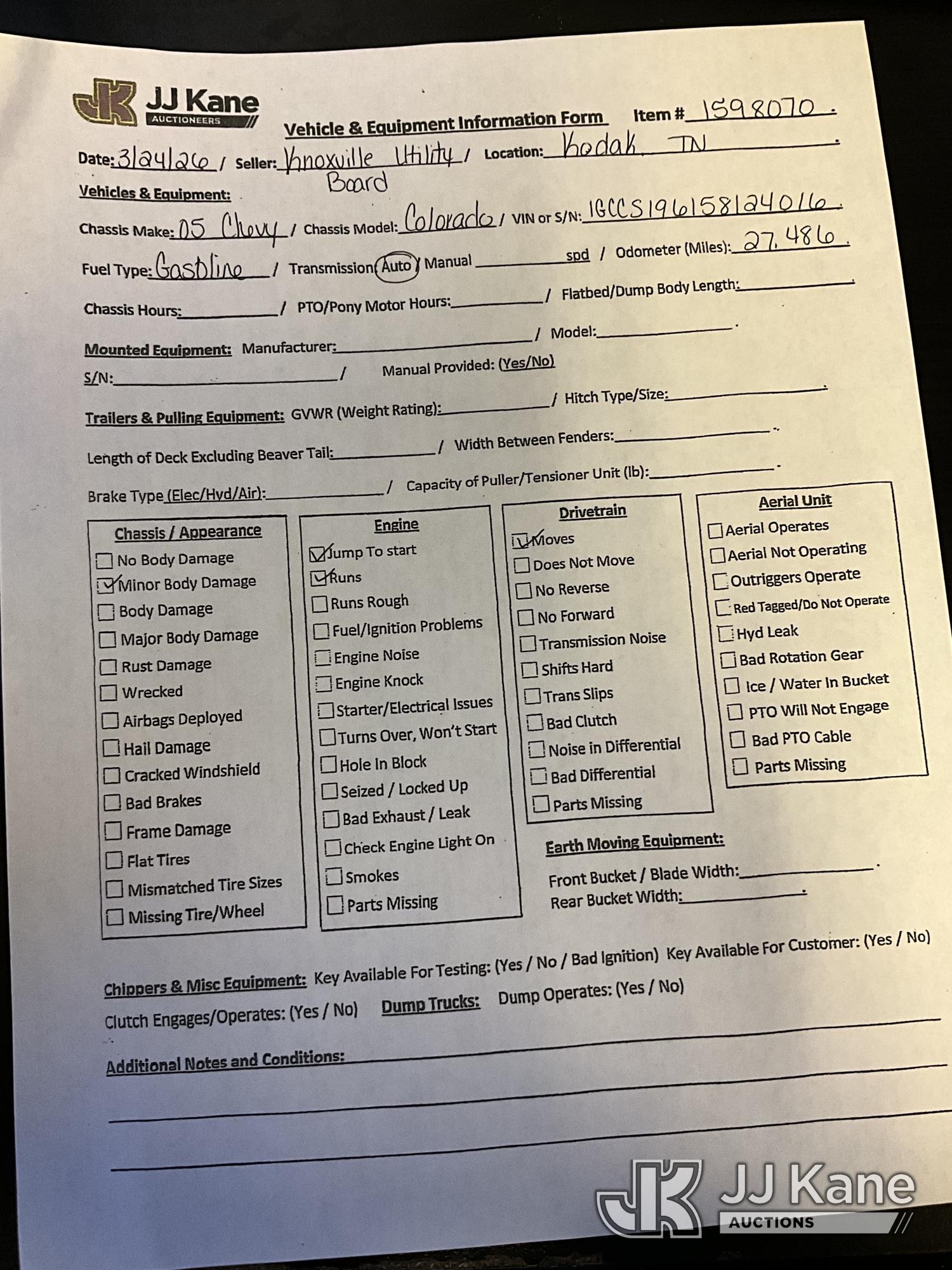 2005 Chevrolet Colorado Extended-Cab Pickup Truck, 5-cyl gas, RWD, Auto, A/C, (Exempt from Odometer Disclosure - Reads 27,486 miles) (Runs & Moves) (Jump To Start, Minor Body Damage) This is a Titled Item*