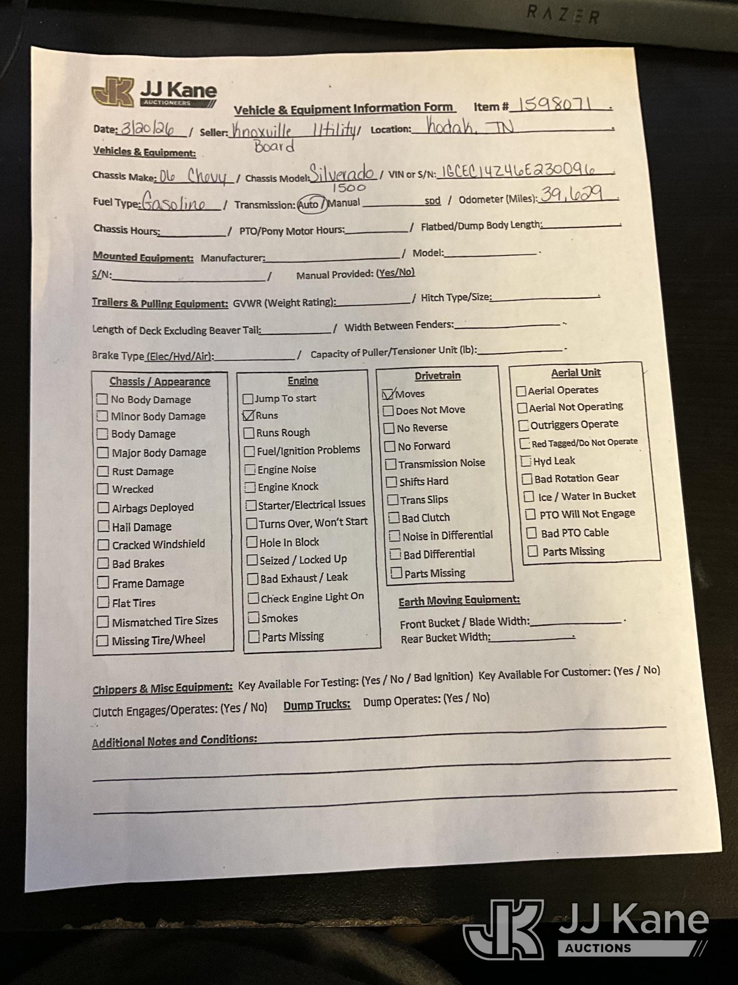 2006 Chevrolet Silverado 1500 Pickup Truck, 8-cyl gas, RWD, Auto, A/C, (Exempt from Odometer Disclosure - Reads 39,629 miles) (Runs & Moves) This is a Titled Item*