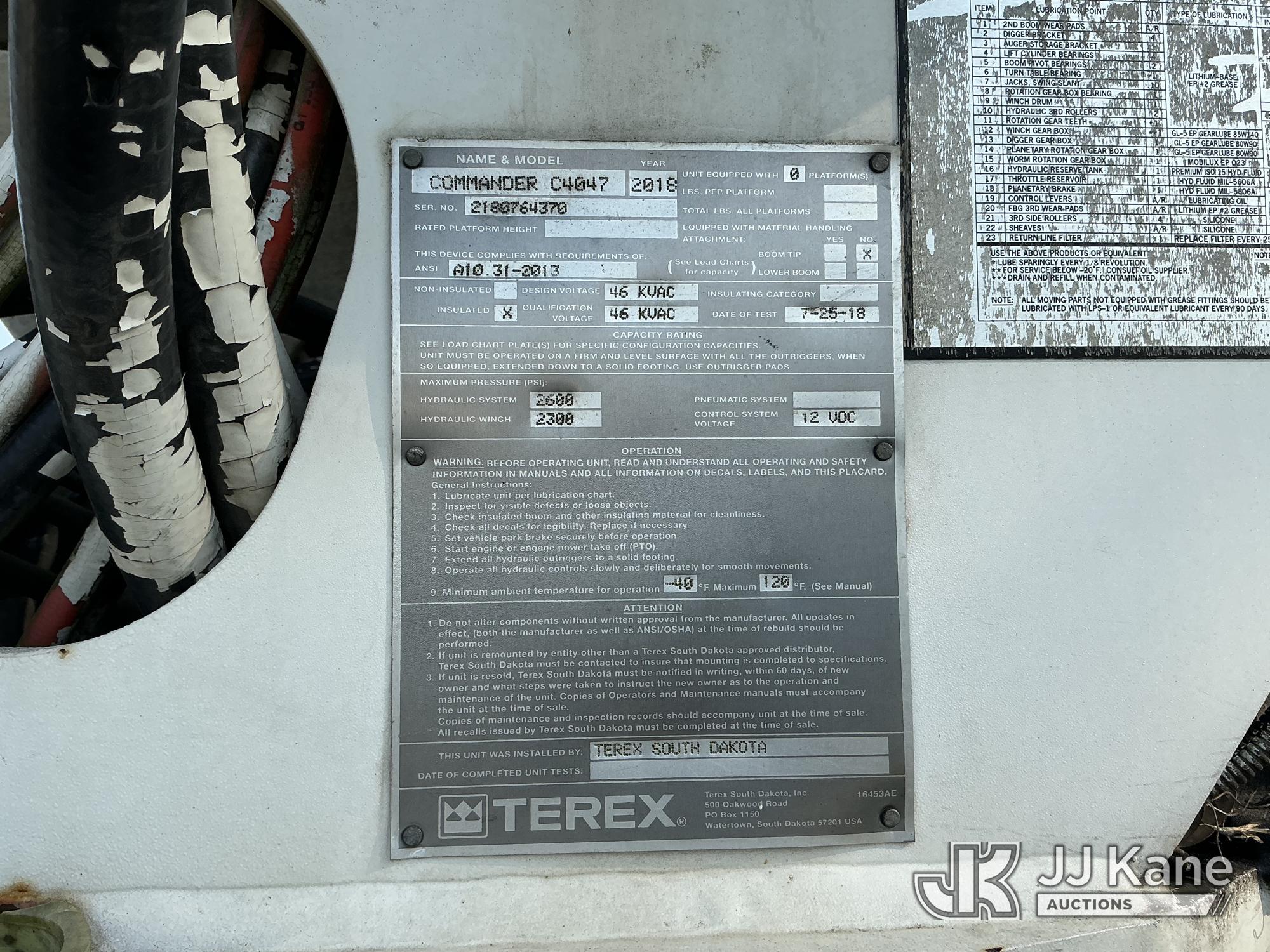 Terex Commander C4047, 23,660 Lb Digger Derrick s/n 2180764370, with 47 ft. sheave height, 3 section hyd boom, 2 spd digger, heel winch, pole guides, riding console & 4 hyd outriggers, rear mounted on 2019 Freightliner M2 4x4 Utility Truck, Cummins 6.7L diesel, Auto, A/C, with front winch, (69,569 miles) (Runs, Moves, Upper Operates) (Reads 6,019 hours) This is a Titled Item*