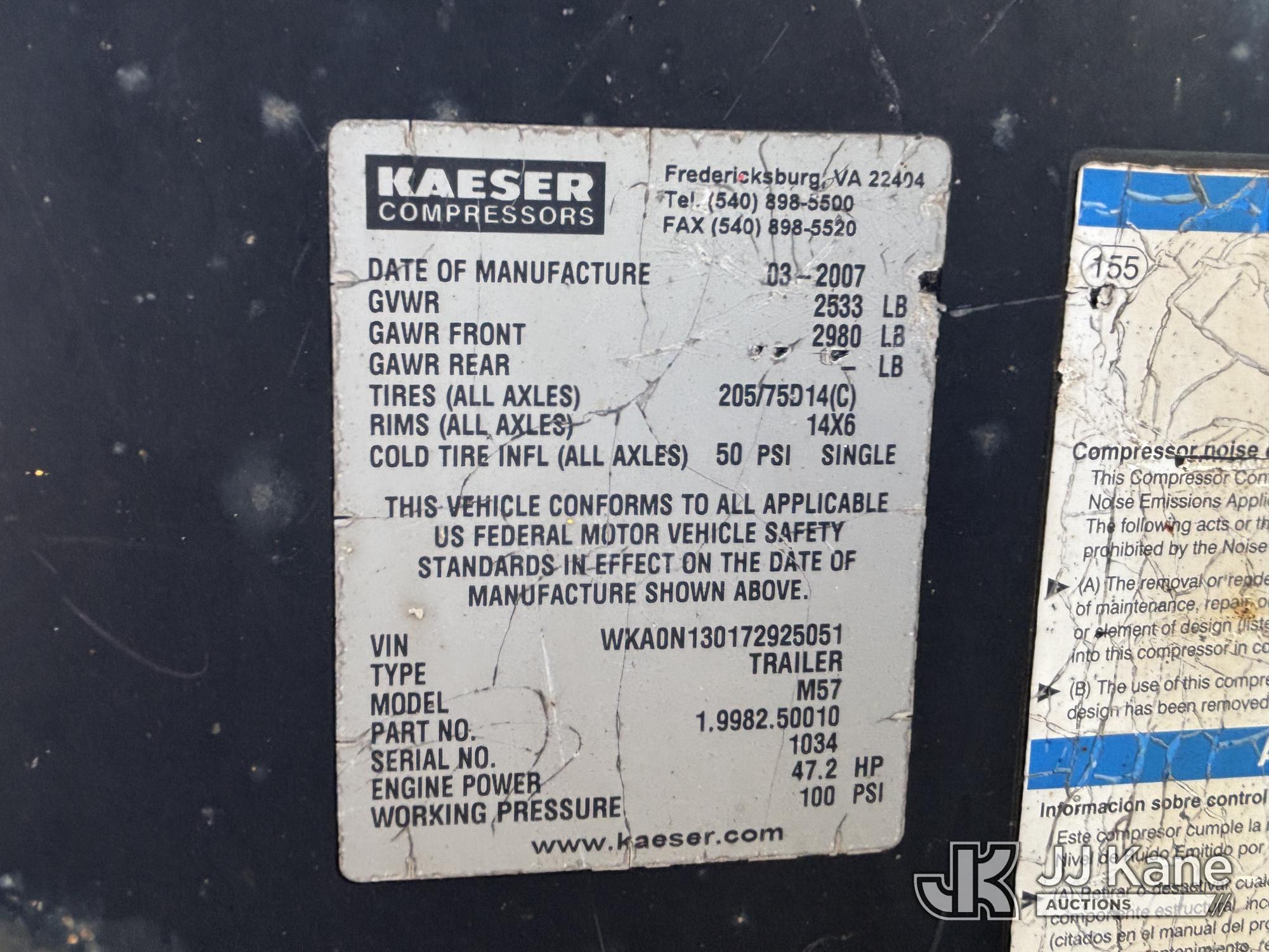 2007 Kubota M57 Air Compressor, s/n WKA0N130172925051, 4-cyl, Diesel, with Battery Disconnect Switch, (Runs & Builds Air, Dings & Dents, Wear & Tear) (Reads 1,065 hours)*