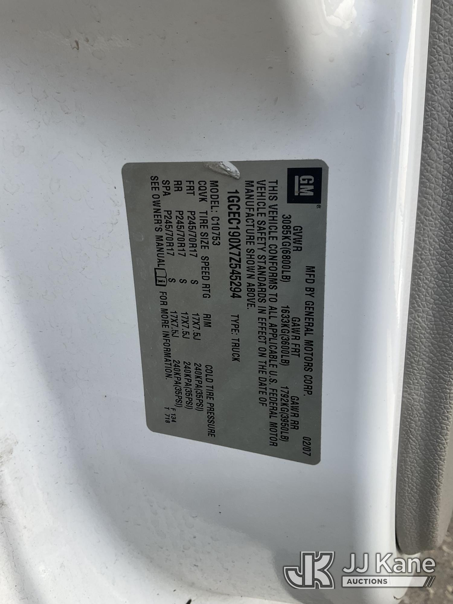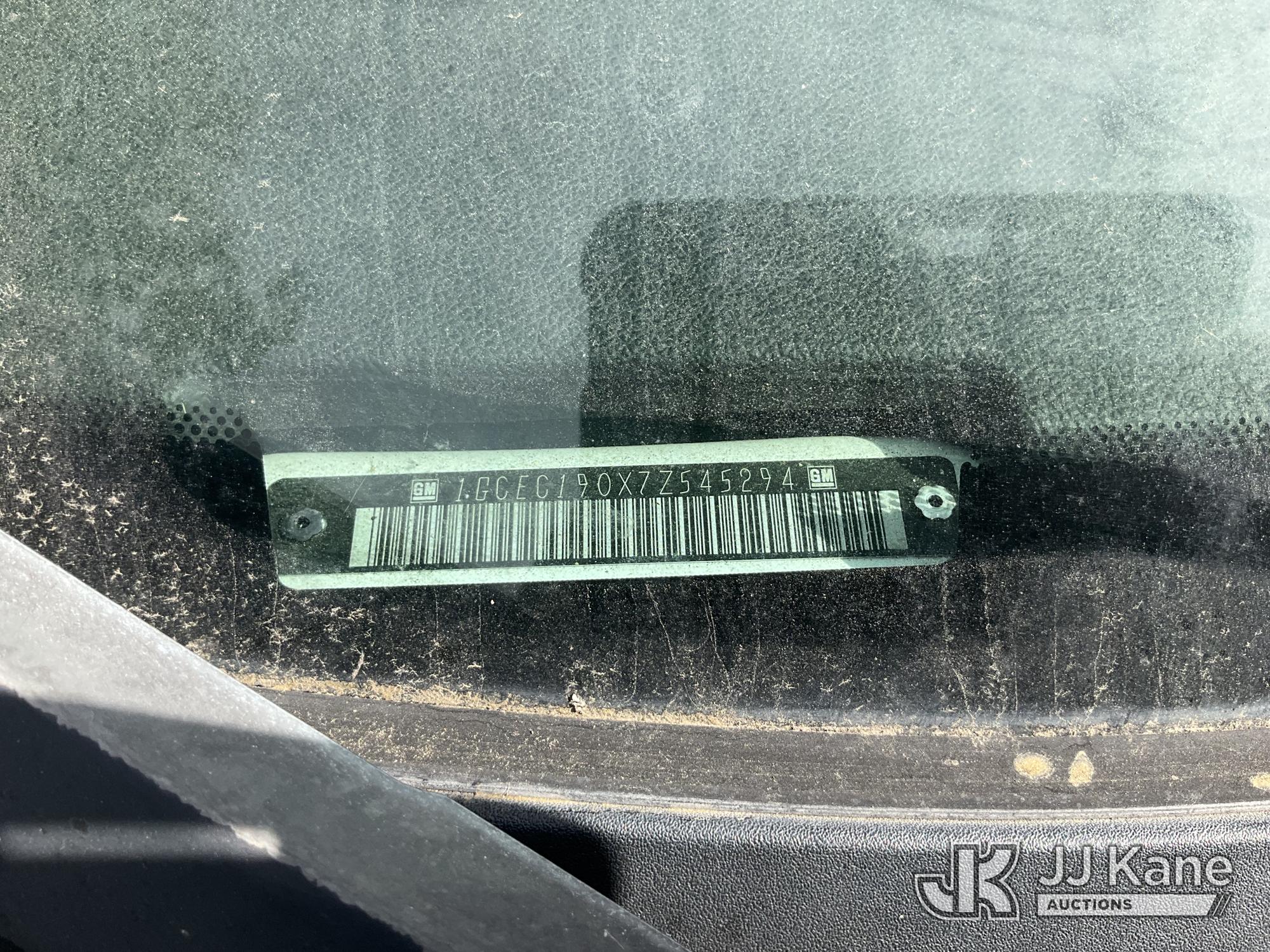 2007 Chevrolet Silverado 1500 Extended-Cab Pickup Truck, s/n 1GCEC190X7Z545294, 5.3L V8 OHV 16V RWD, FFV, 4-Speed Automatic, A/C, with Arrow stick arrow board, safety light, 2 tool boxes, tow package, (105,895 miles) (Runs & Moves)(Driver Door Jammed-Hard To Close, Paint Damage) This is a Titled Item*