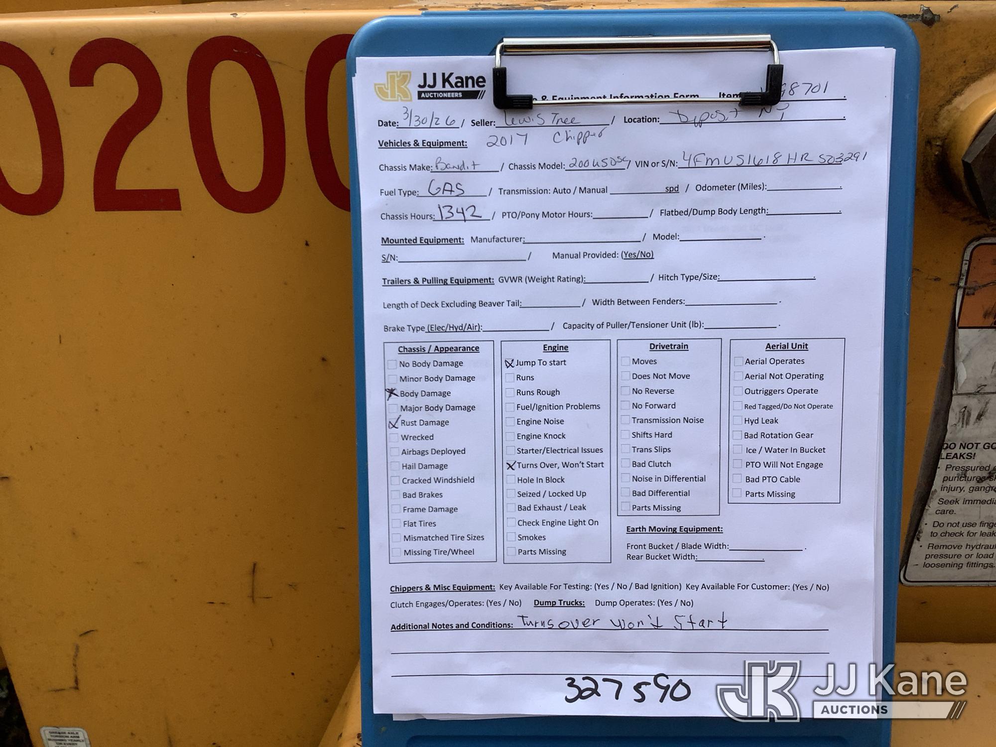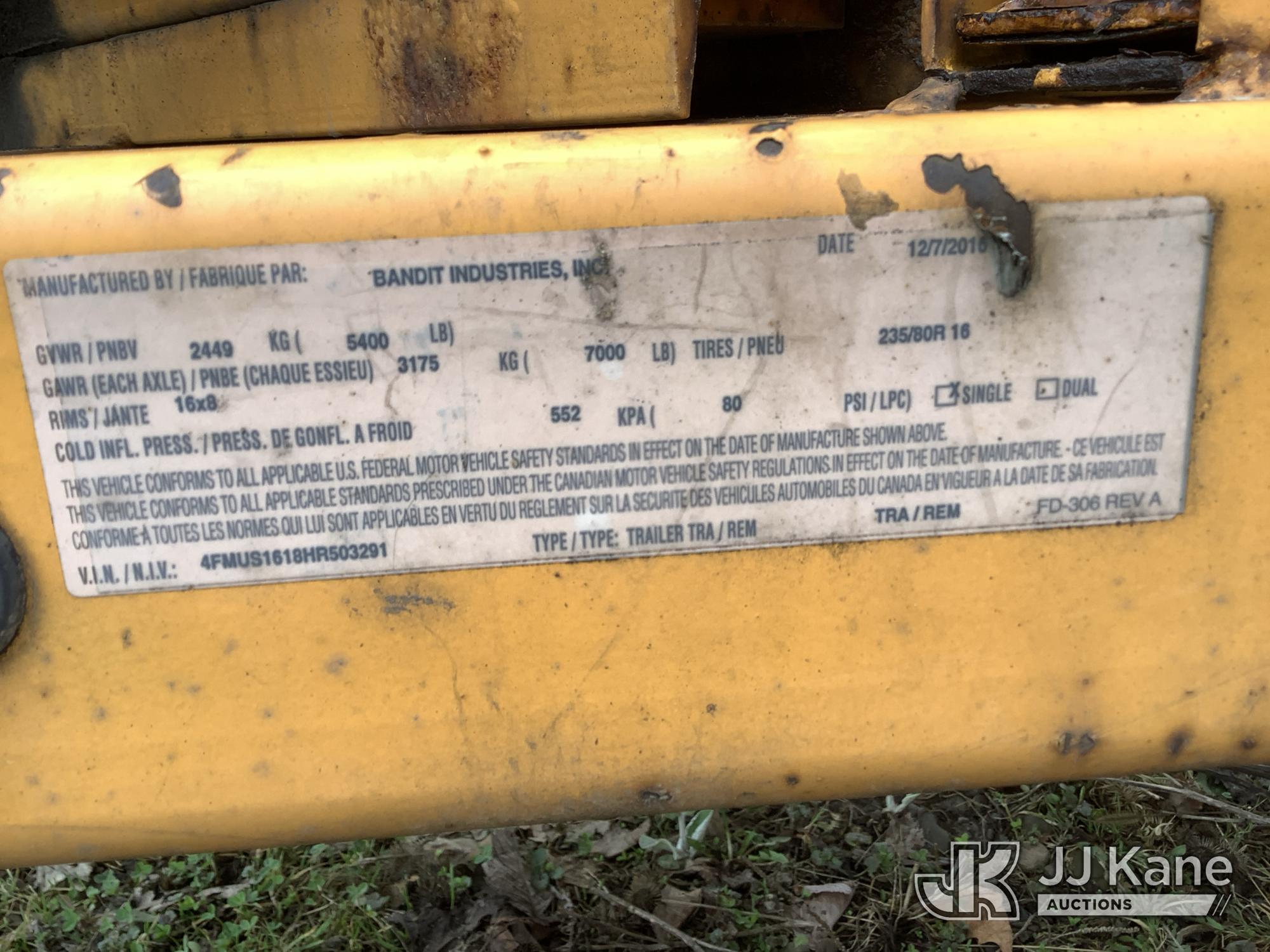 2017 Bandit Industries 200XP Portable Chipper (12in Disc), s/n 4FMUS1618HR503291, 4-cyl gas, Trailer Mounted (No Title) ( Not Running, Condition Unknown) (Reads 1,342 hours)*
