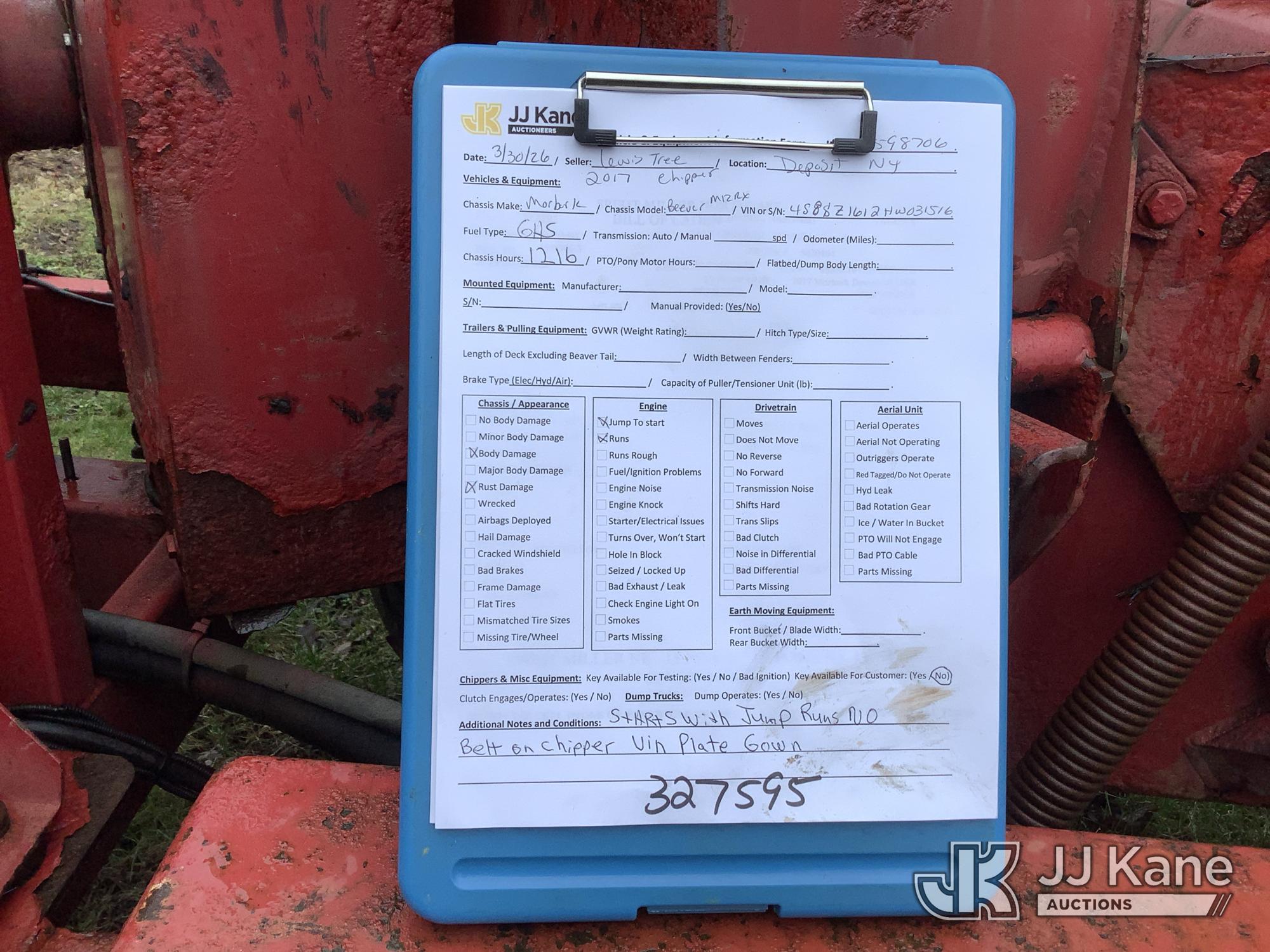 2017 Morbark Beever M12RX Portable Chipper (12in Drum), 4-cyl gas, Trailer Mounted (No Title) (Runs, Jump to Start) (Removal is by Appointment Only, Buyer MUST make a appointment prior to picking up, Buyer/Transporter Must have PAID IN FULL RELEASE. No onsite assistance available, Please Come prepared.) (Reads 1,216 hours) This is a Titled Item*