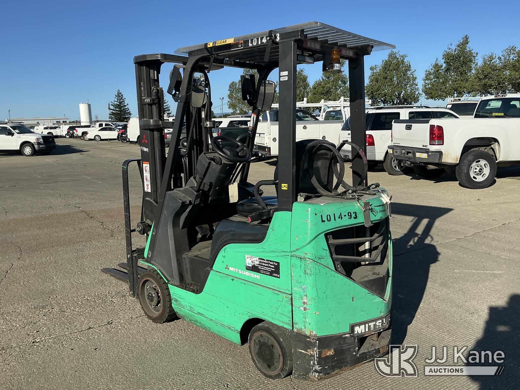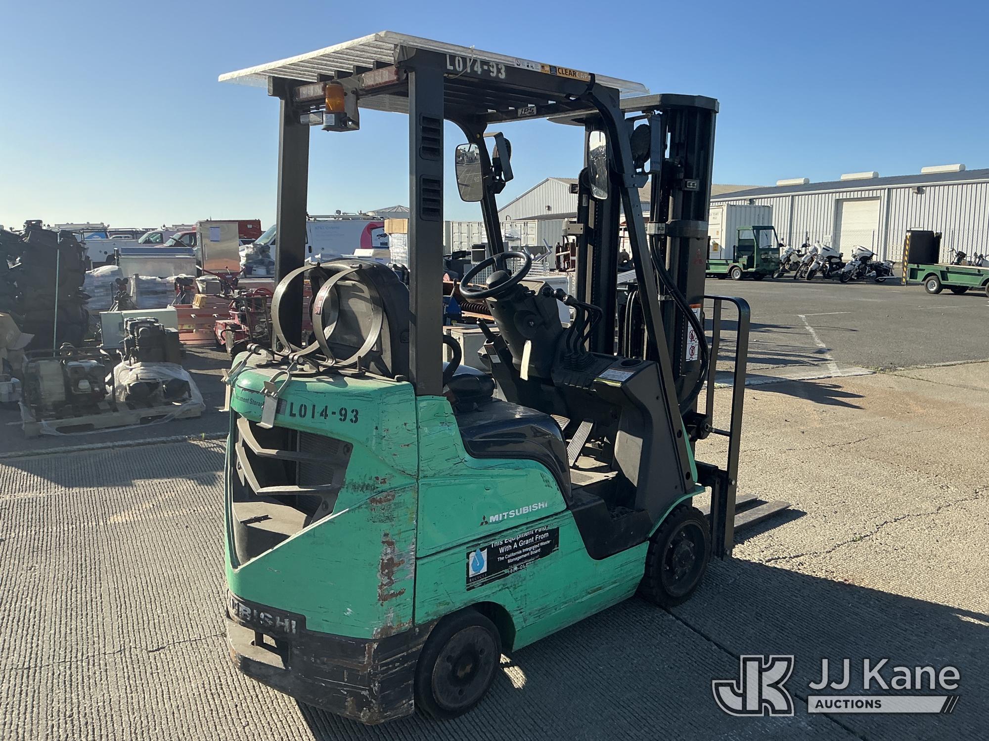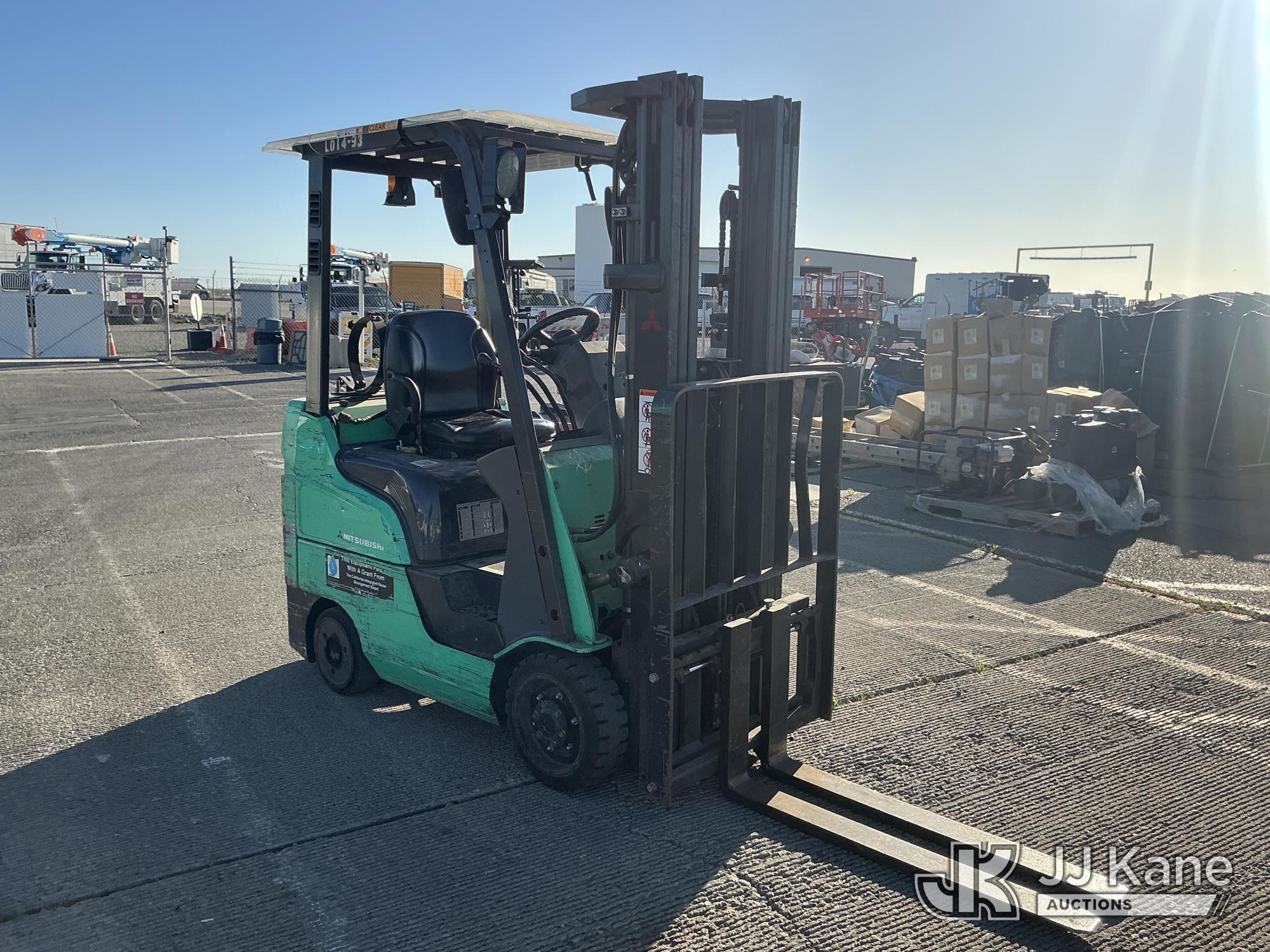 2014 Mitsubishi FGC18N Solid Tired Forklift, s/n AF81F40163, 3-cyl LPG, Shuttle, with 2700lb Capacity, 4ftForks, 187in 3 Stage Mast, Side Shift & ROPS, (Runs & Operates, Needs Propane Tank ) (Reads 1,464 hours)*