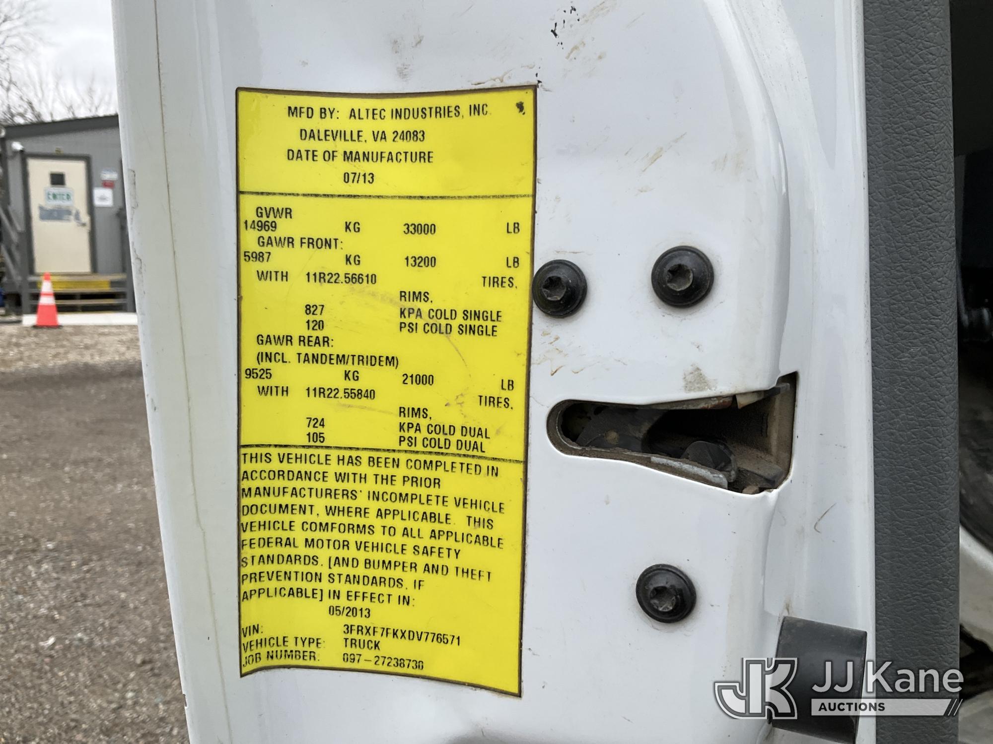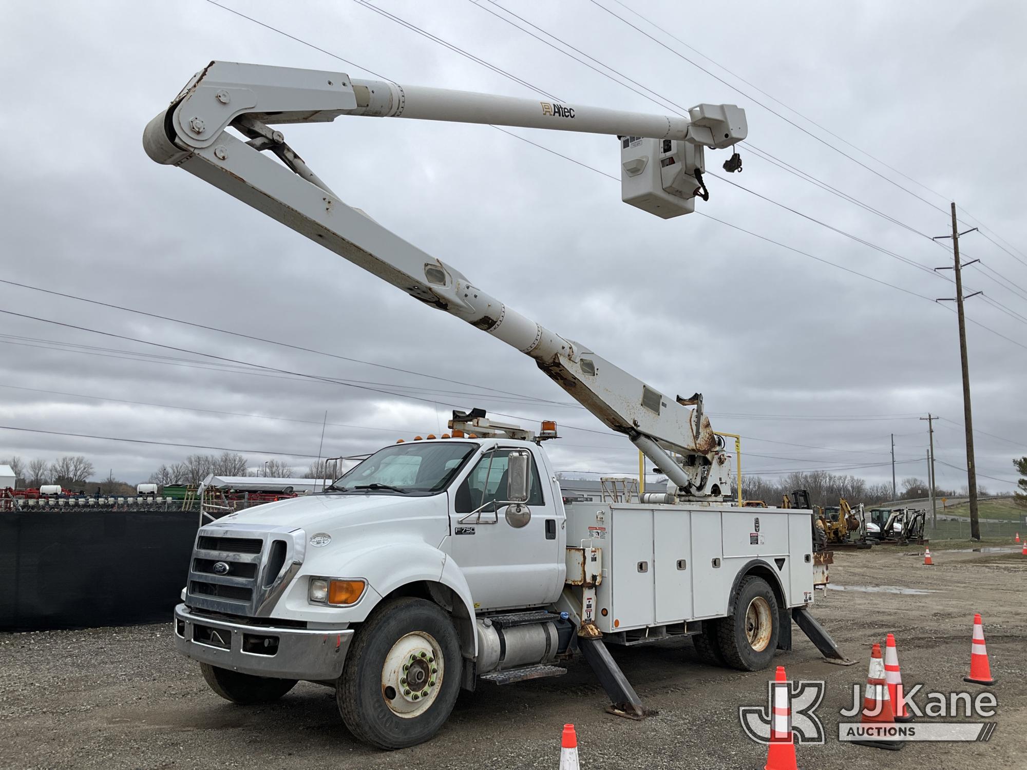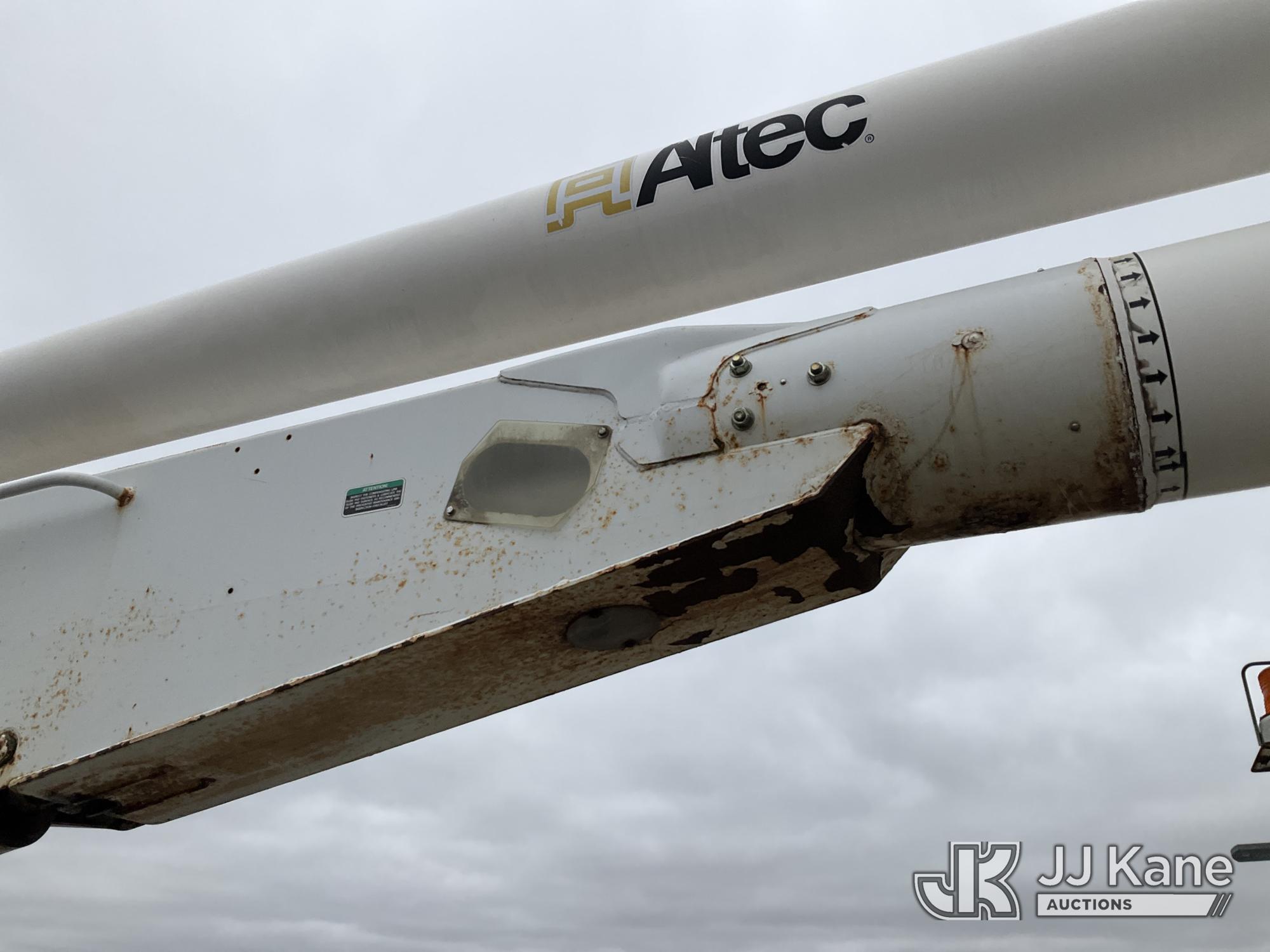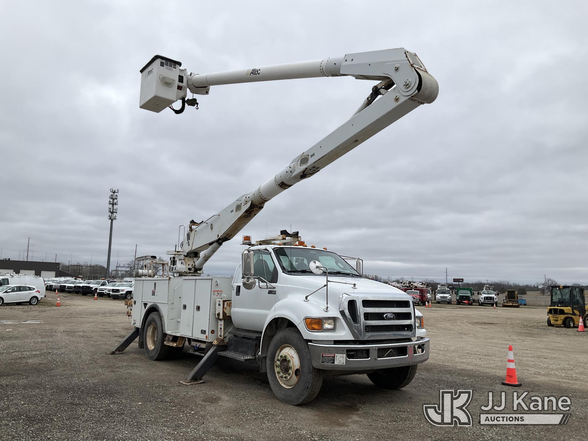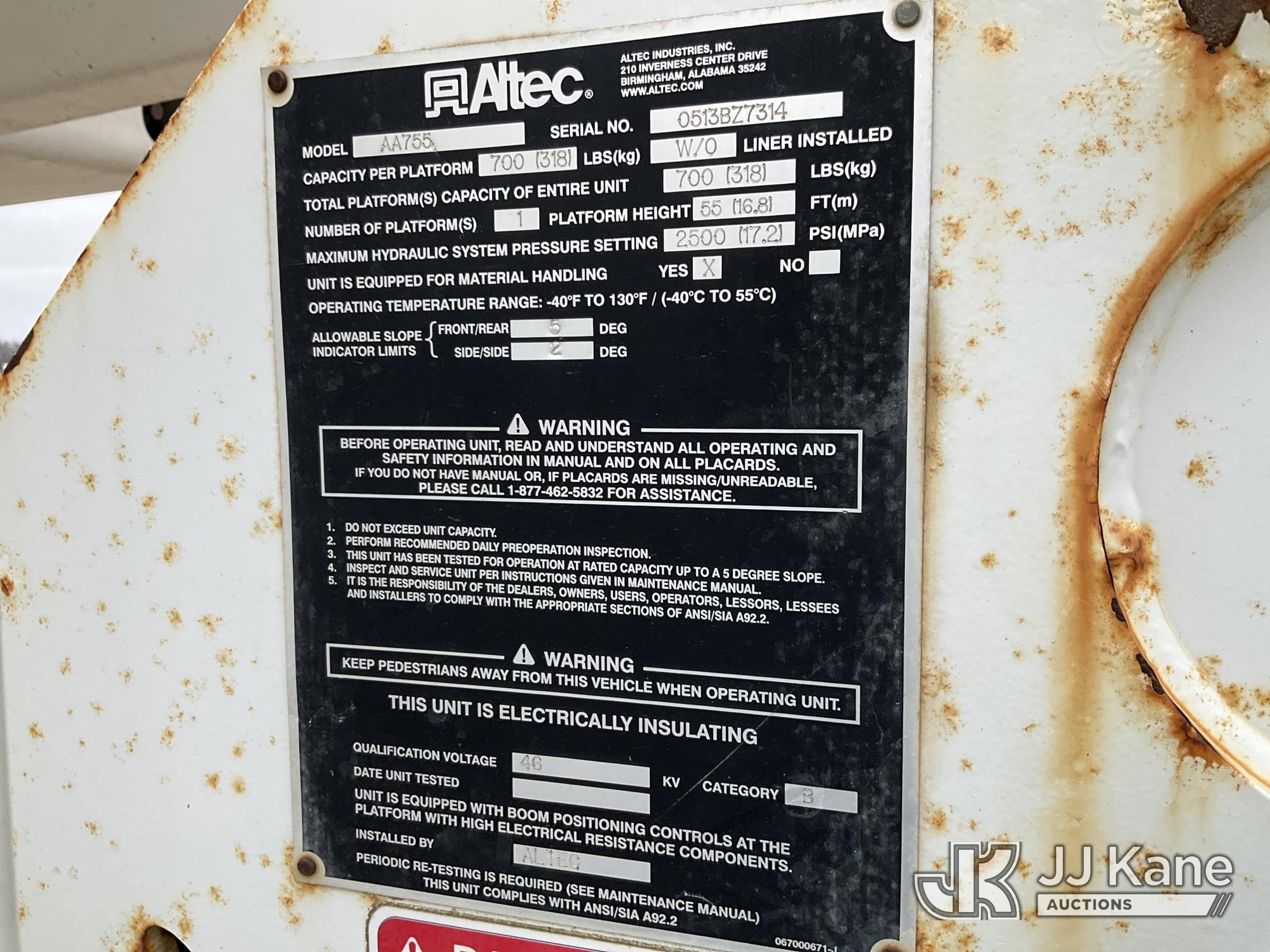Altec AA755-MH, 60 ft, Articulating Material Handling Bucket Truck s/n 0513BZ7314, with two man bucket, four hydraulic outriggers, jib attachment missing, rear mounted on 2013 Ford F-750 Regular Cab 2WD DRW Utility Truck, 6.7L L6 DIESEL 4X2, Auto, A/C, (52,173 miles) (Runs, Moves & Upper Operates) (Rust) (Reads 5,828 hours) This is a Titled Item*