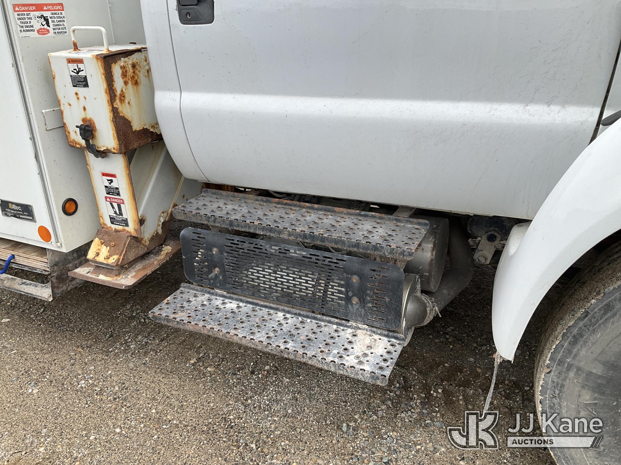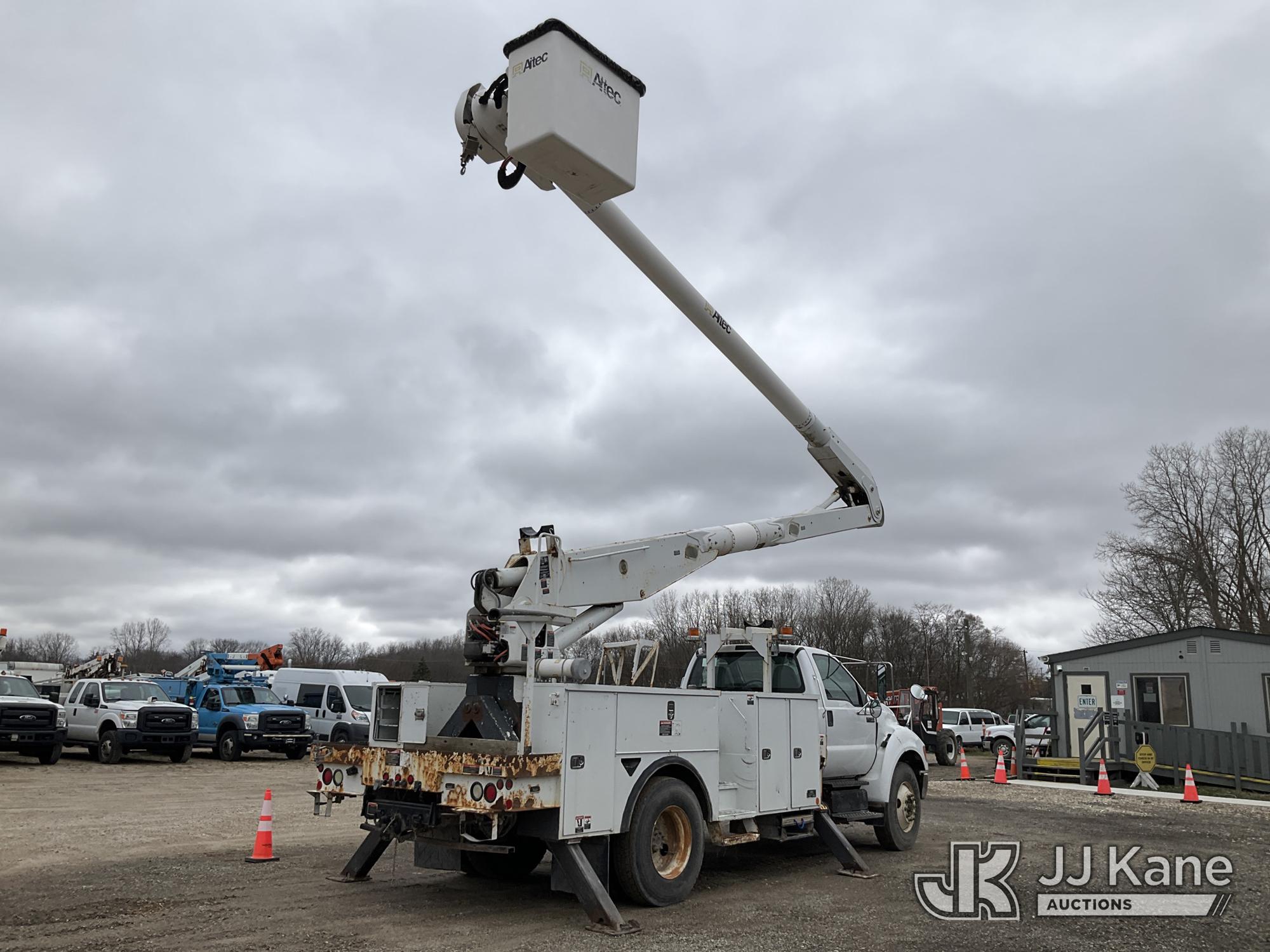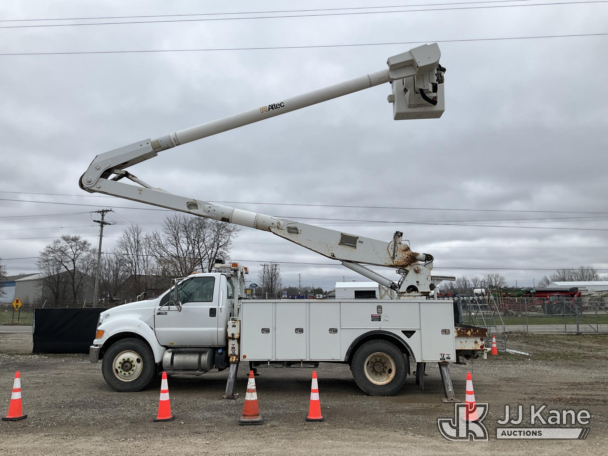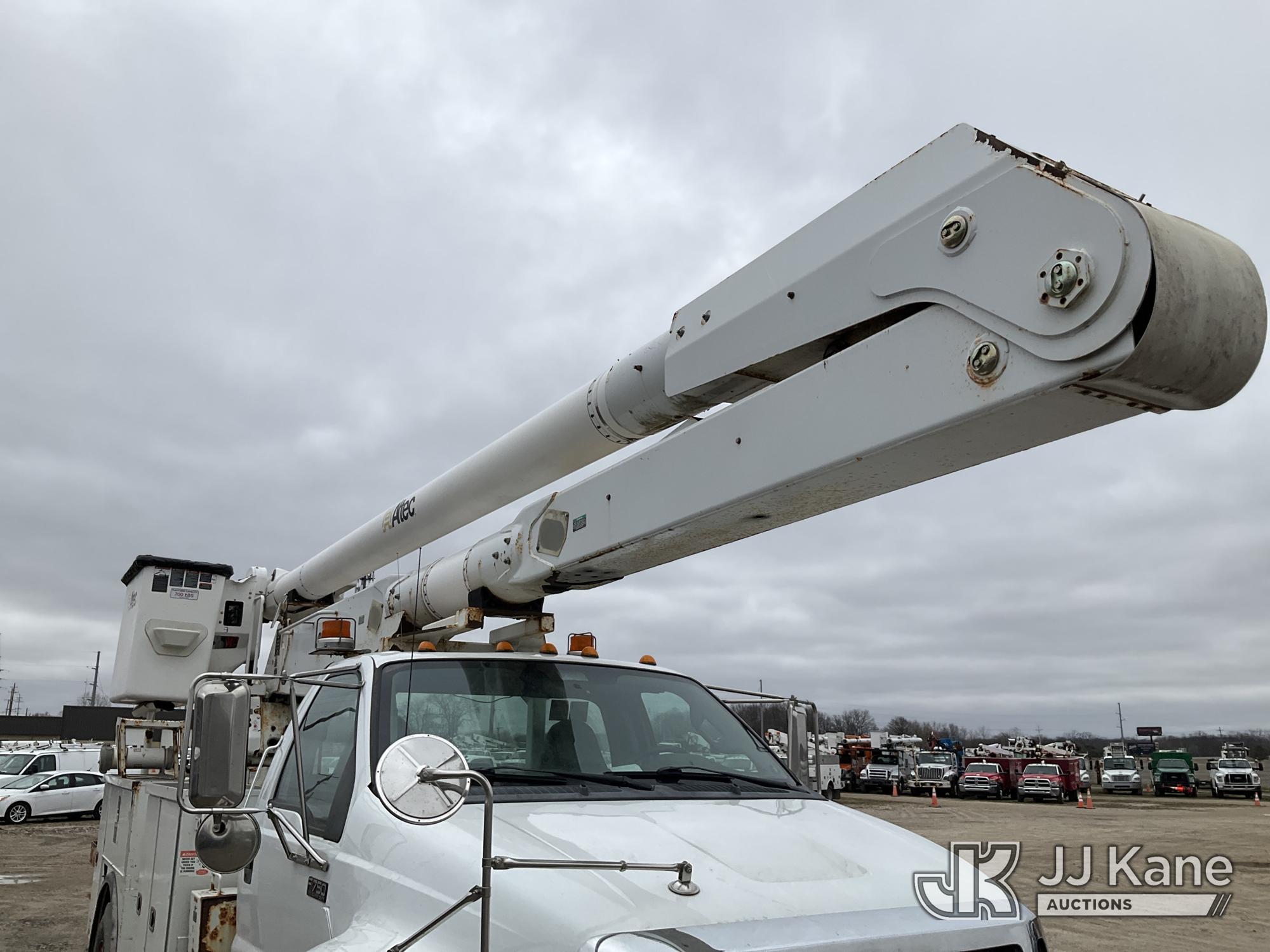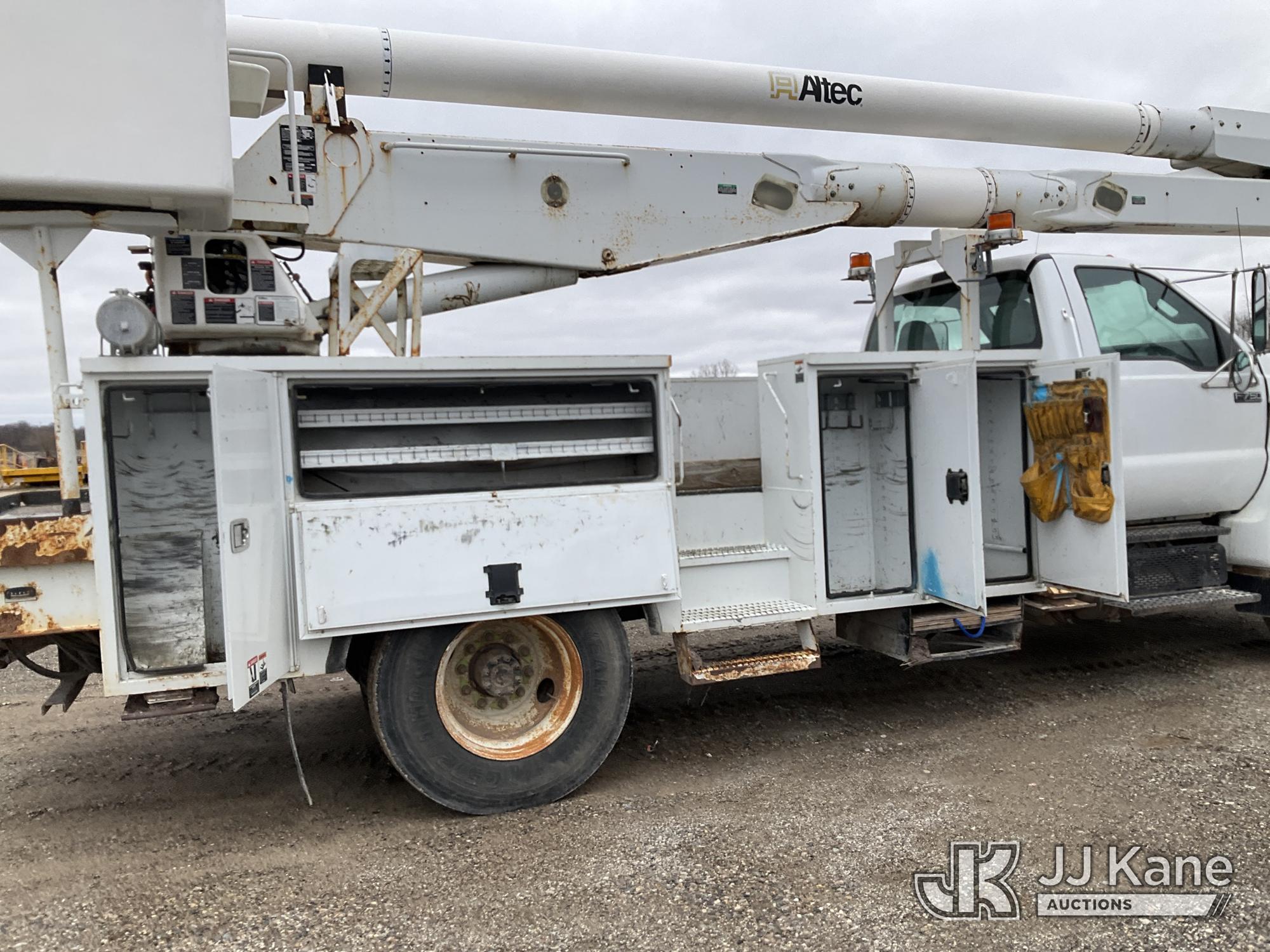 Altec AA755-MH, 60 ft, Articulating Material Handling Bucket Truck s/n 0513BZ7314, with two man bucket, four hydraulic outriggers, jib attachment missing, rear mounted on 2013 Ford F-750 Regular Cab 2WD DRW Utility Truck, 6.7L L6 DIESEL 4X2, Auto, A/C, (52,173 miles) (Runs, Moves & Upper Operates) (Rust) (Reads 5,828 hours) This is a Titled Item*
