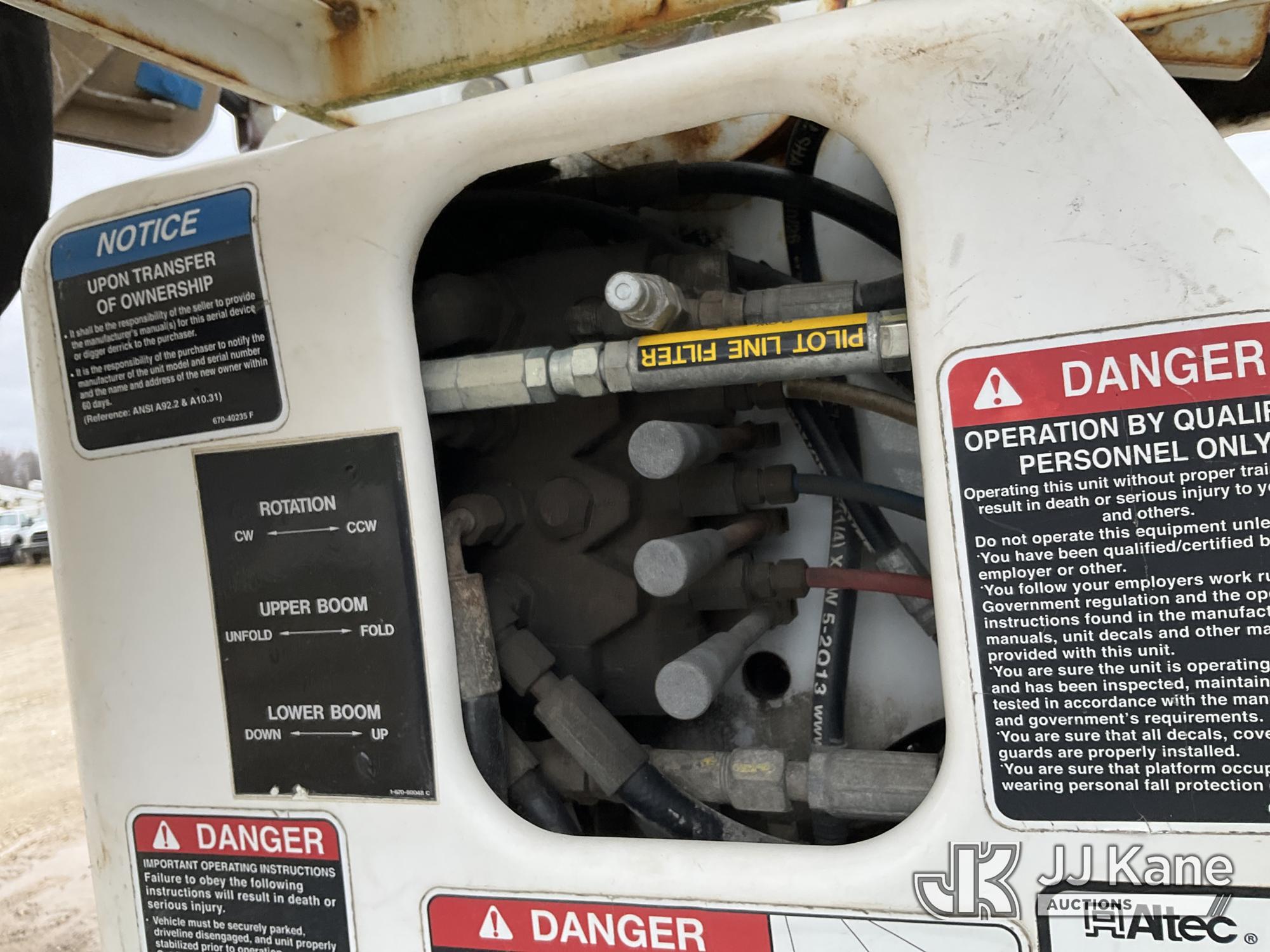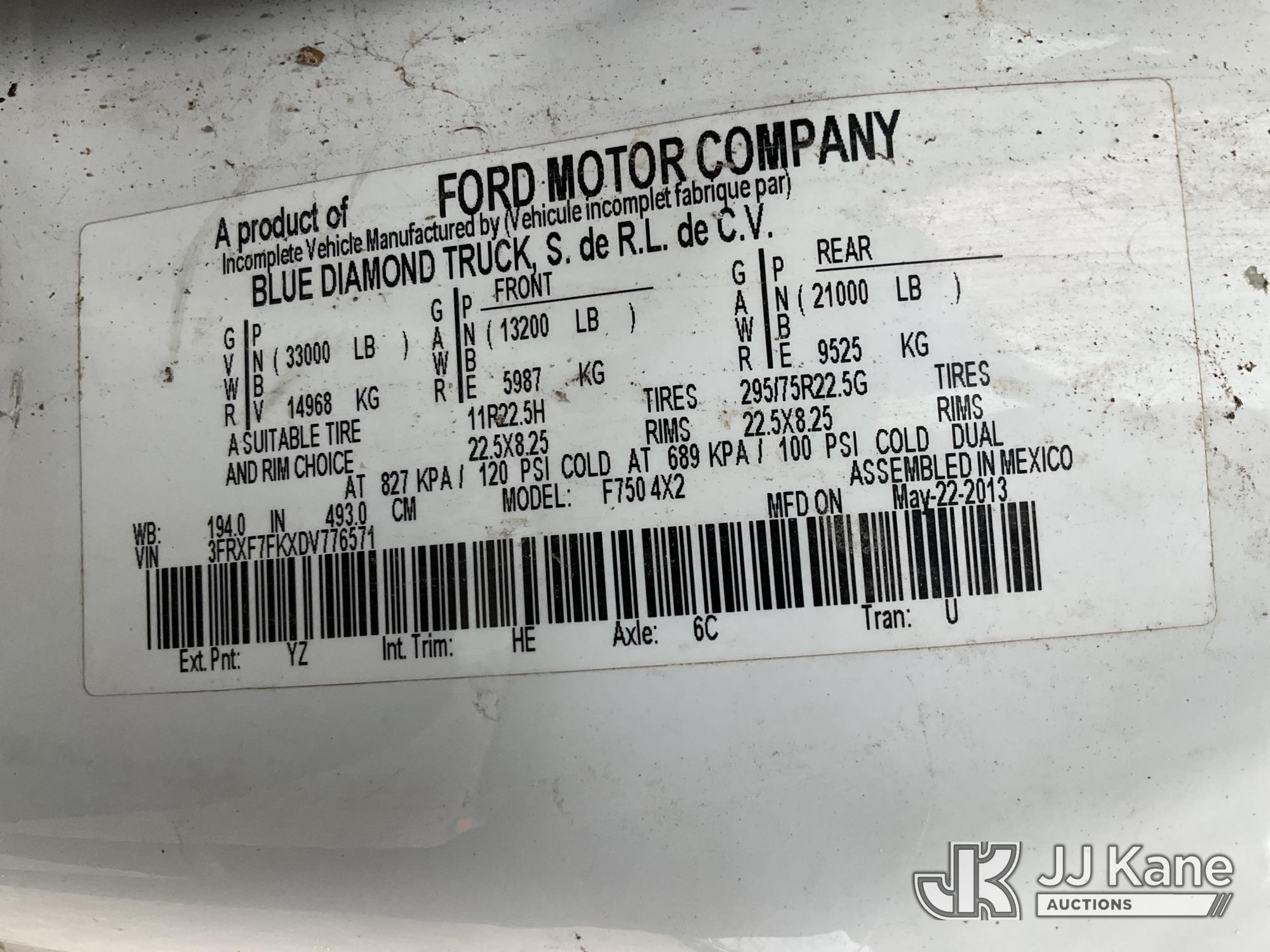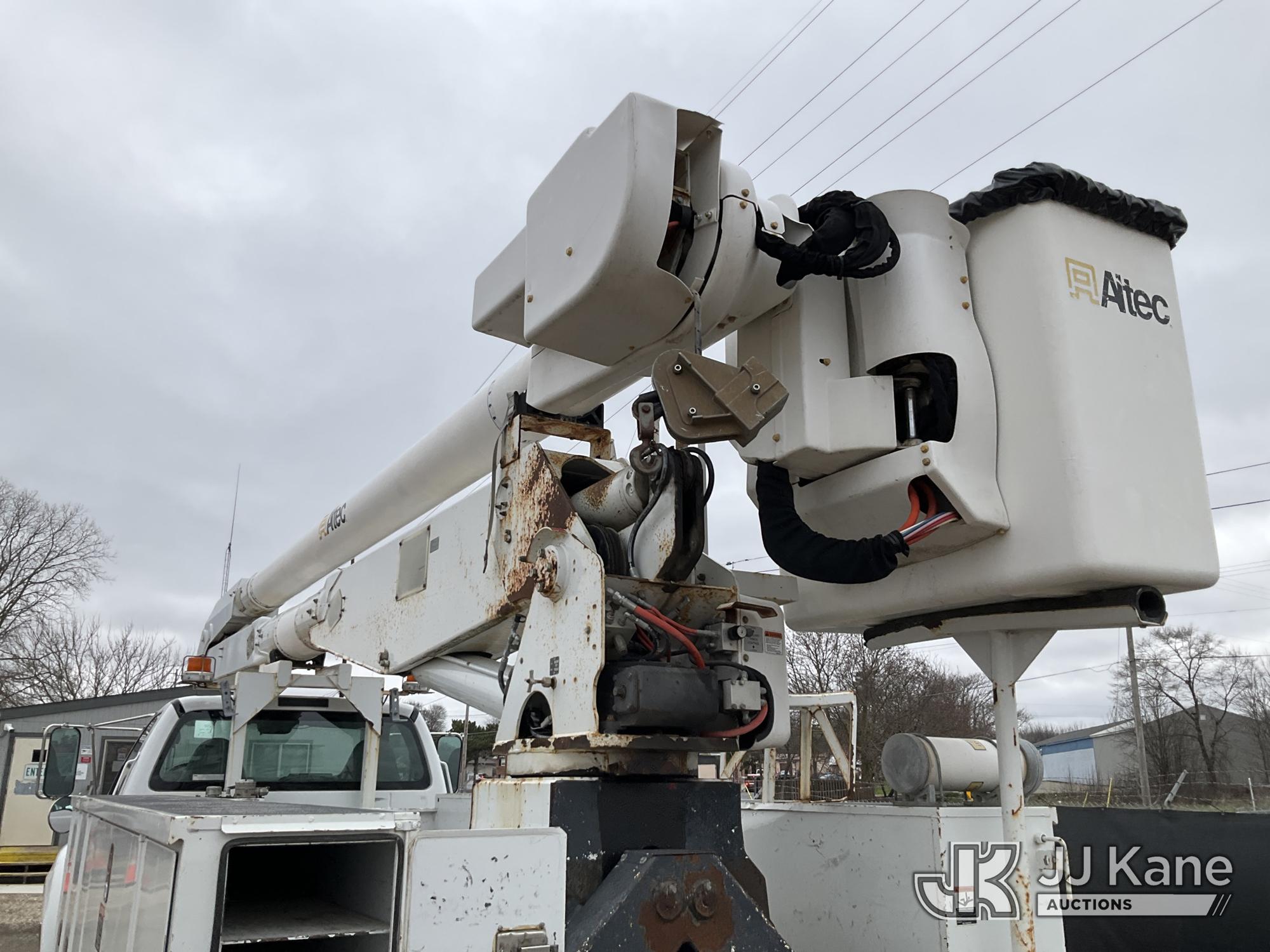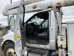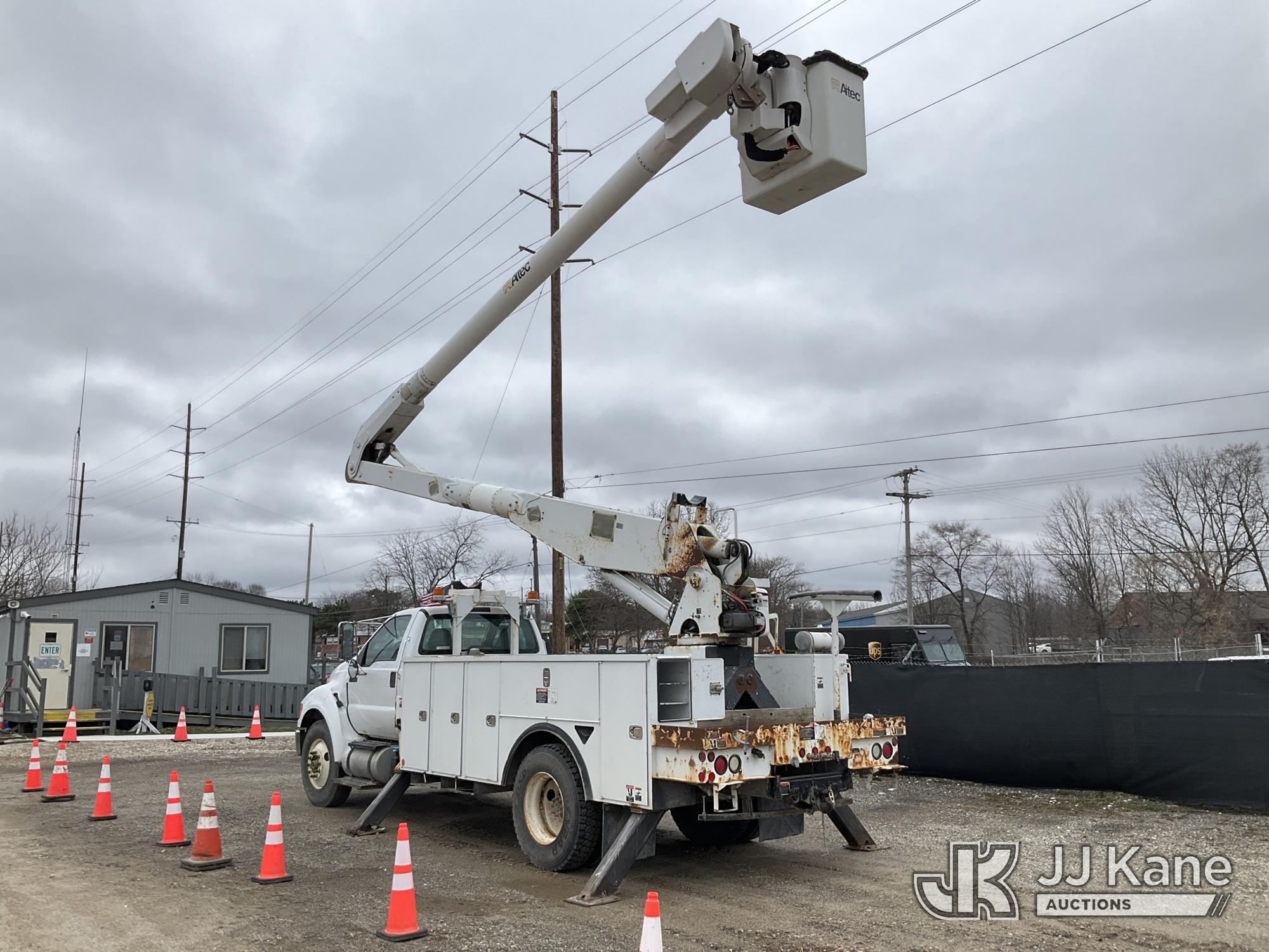 Altec AA755-MH, 60 ft, Articulating Material Handling Bucket Truck s/n 0513BZ7314, with two man bucket, four hydraulic outriggers, jib attachment missing, rear mounted on 2013 Ford F-750 Regular Cab 2WD DRW Utility Truck, 6.7L L6 DIESEL 4X2, Auto, A/C, (52,173 miles) (Runs, Moves & Upper Operates) (Rust) (Reads 5,828 hours) This is a Titled Item*