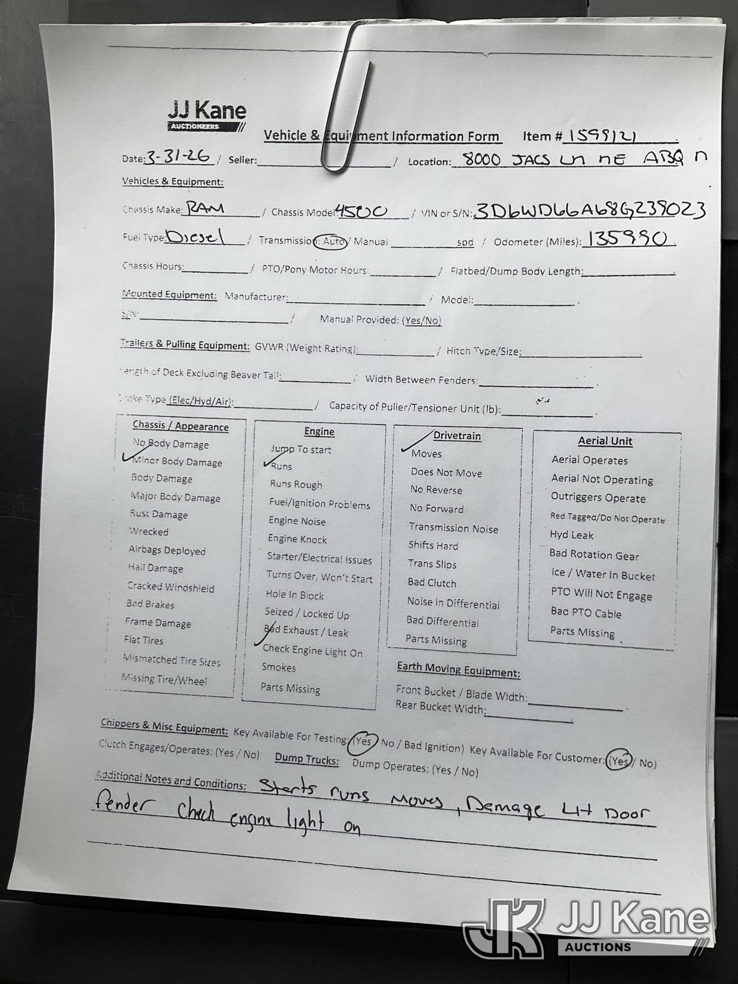 2008 Dodge Ram 4500 Cab & Chassis, 6.7L diesel, 4WD, Auto, A/C, (135,990 miles) (Runs & Moves) (Check Engine Light On, Body Damage) This is a Titled Item*