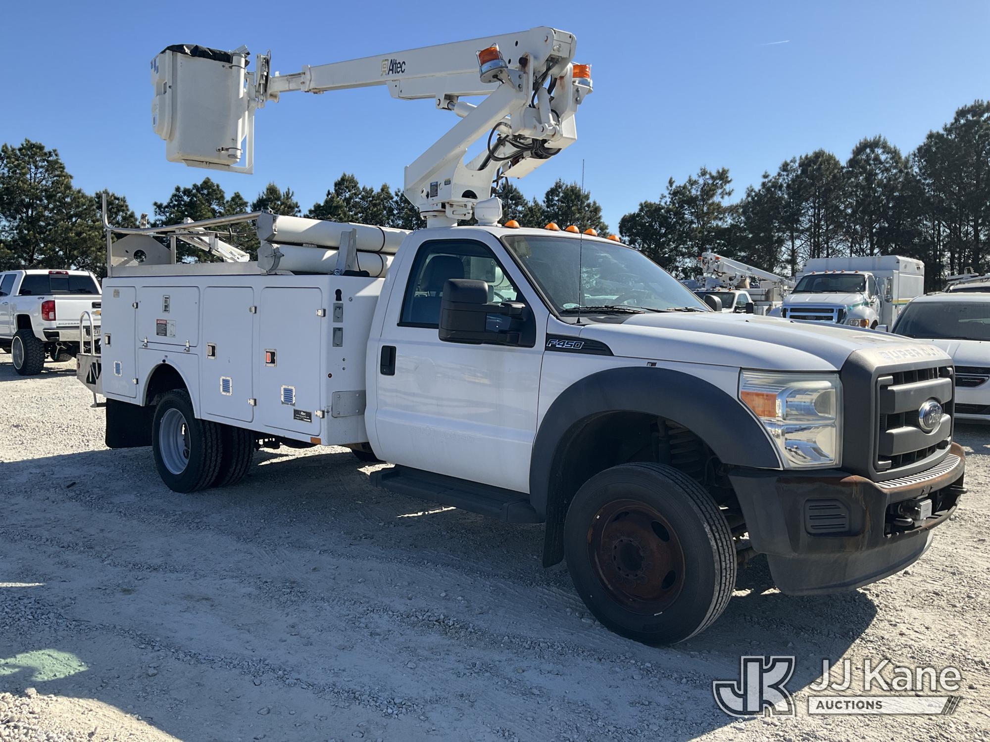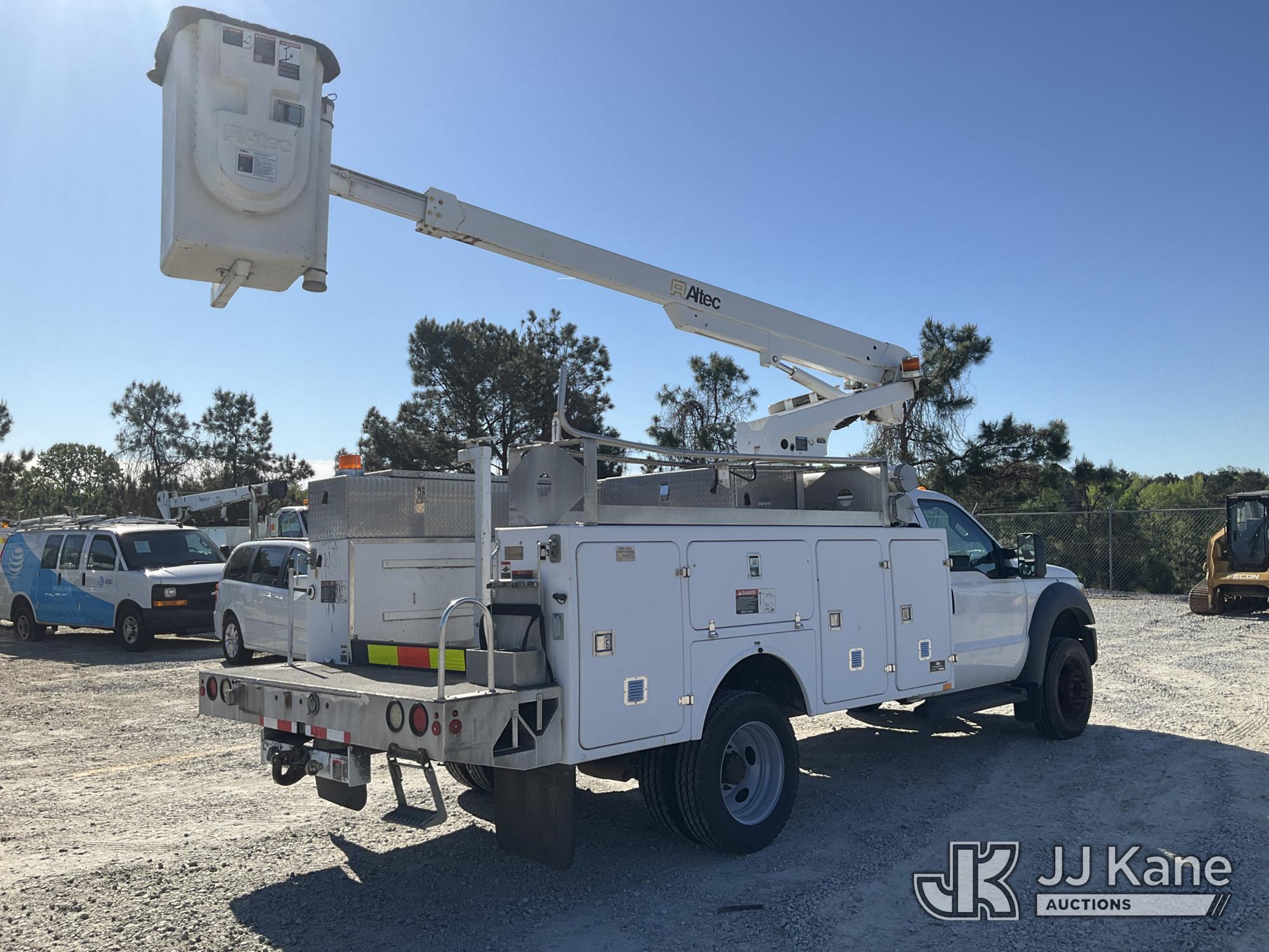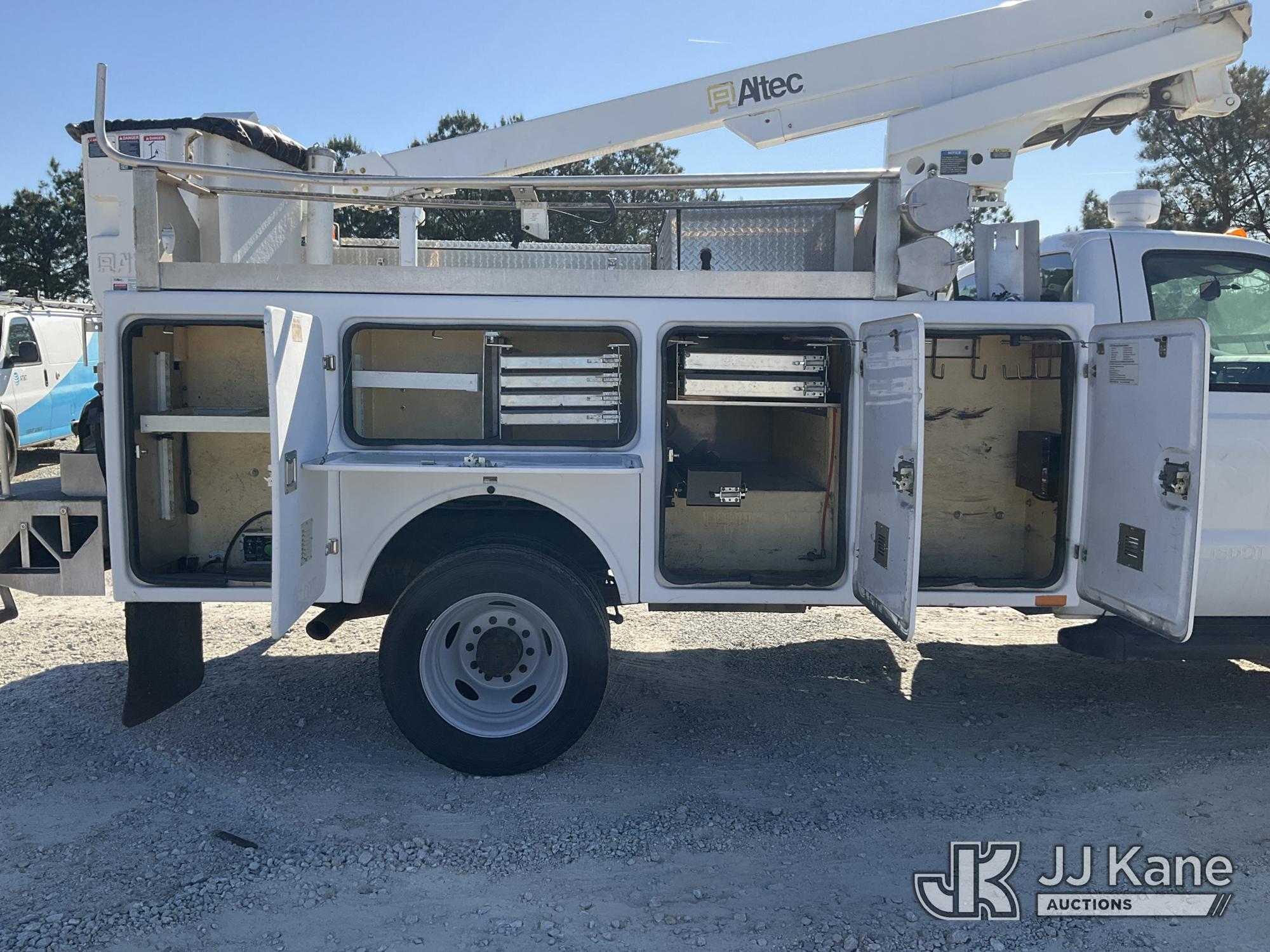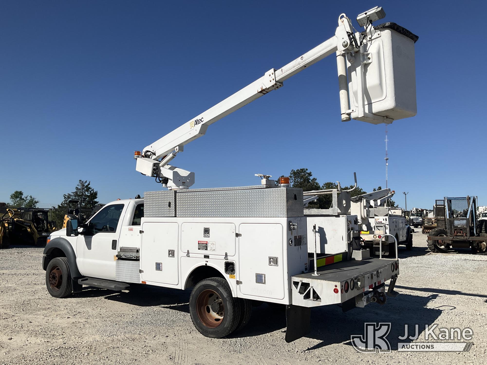 Altec AT200A, 35 ft, Telescopic Non-Insulated Bucket Truck s/n 0413BV20309, with single-man bucket, mounted behind cab on 2013 Ford F450 Service Truck, 10-cyl gas, Auto, A/C, with Onan Generator, (65,898 miles) (Runs, Moves & Upper Operates) (Check Engine Light On) This is a Titled Item*