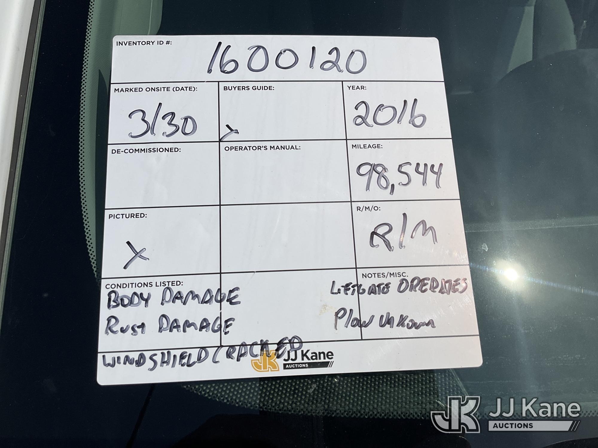 2016 Chevrolet Silverado 2500HD Pickup Truck, 8-cyl gas, 4WD, 6-Speed Automatic, A/C, with Western Snow Plow, Tommy Gate Liftgate, (98,544 miles) (Runs & Moves) (Liftgate Operates, Plow Condition Unknown) (Corrosion, Windshield Deficiencies, Exterior Defects-see photos) (Reads 12,392 hours) This is a Titled Item*