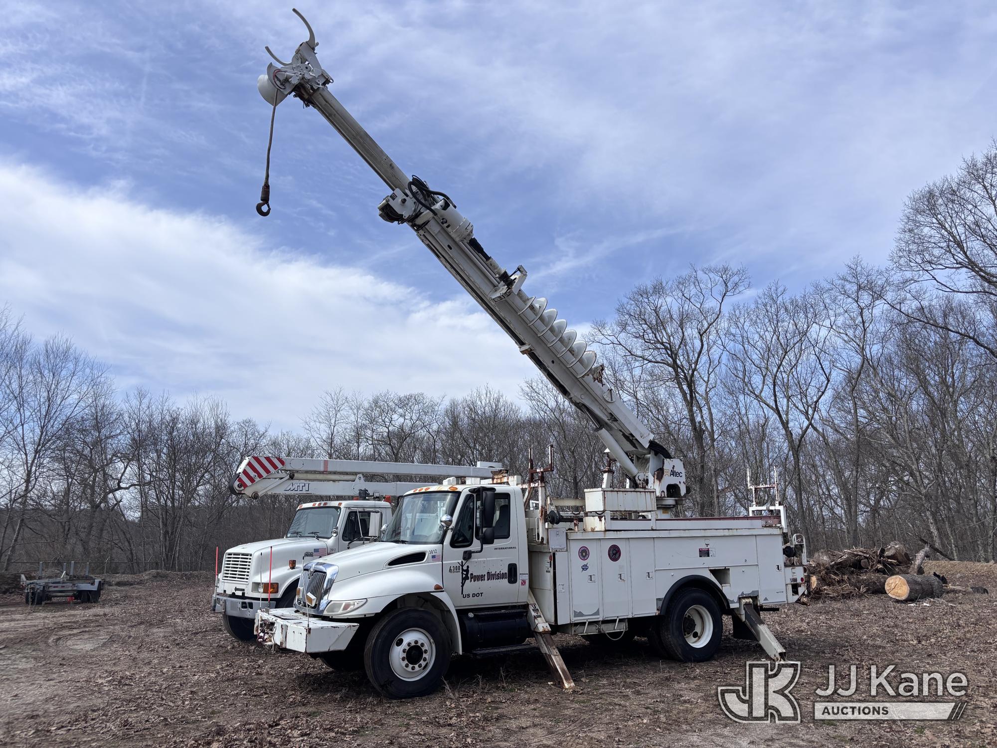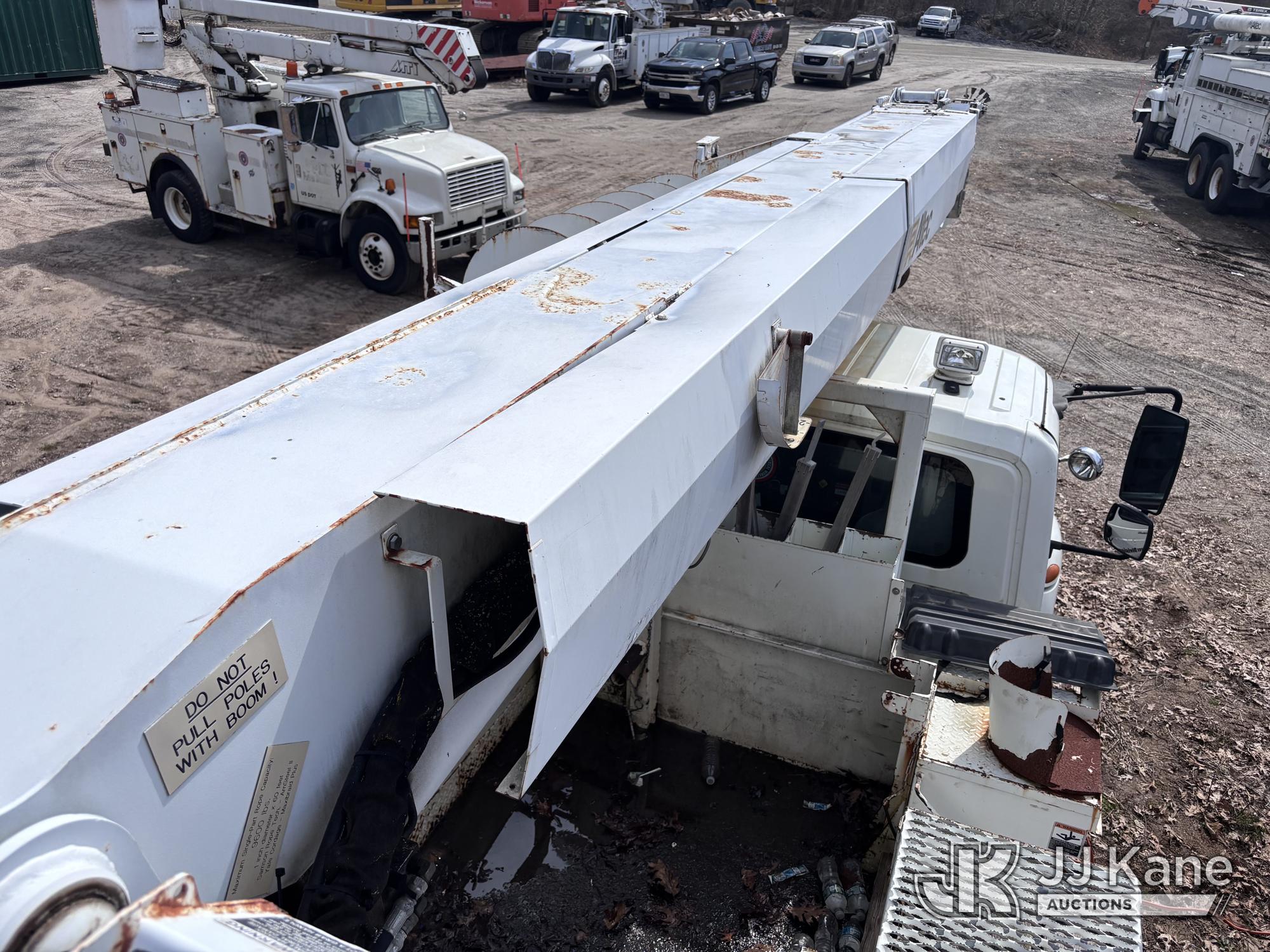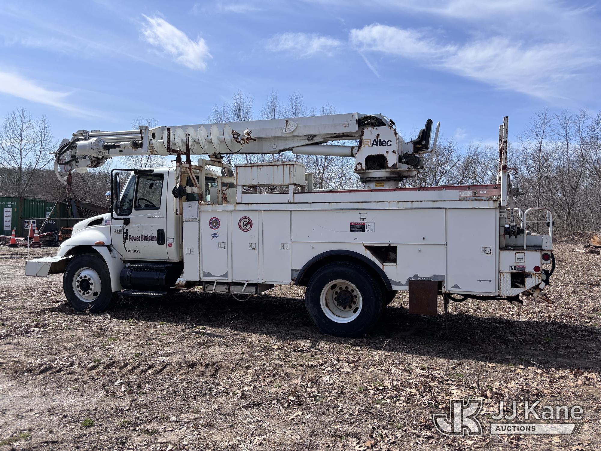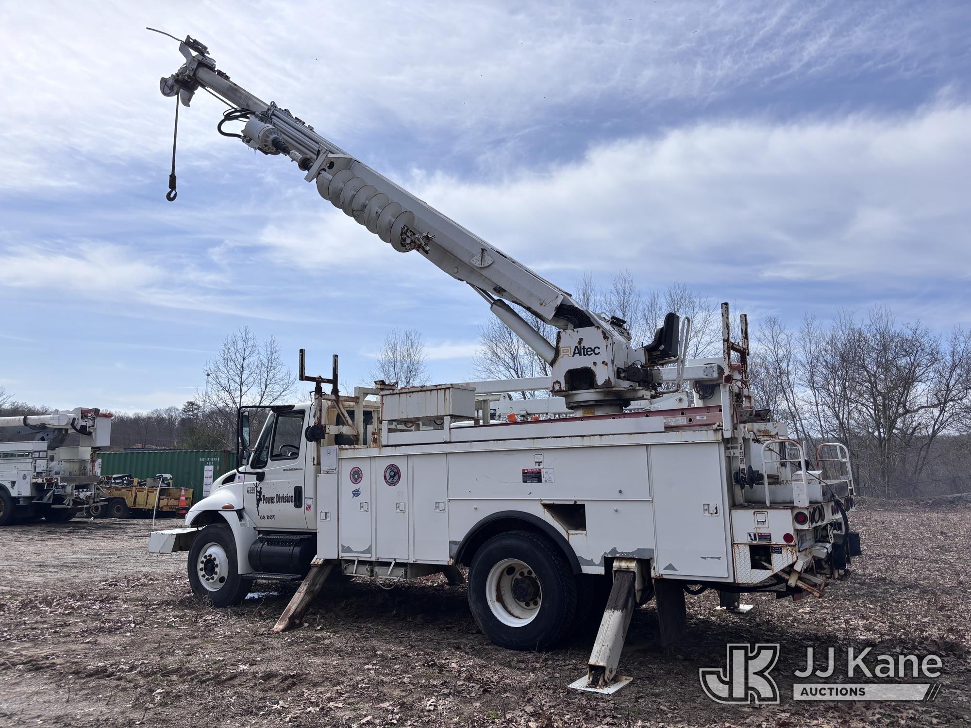 Altec DM47-BR, 17,730 Lb Digger Derrick s/n 1008DV2320, with 47 ft sheave height, 3 section hyd boom, 2 spd digger, upper controls, remote, tip winch, pole grabs, & riding console, rear mounted on 2007 International 4300 Utility Truck, DT466 Diesel, 4X2, 7-spd, A/C, with front winch, (88,979 miles) (Runs, Engine Issues, Coolant Mixing With Oil, Moves & Upper Operates) (Oil Leak At High RPMs, Gray Oil Color) (Sellers Tooling Will Be Removed Prior To Sale) (Reads 8,223 hours) This is a Titled Item*