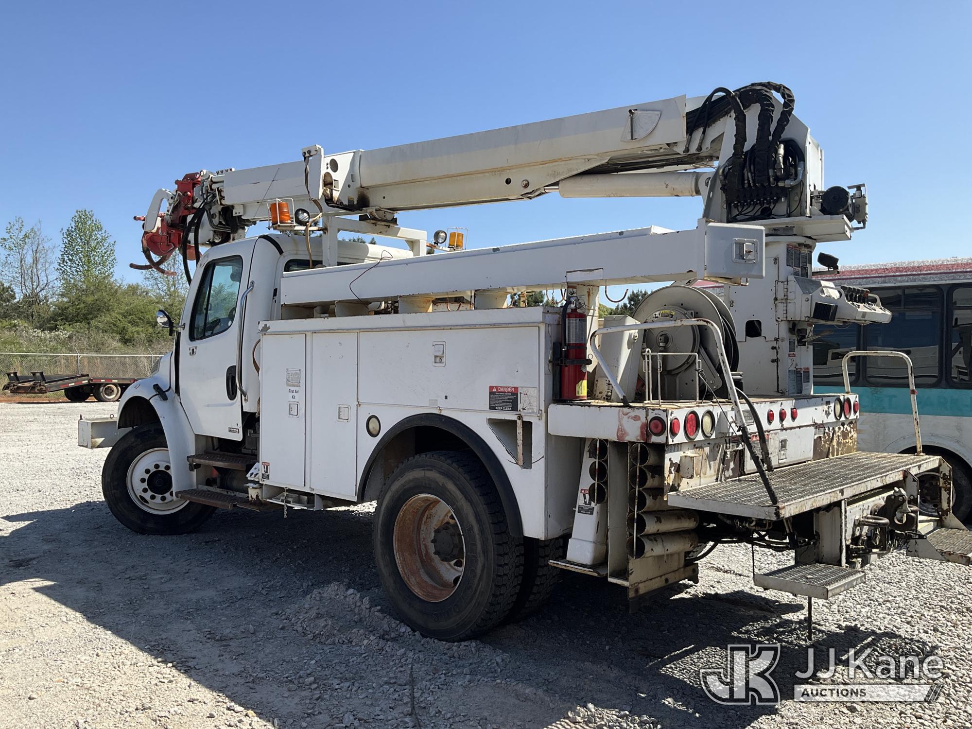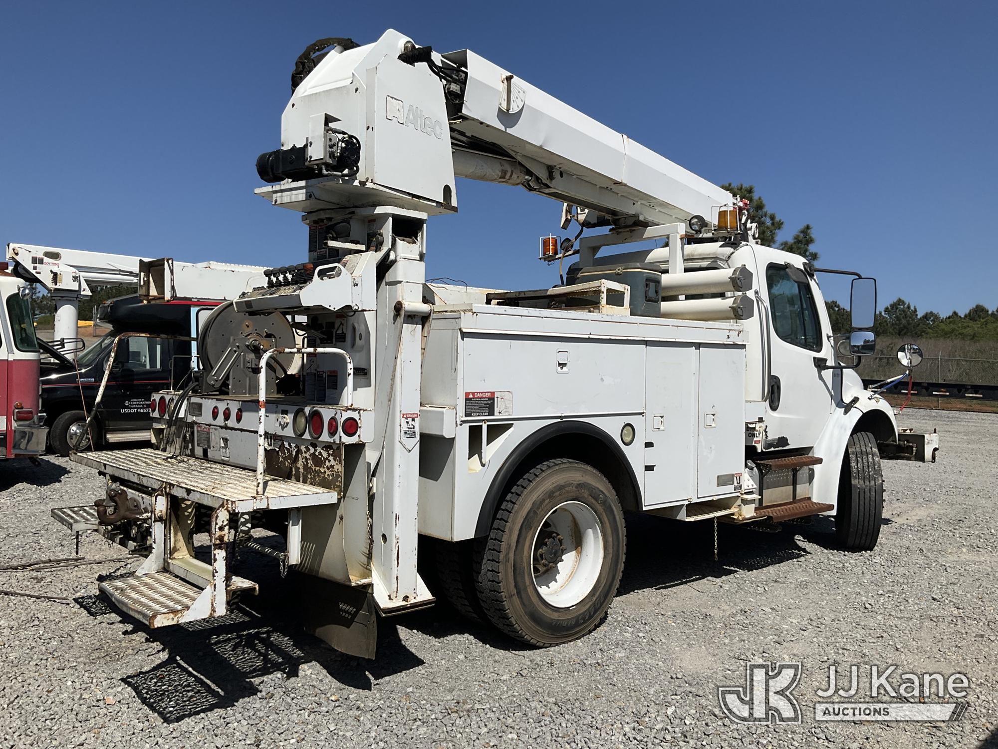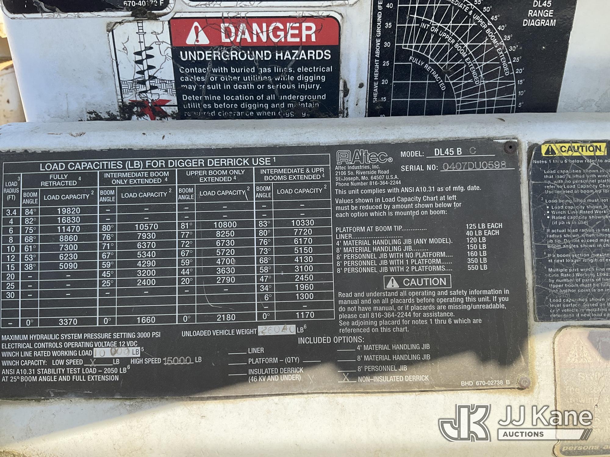 Altec DL45-BC, 19,820 Lb Derrick s/n 0407DU0598, with 45ft sheave height, pole guides, tip winch, corner mounted on 2007 Freightliner M2 Utility Truck, Cat 7.2L diesel, Auto, A/C, with front winch, True Mileage Unknown (Not Running, Condition Unknown, Upper Condition Unknown, Missing Digger Motor) This is a Titled Item*