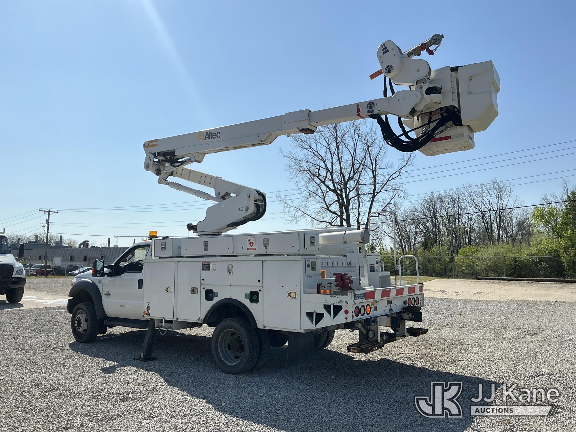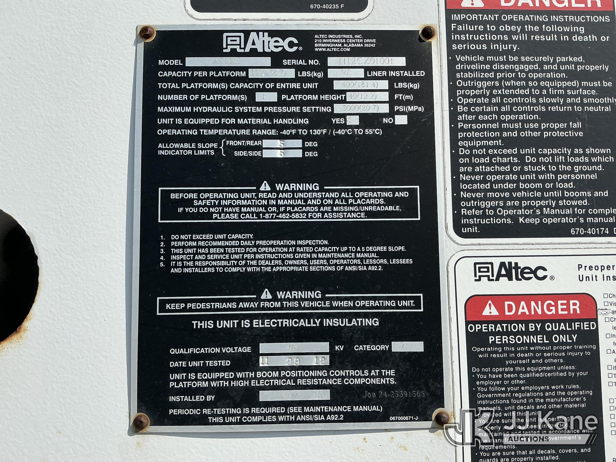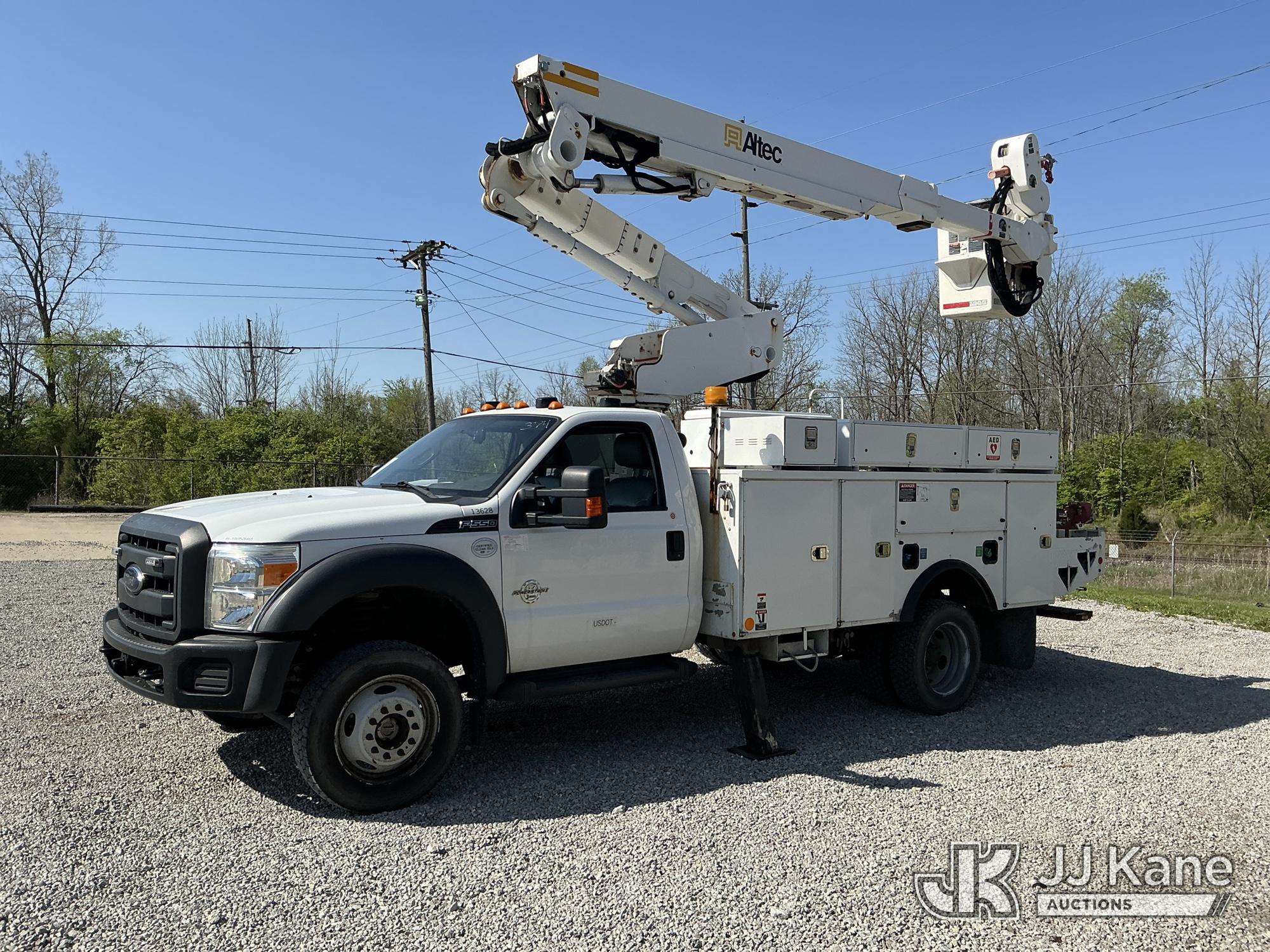 Altec AT40-MH, 40 ft, Articulating & Telescopic Material Handling Bucket Truck s/n 1112CZ01001, with single-man bucket & 2 hyd outriggers, mounted behind cab on 2012 Ford F-550 Regular Cab DRW 4WD Service Truck, s/n 1FDUF5HT5CEC97863, 6.7L V8 OHV 16V Diesel, Auto, A/C, with inverter, (131,247 miles) (Runs, Moves & Upper Operates) (Check Engine Light On, Paint Damage) (Reads 8,396 hours) This is a Titled Item*