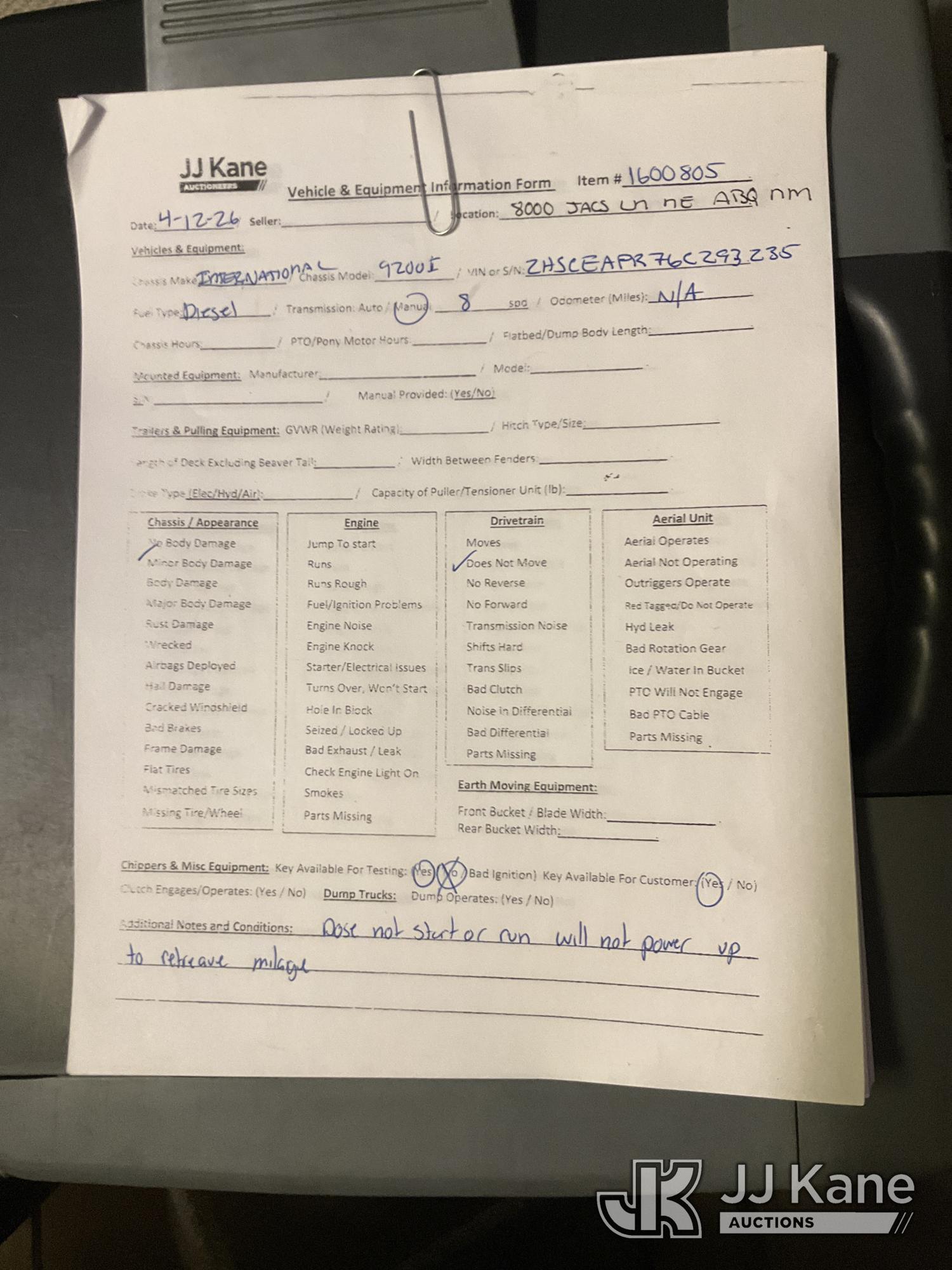 2006 International 9200i T/A Truck Tractor, 14.9L L6 DIESEL 6X4, 13-spd, A/C, with Sliding 5th Wheel Plate, True Mileage Unknown (Not Running, Conditions Unknown) This is a Titled Item*