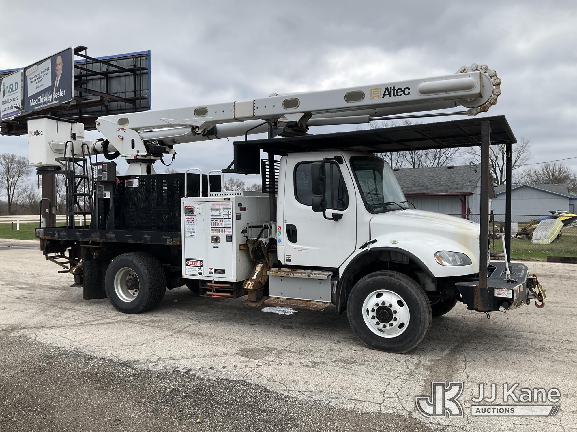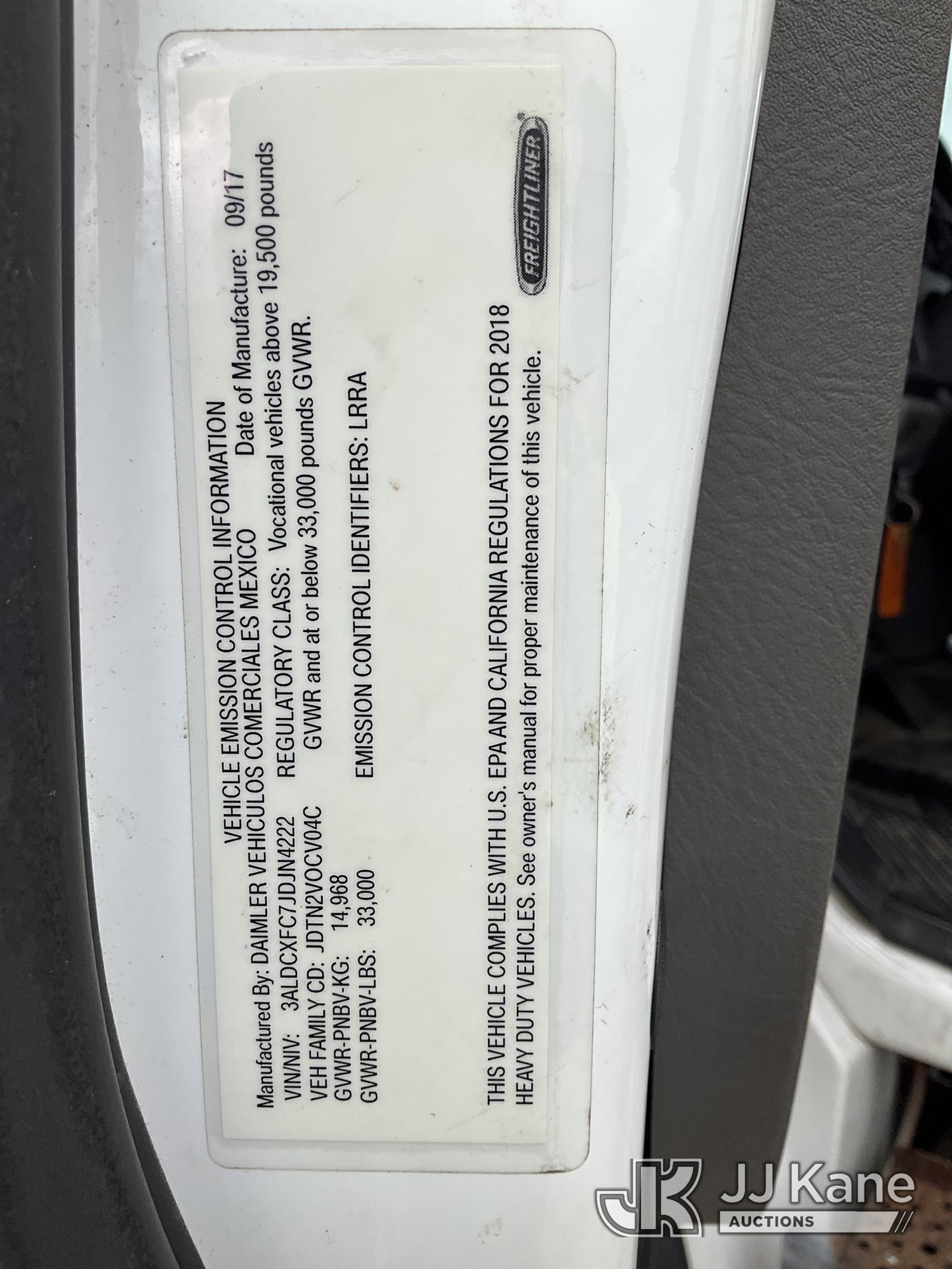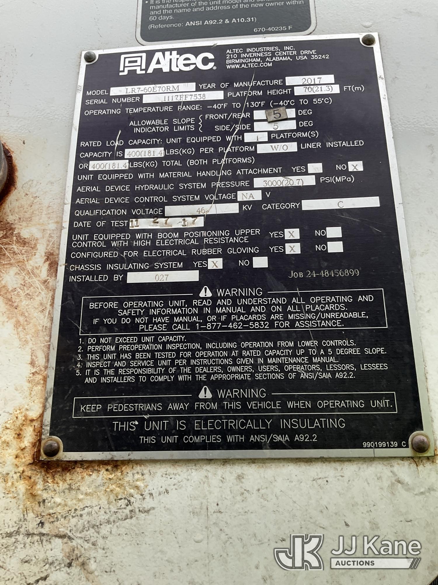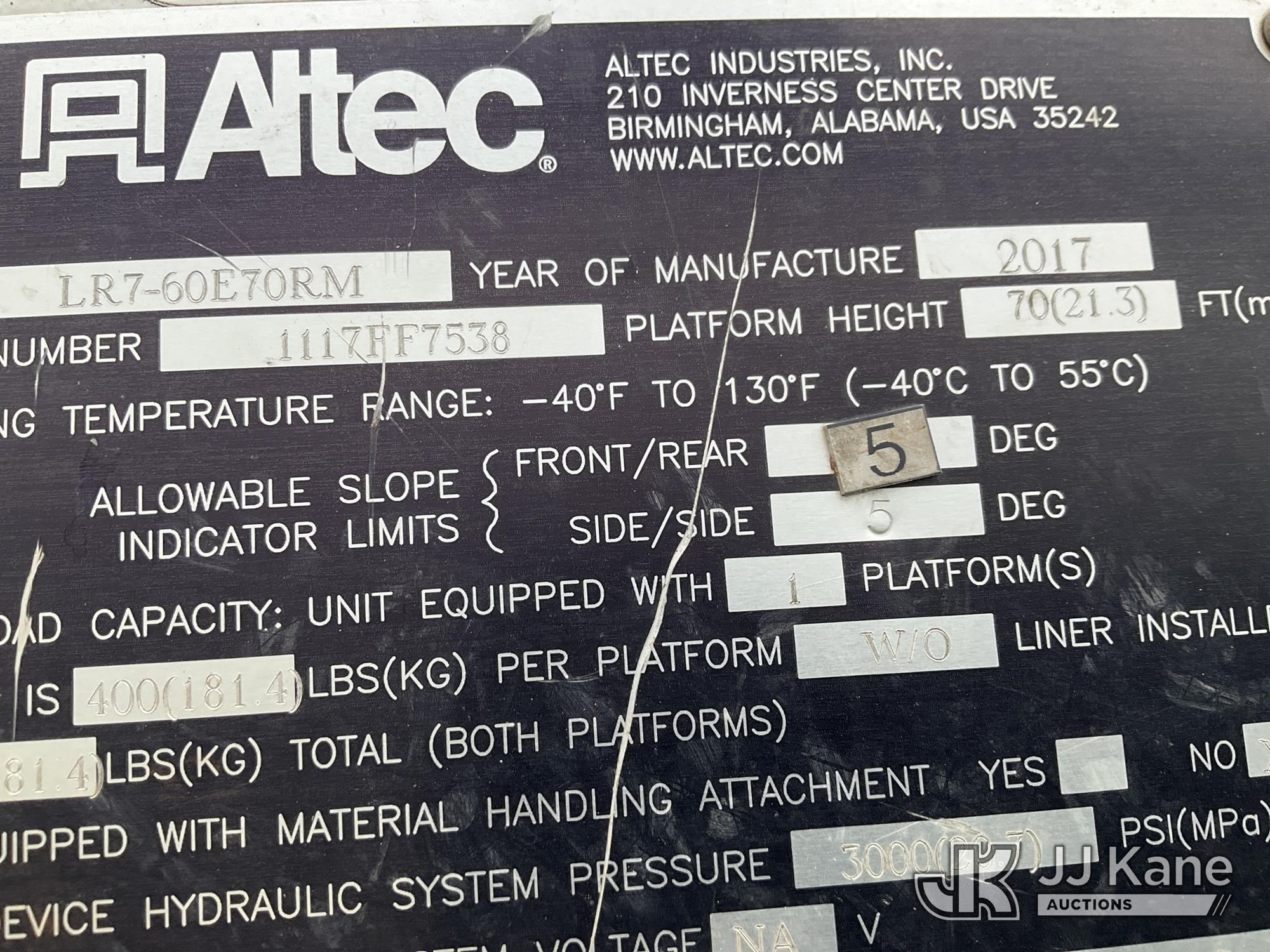 Altec LR7-60E70RM, 75 ft, Over-Center Elevator Bucket Truck s/n 1117FF7538, with Single-Man Bucket, 4 Hydraulic Outriggers, mounted on 2018 Freightliner M2 106 Flatbed/Service Truck, Cummins 6.7L Diesel 6-spd manual, A/C, with front bumper winch, (120,157 miles) (Runs, Moves, Hydraulic System Defect-Do Not Engage PTO, Upper Condition Unknown) (Brake System Non-Operational, Dash Indicator Light On, Windshield Deficiencies) (Seller States-Major repairs needed) (Reads 12,976 hours) This is a Titled Item*