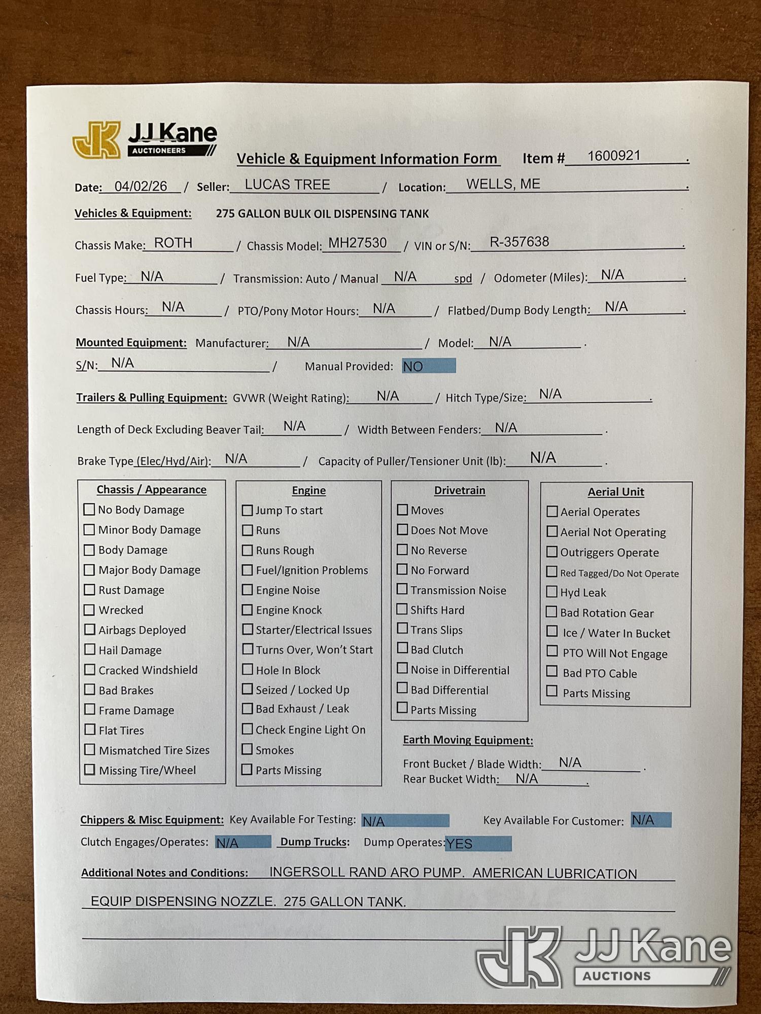 | Conditions / Miscellaneous: | 275-gallon bulk oil tanks, S/N R-357638 |