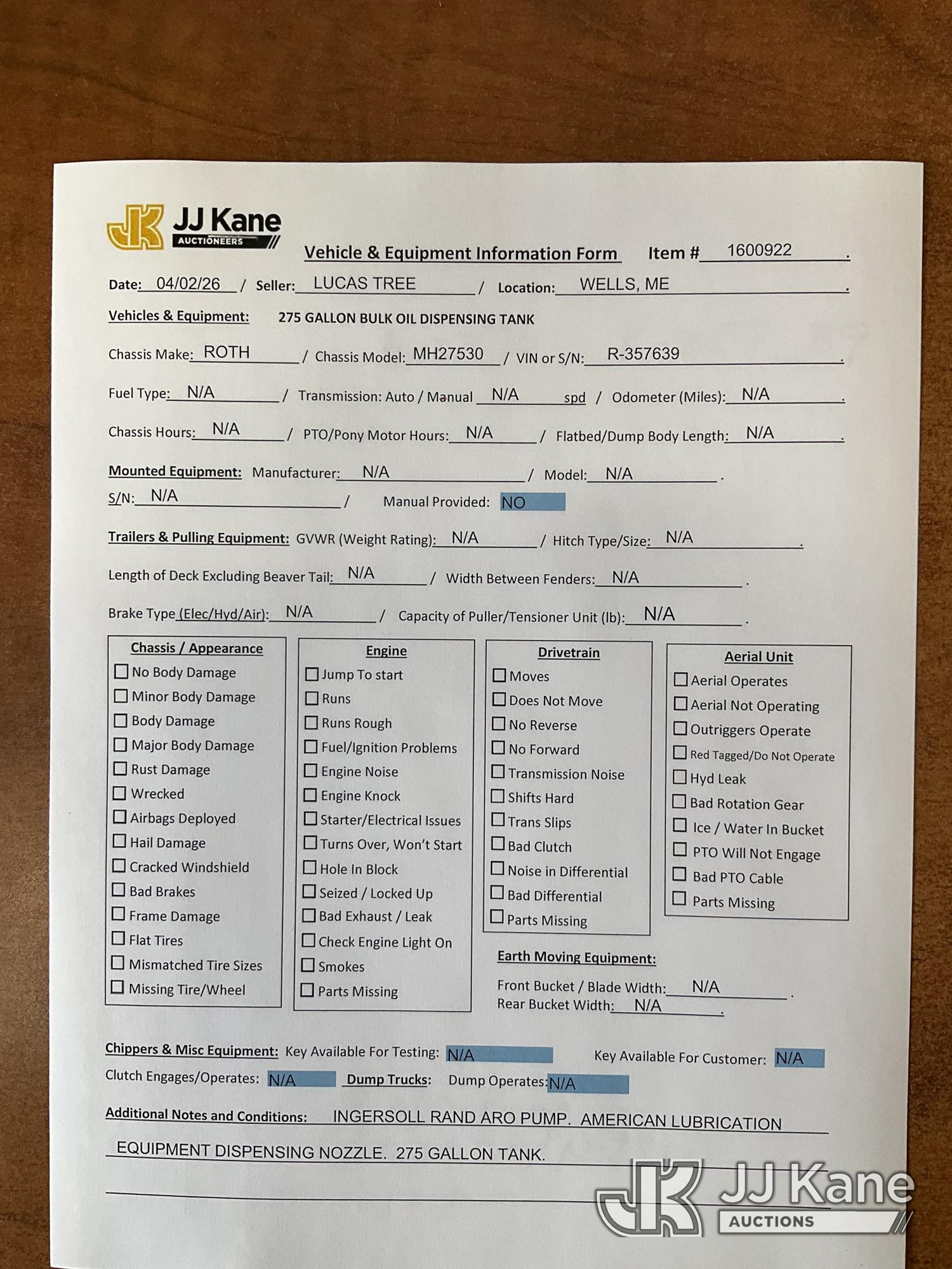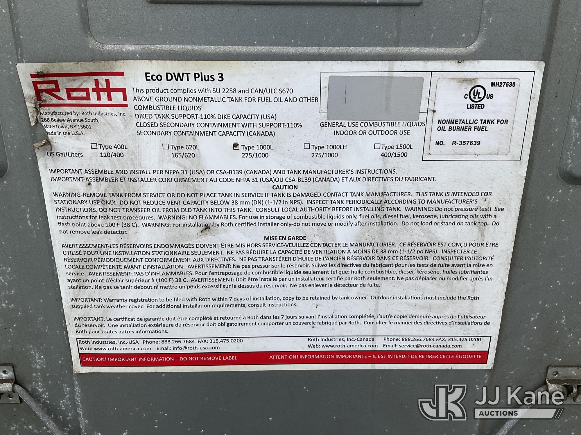 | Conditions / Miscellaneous: | Roth 275-Gallon Non-Metallic Oil Tank, S/N R-357639 |