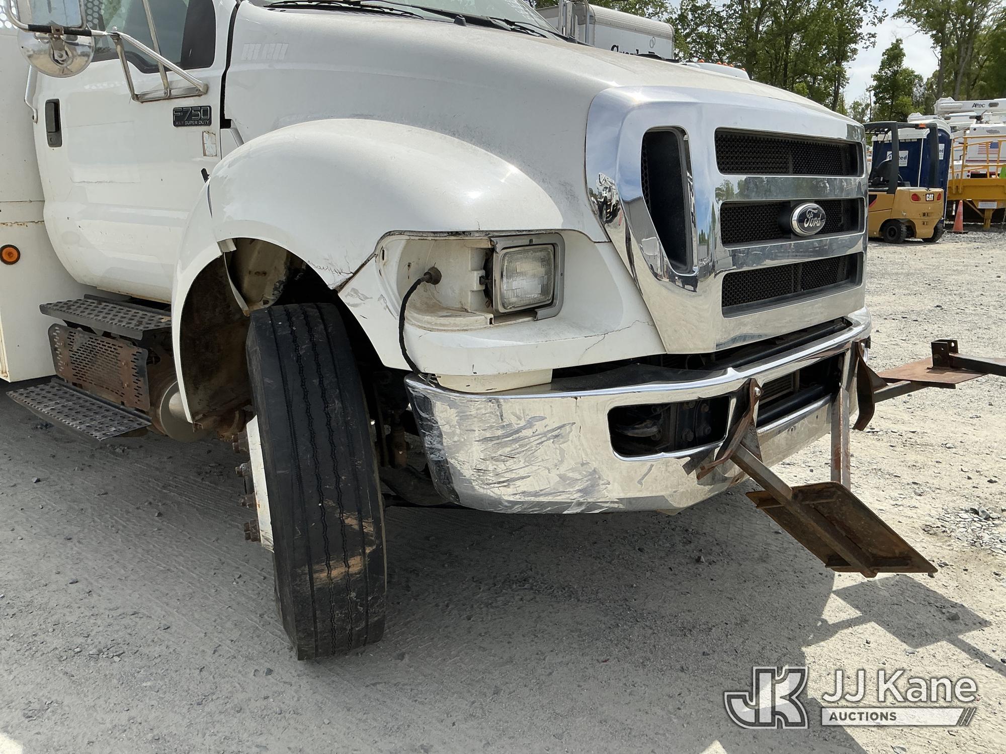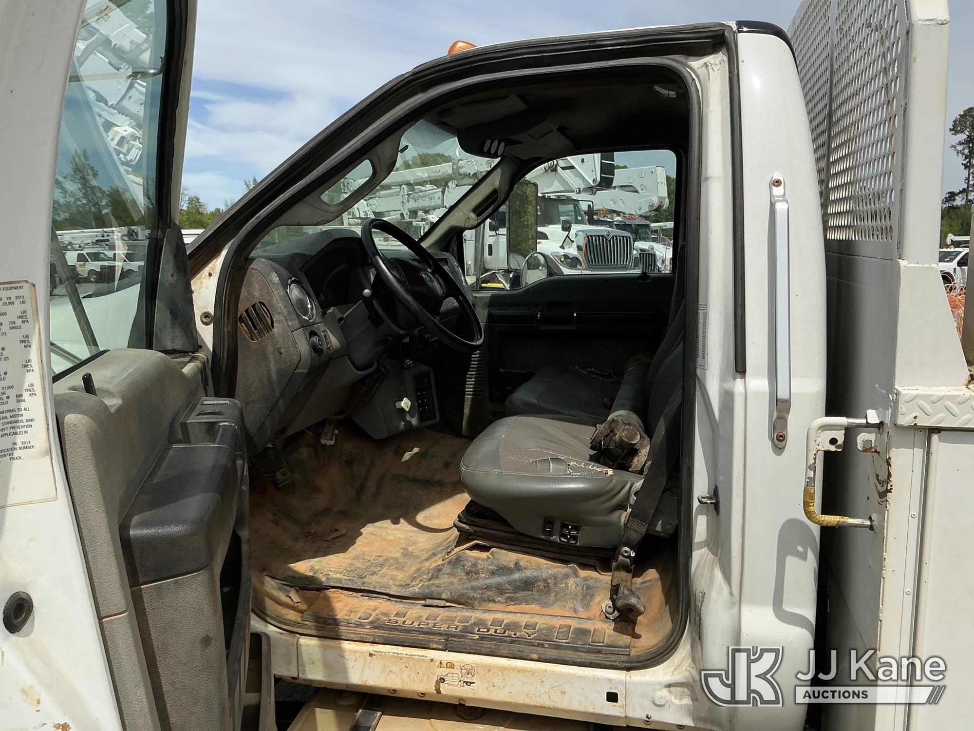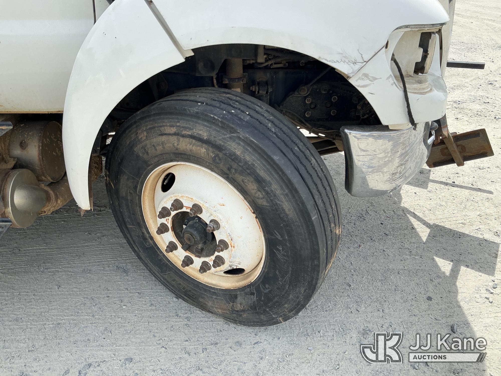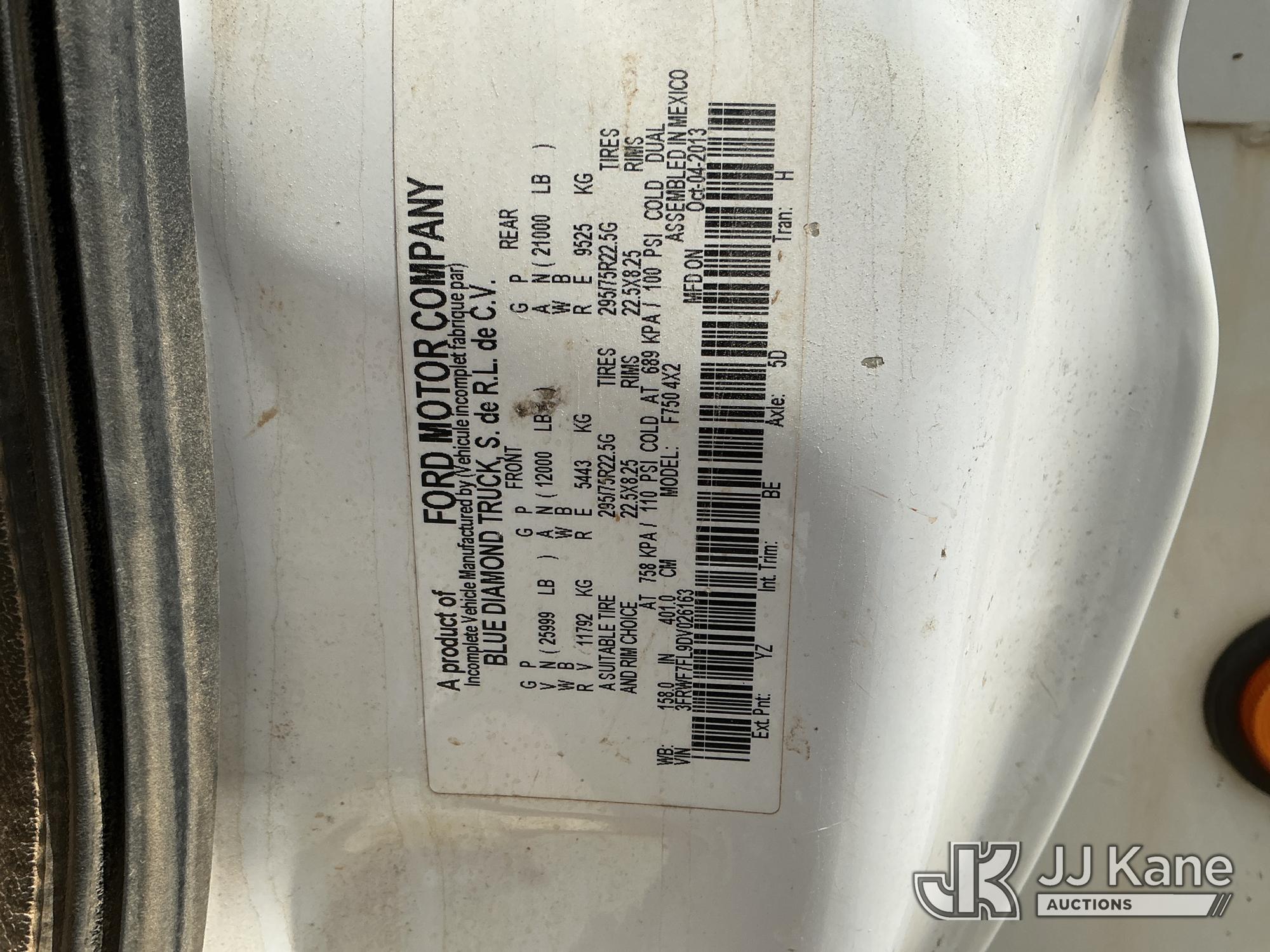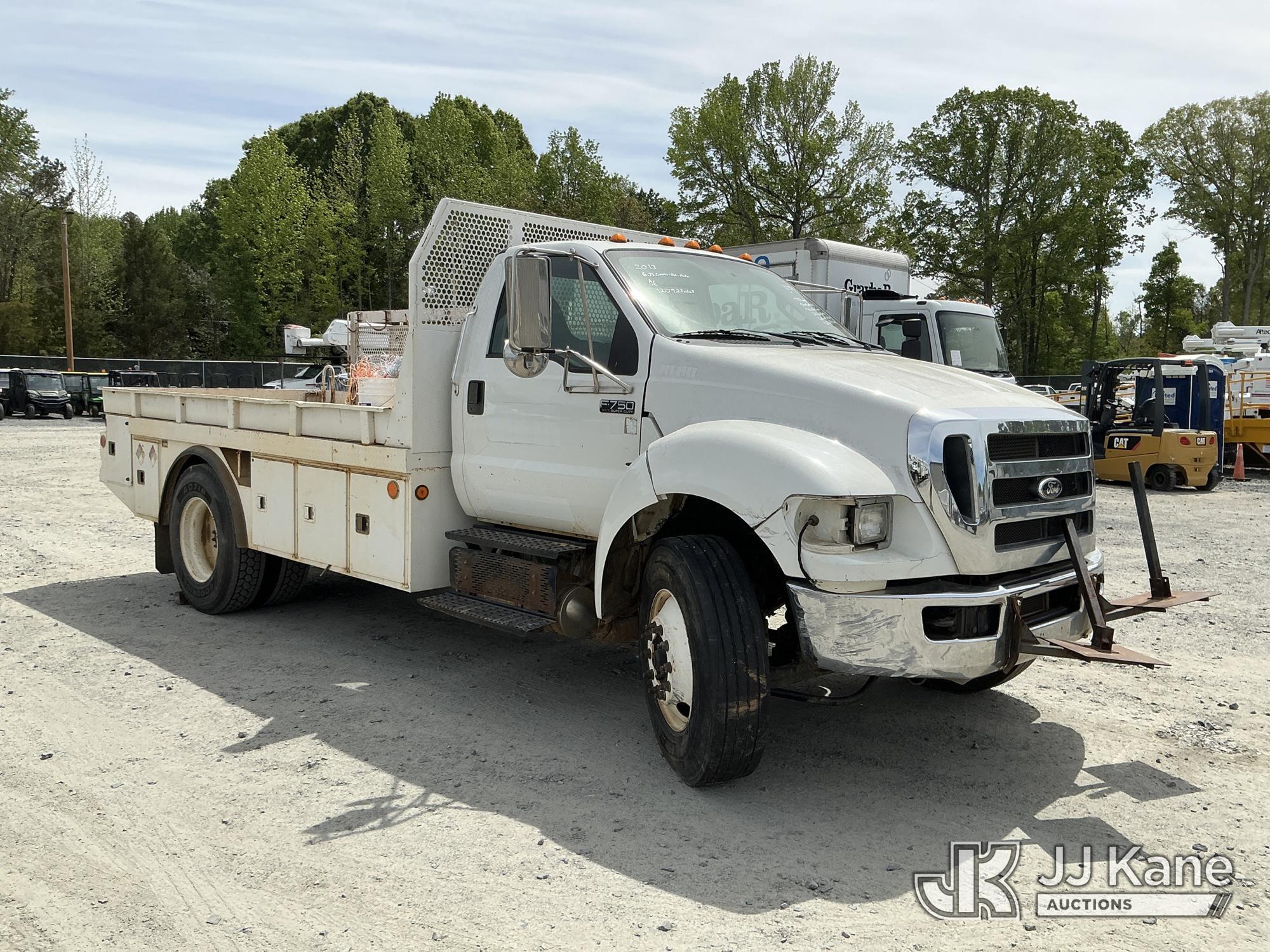 2013 Ford F-750 URD/Flatbed Truck, Cummins 6.7L diesel, Auto, A/C, with 14 ft flat bed, (120,923 miles) (Not Running, Condition Unknown, Driveshaft Removed, Steering Linkage Bent, ABS Light On) (Seller States: Involved In Accident, Damage To Front Bumper, Right Side Hood, Fuel Tank Split or Cracked) This is a Titled Item*