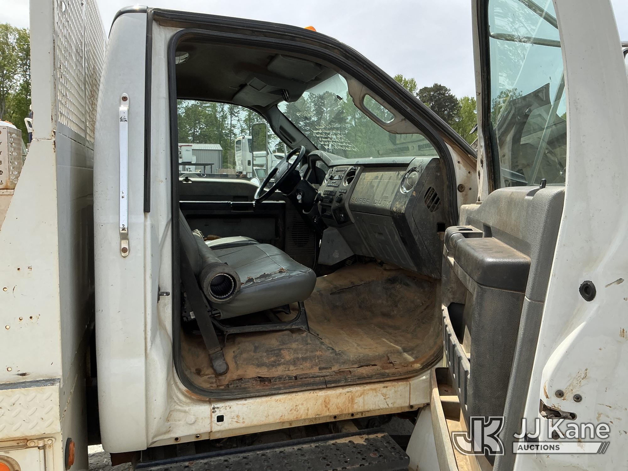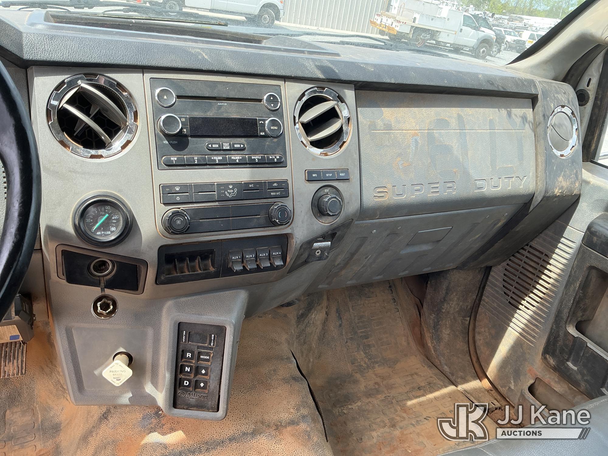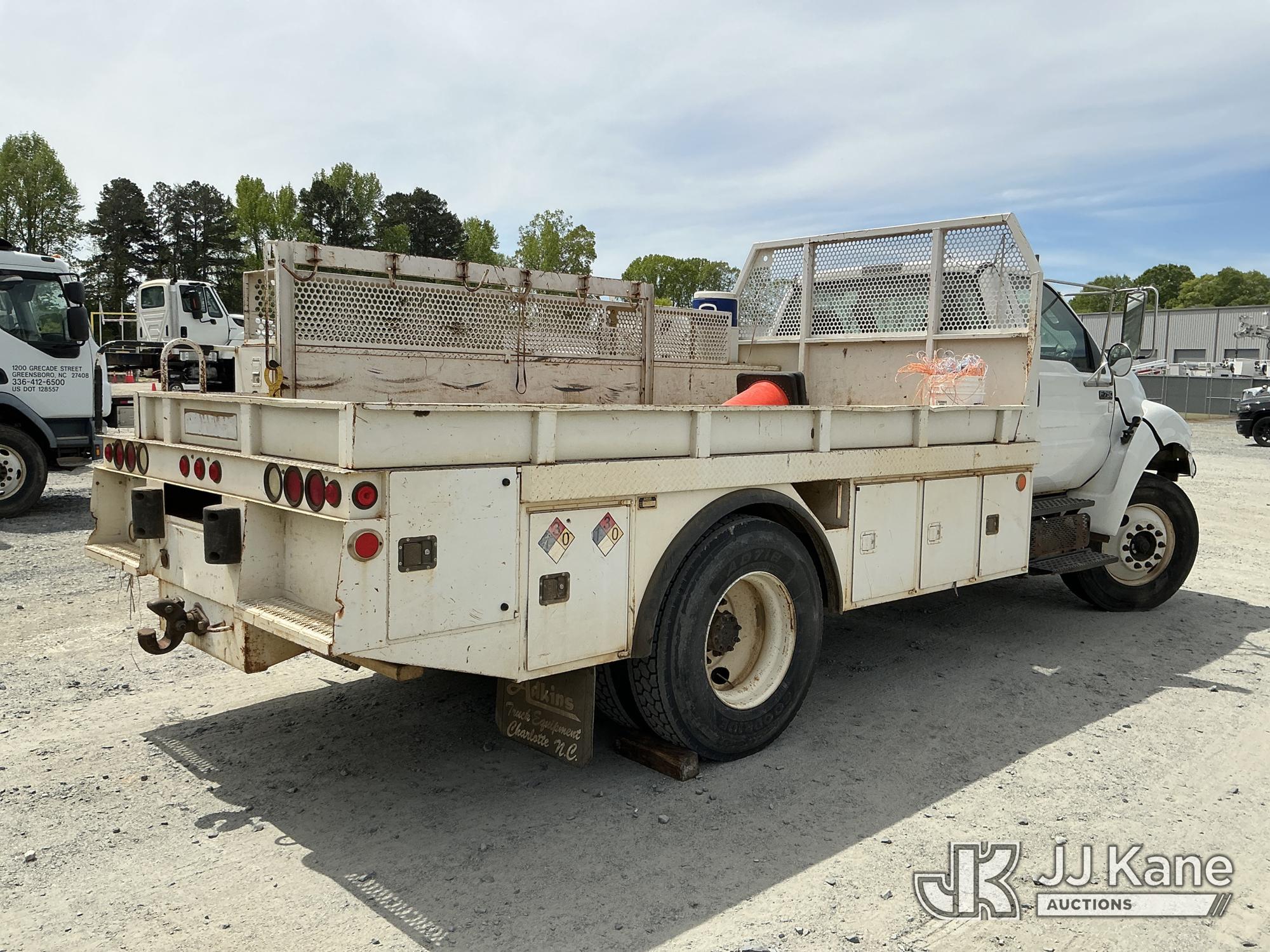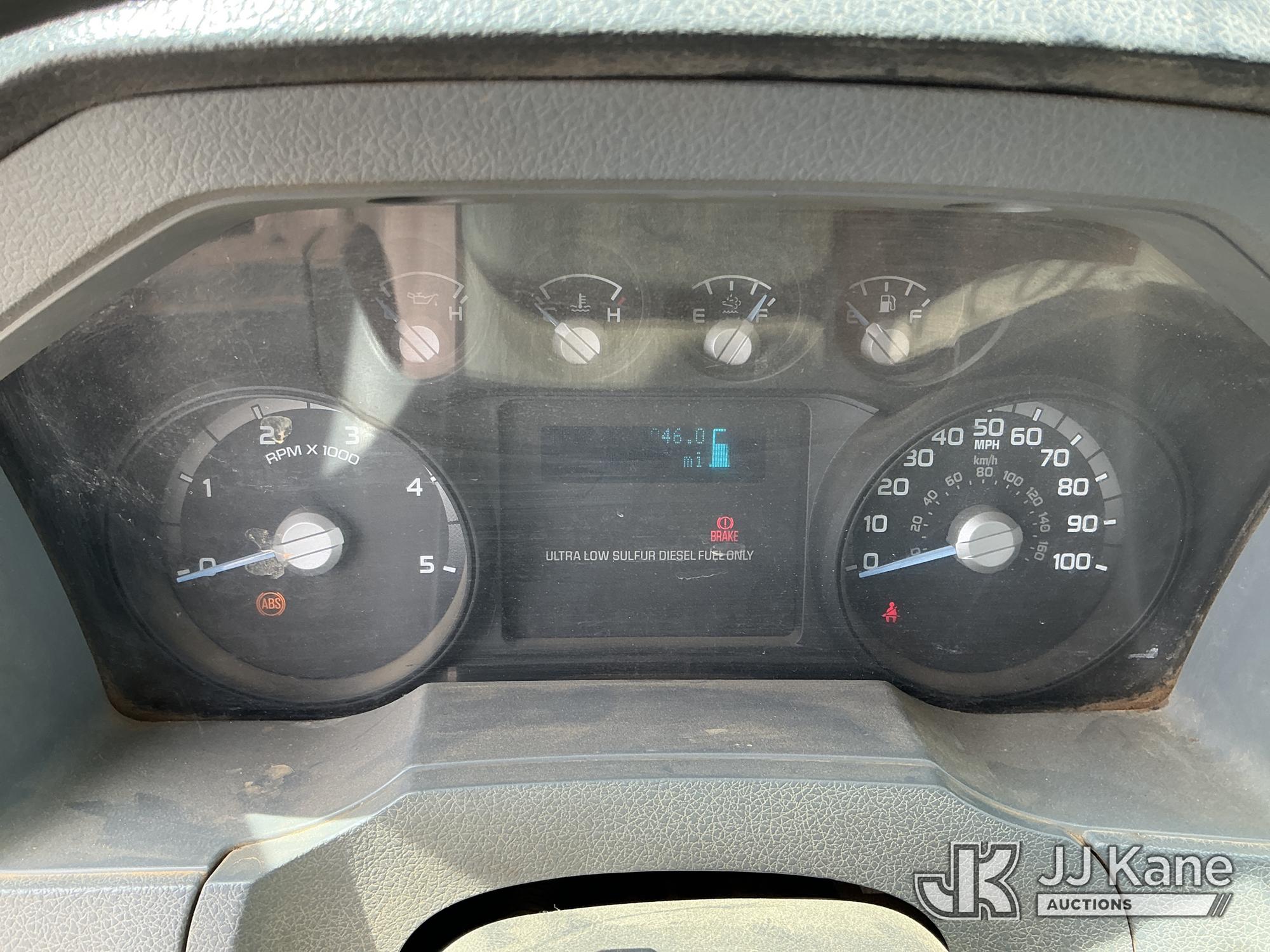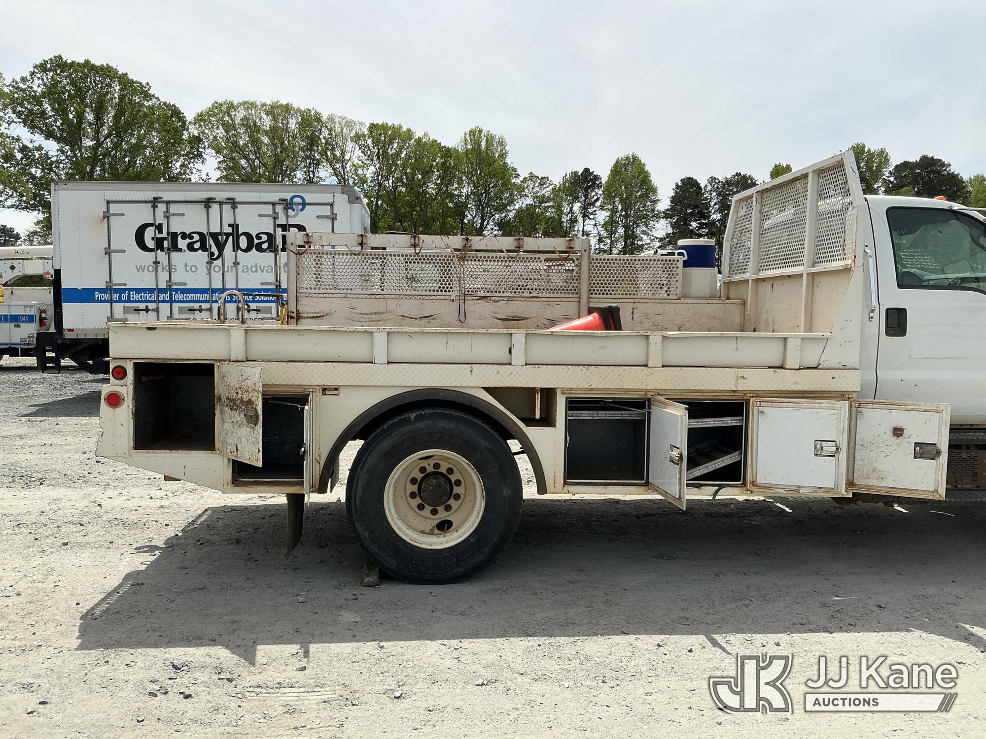 2013 Ford F-750 URD/Flatbed Truck, Cummins 6.7L diesel, Auto, A/C, with 14 ft flat bed, (120,923 miles) (Not Running, Condition Unknown, Driveshaft Removed, Steering Linkage Bent, ABS Light On) (Seller States: Involved In Accident, Damage To Front Bumper, Right Side Hood, Fuel Tank Split or Cracked) This is a Titled Item*