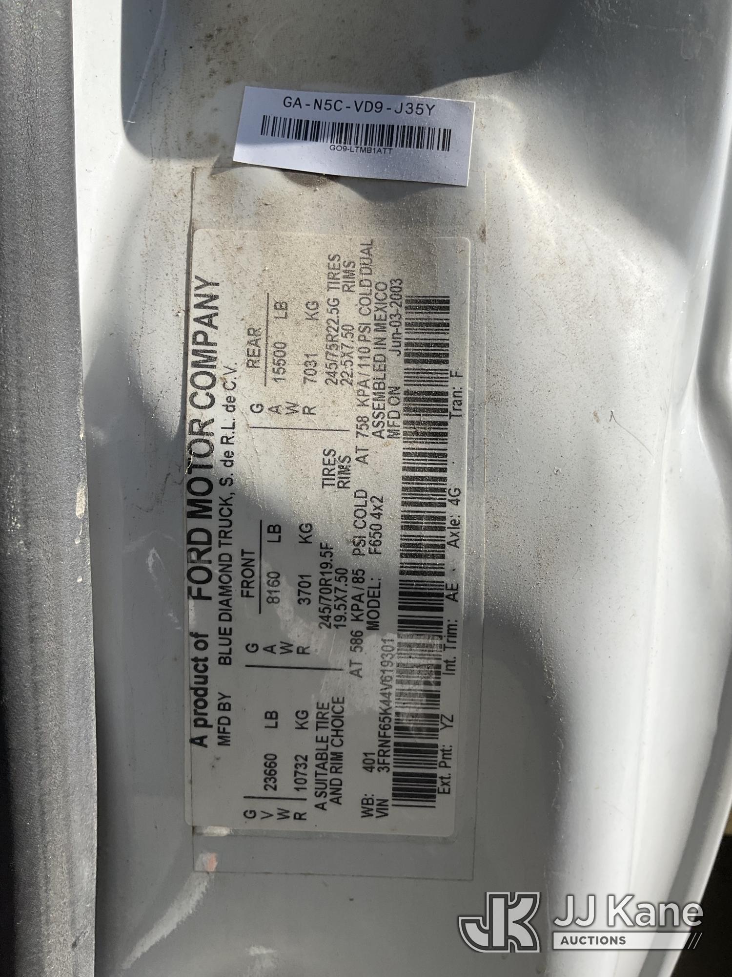 OK Champion S660-36-ATO, Rodder/Puller s/n 031224514, mounted behind cab on 2004 Ford F-650 Regular Cab 2WD DRW Sewer Rodder Truck, 6.0L V8 DIESEL 4X2, Auto, A/C, (Exempt from Odometer Disclosure - Reads 28,428 miles) (Runs, Moves & Upper Operates) (ABS Light) (Reads 2,687 hours) (Bidding Restricted to Licensed Vehicle Dealers Only), This is a Titled Item*