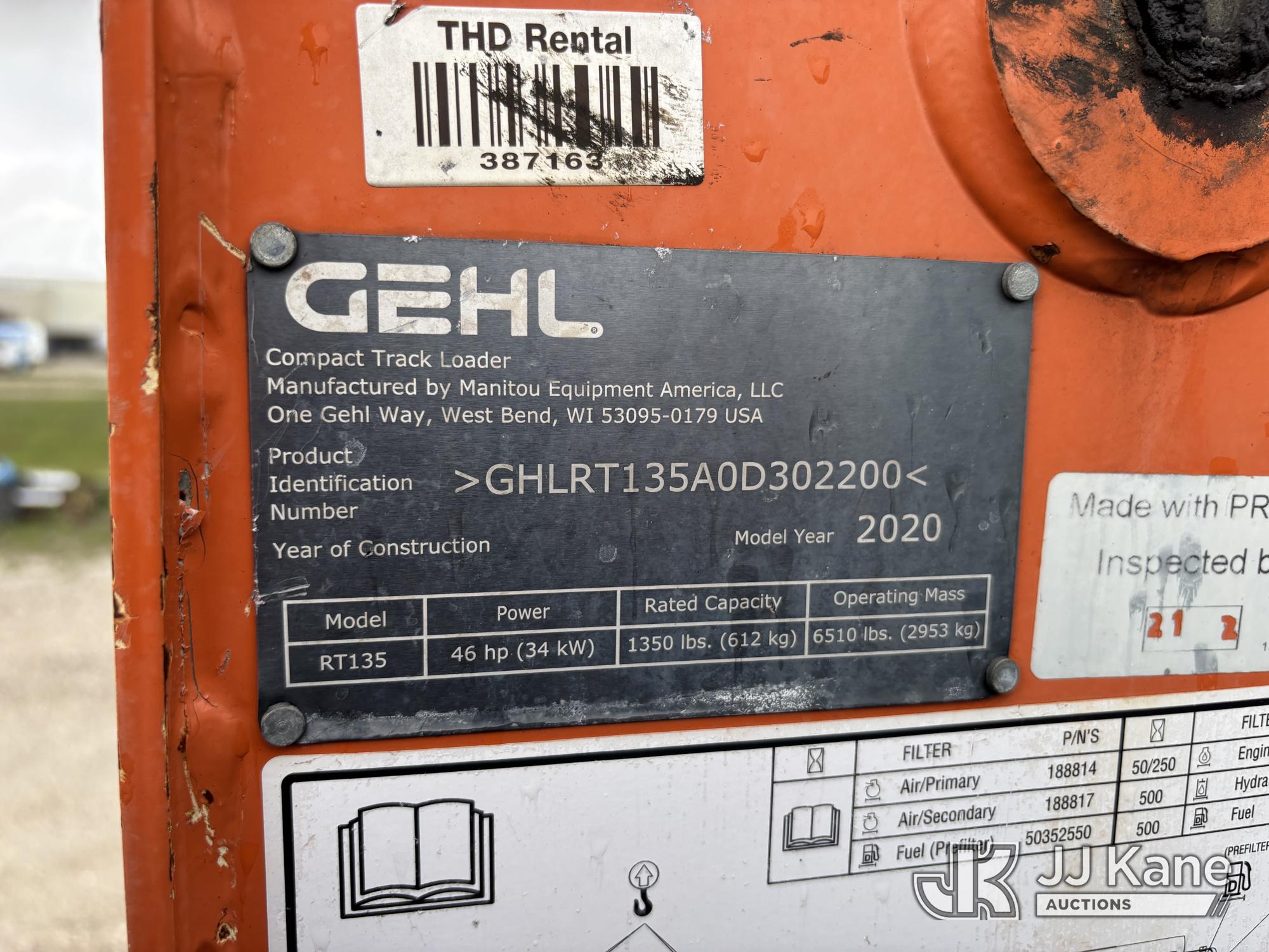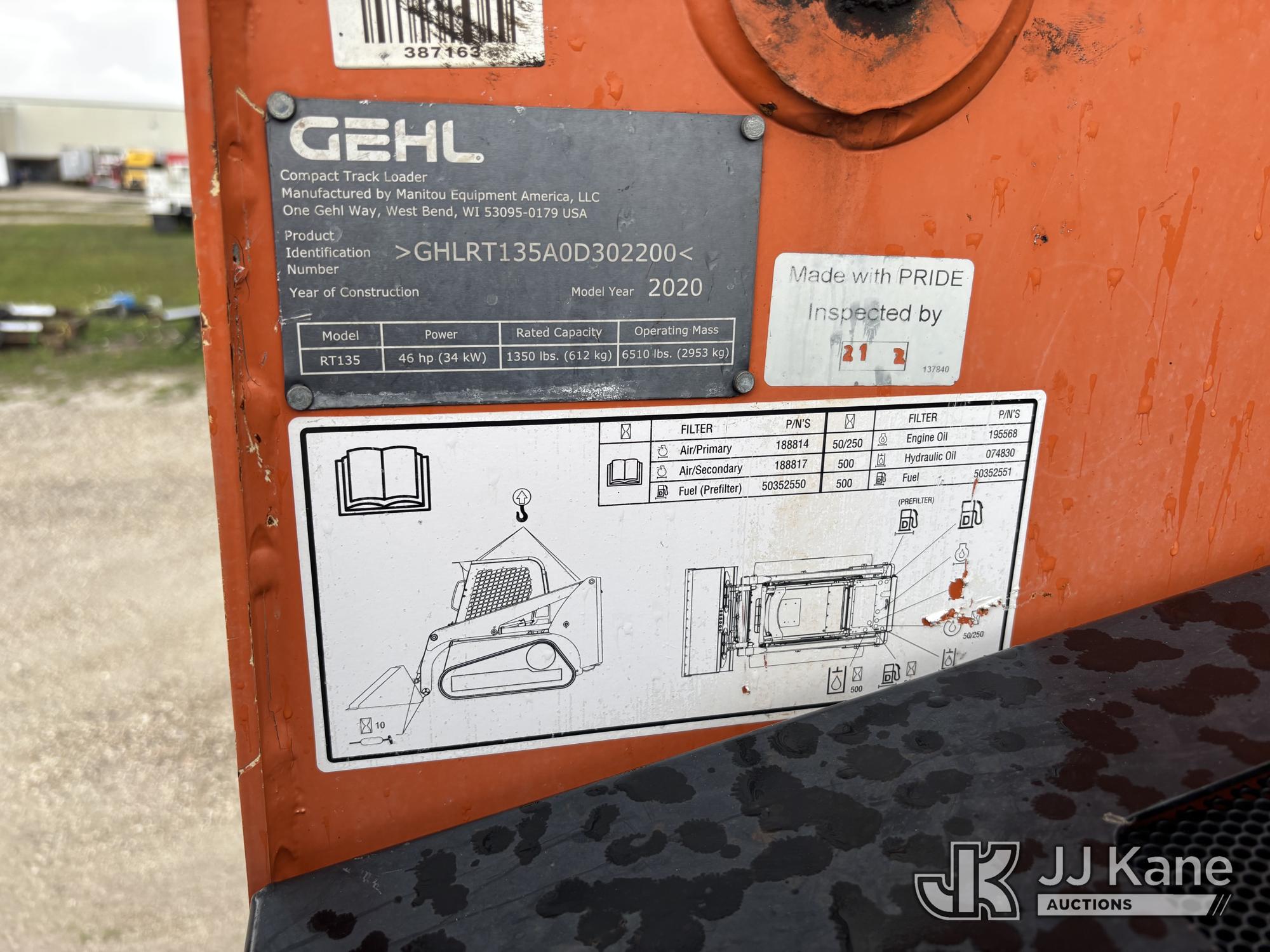 2020 Gehl RT135 Skid Steer Loader, s/n GHLRT135A0D302200, Yanmar diesel, Hydrostatic, with 4 ft. GP bucket, aux hydraulics, rubber tracks & ROPS, (Runs, Moves, & Operates) (Warning Lights On, Body & Paint Damage) (Reads 689 hours)*