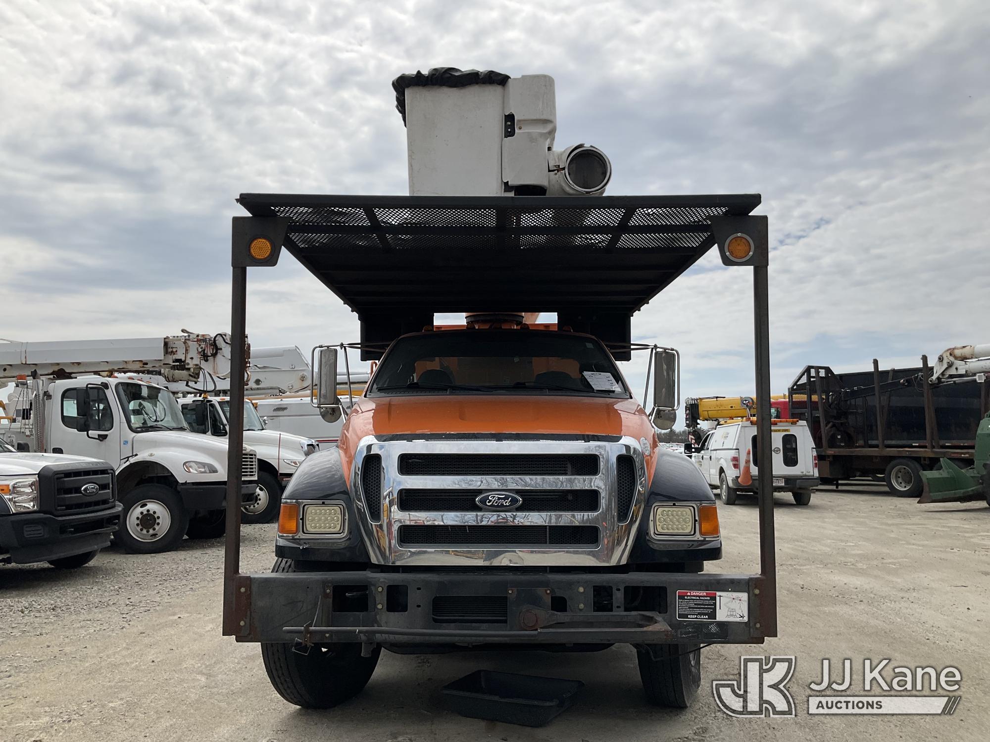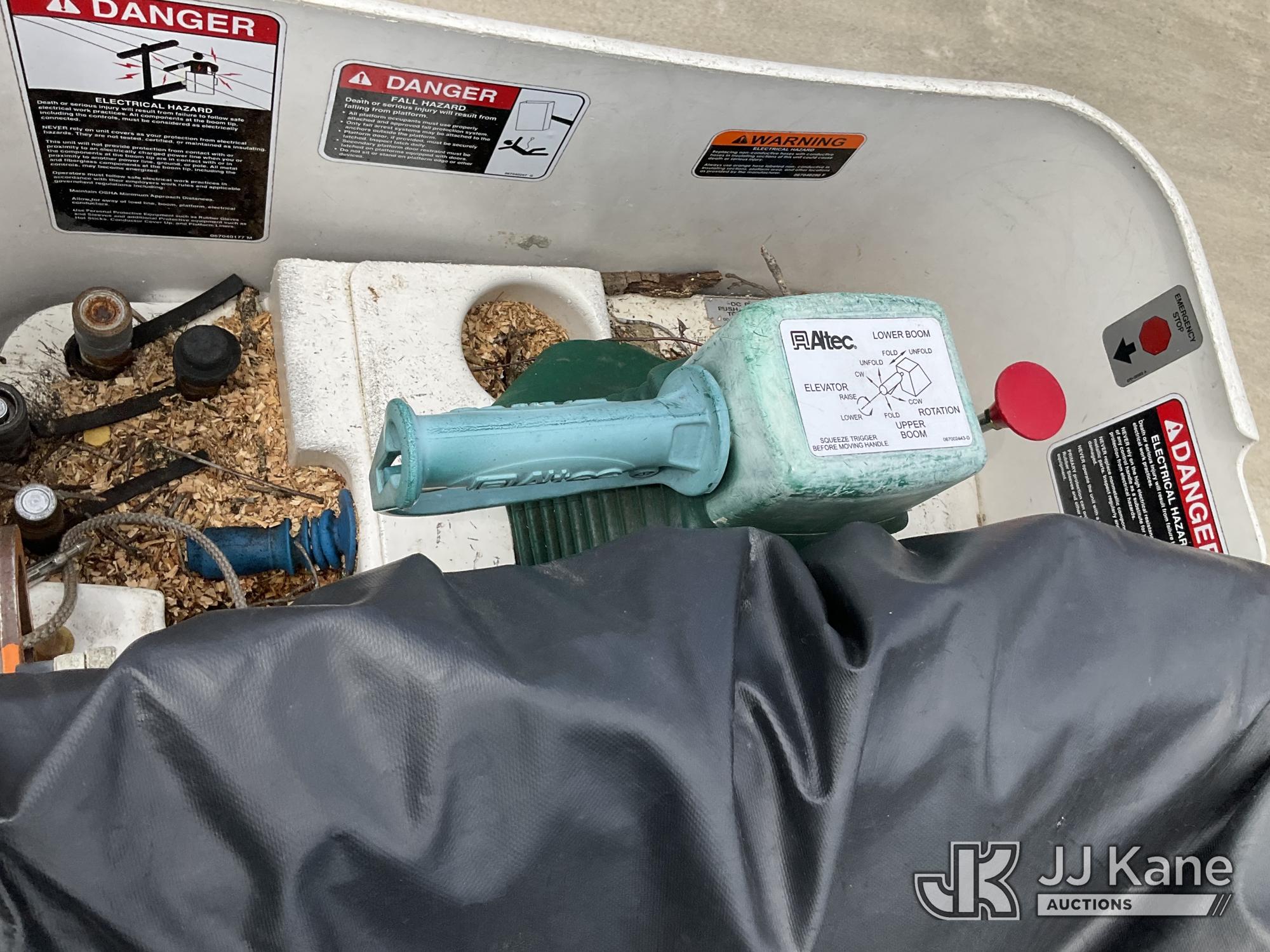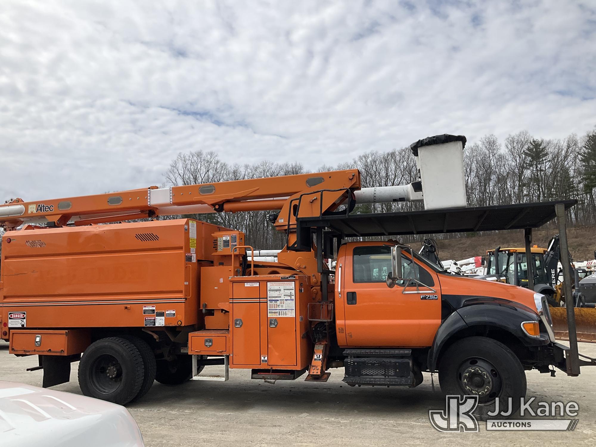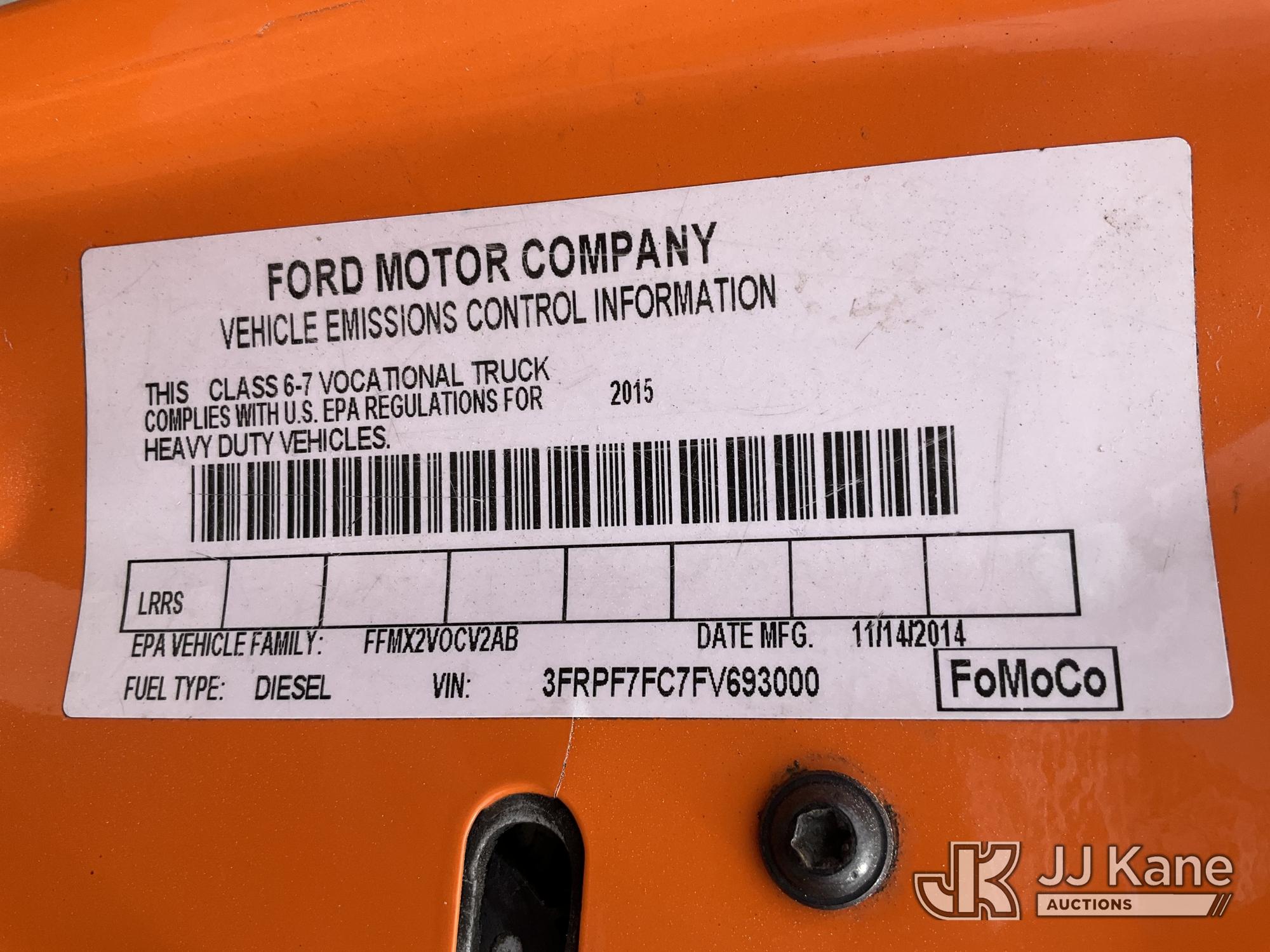 Altec LR760E70, 75 ft, Over-Center Elevator Bucket Truck s/n 0115FF3580, with single-man bucket & 2 hyd outriggers, mounted behind cab on 2015 Ford F-750 Chipper Dump Truck, Cummins 6.7L 4X2, diesel, 6-spd, A/C, (80,492 miles) (Not Running, Drivetrain & Upper Condition Unknown, Engine Failure, Hole In Block, Engine Oil Leak) This is a Titled Item*
