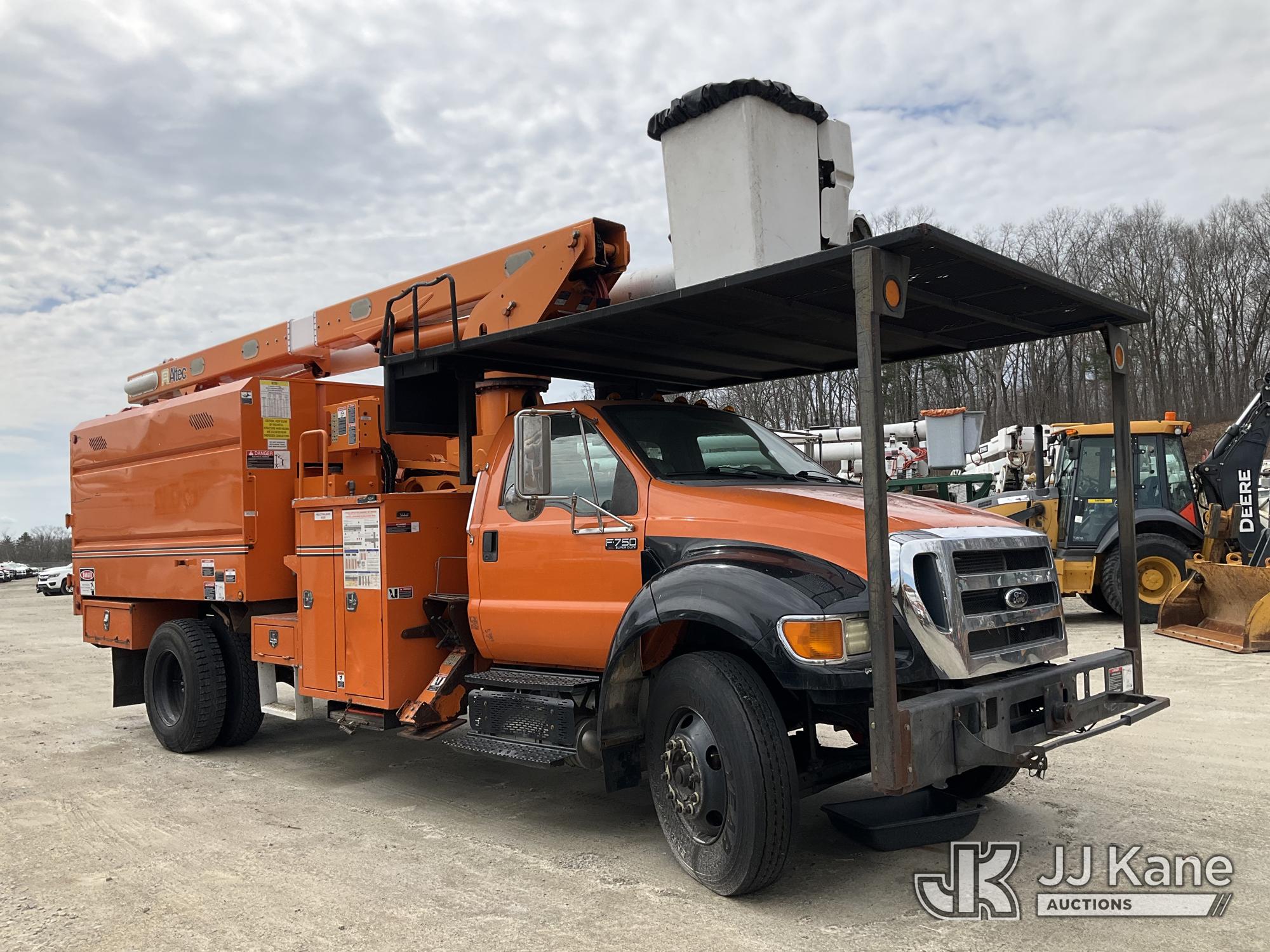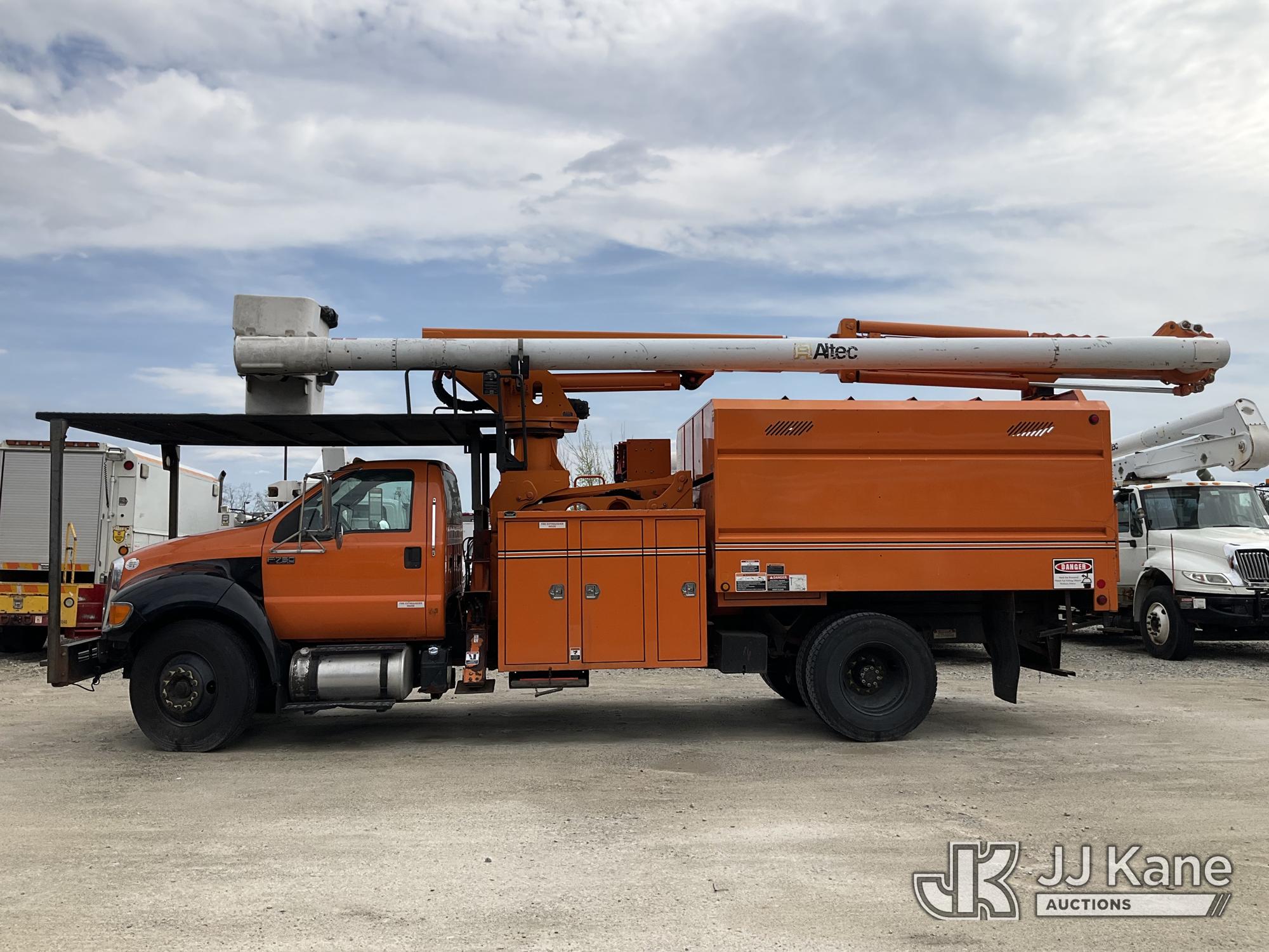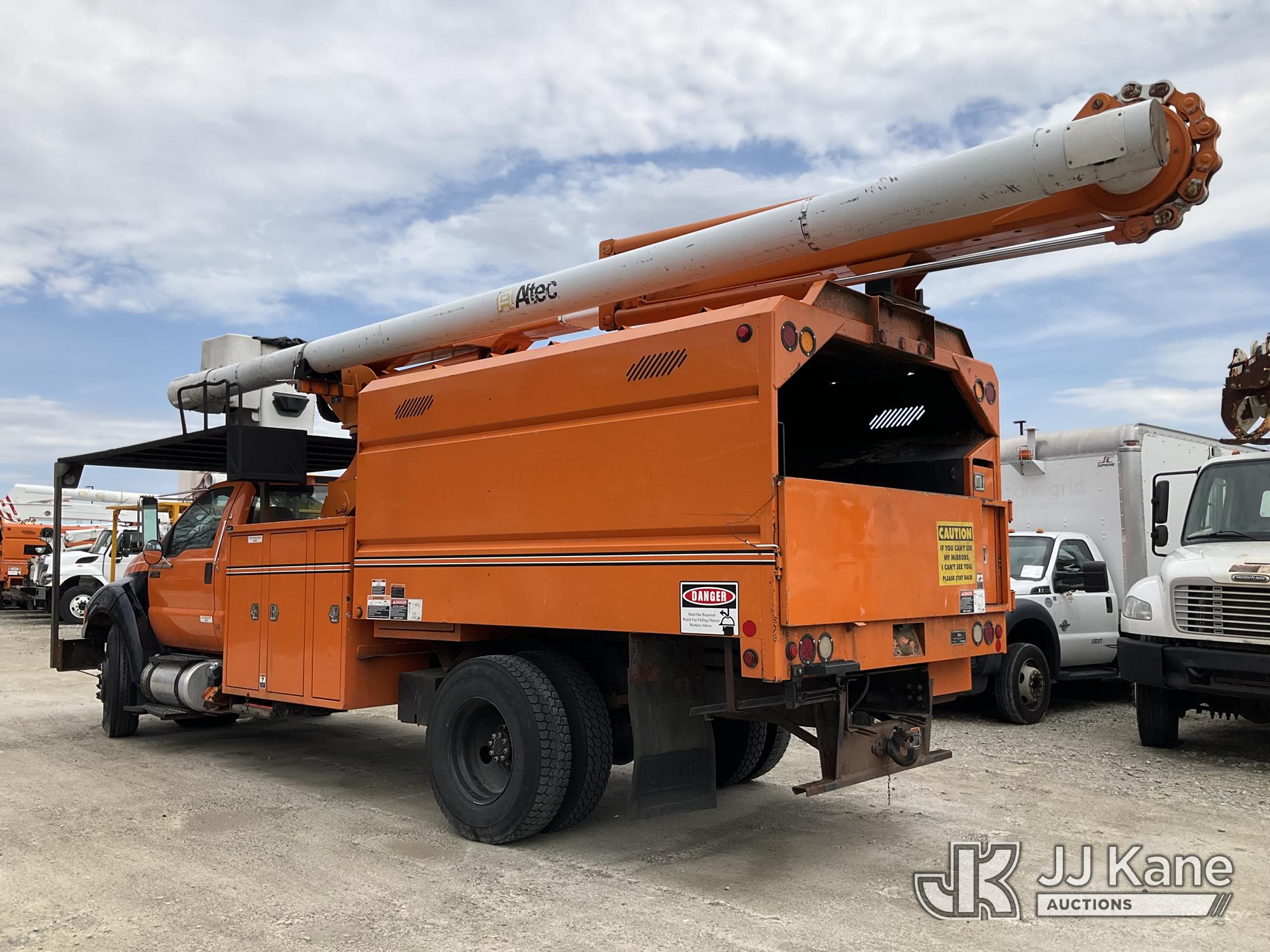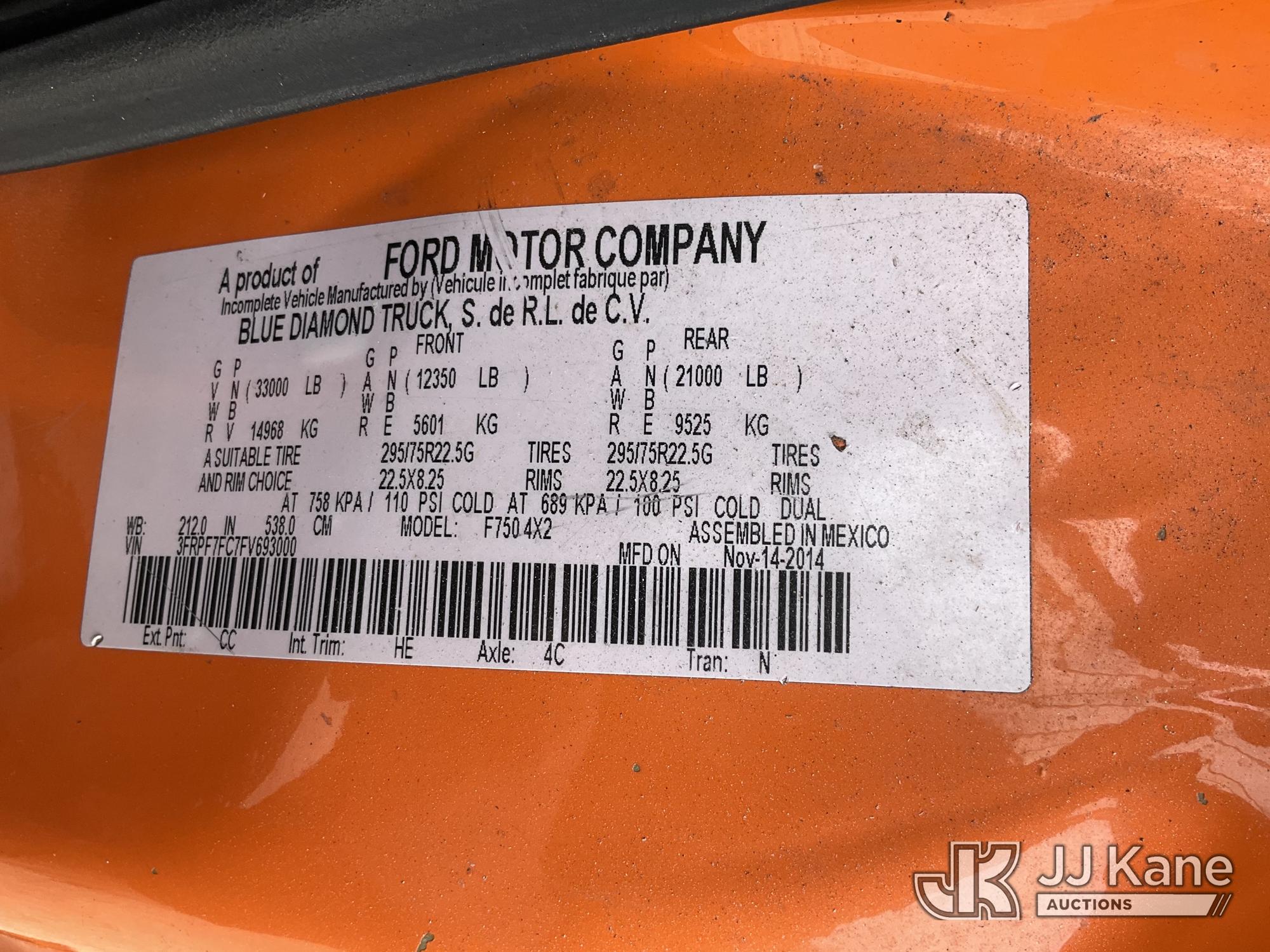 Altec LR760E70, 75 ft, Over-Center Elevator Bucket Truck s/n 0115FF3580, with single-man bucket & 2 hyd outriggers, mounted behind cab on 2015 Ford F-750 Chipper Dump Truck, Cummins 6.7L 4X2, diesel, 6-spd, A/C, (80,492 miles) (Not Running, Drivetrain & Upper Condition Unknown, Engine Failure, Hole In Block, Engine Oil Leak) This is a Titled Item*