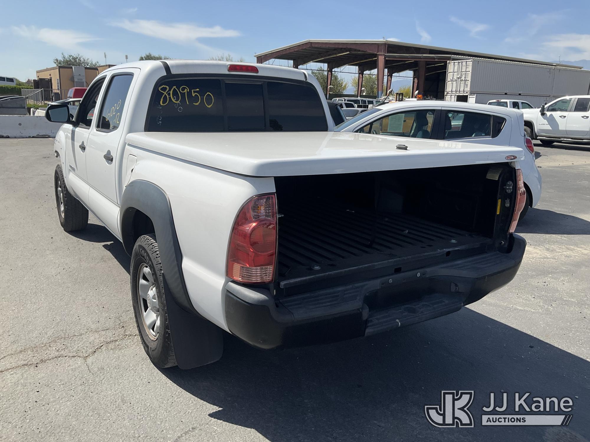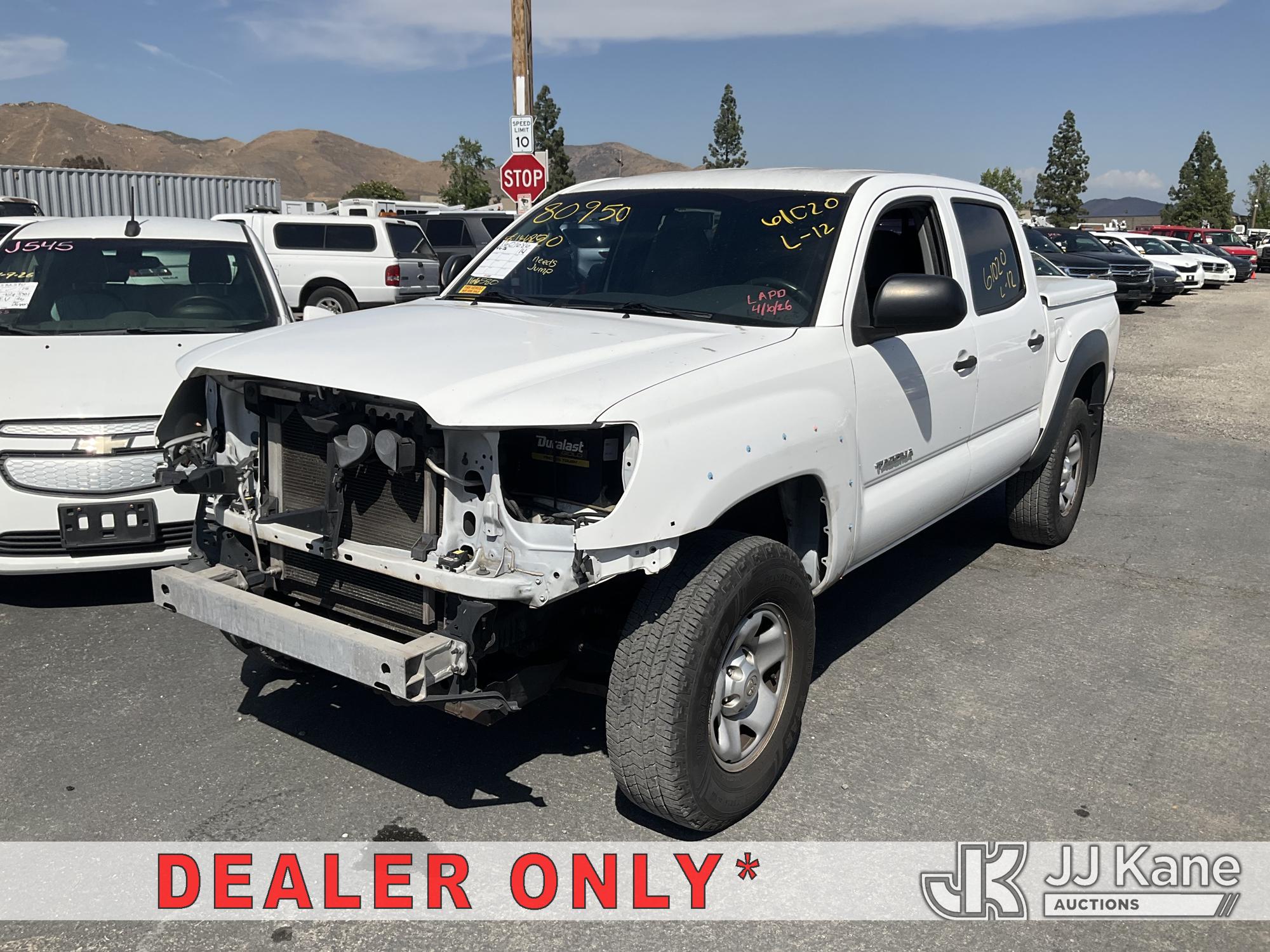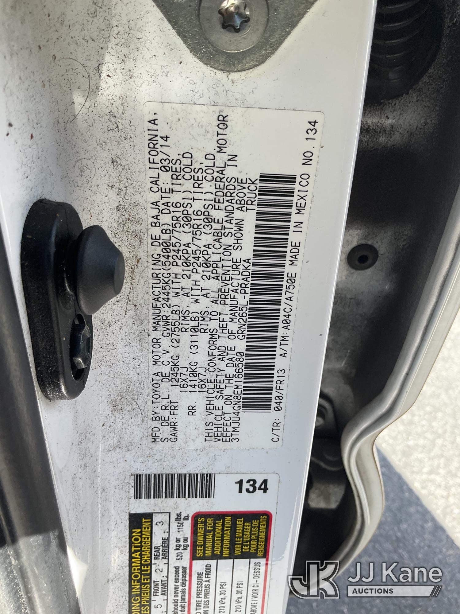 2014 Toyota Tacoma PreRunner Double Cab V6 5AT 2WD Crew-Cab Pickup Truck, s/n 3TMJU4GN8EM166580, 4.0L V6 DOHC 24V RWD, GAS, 5-Speed Automatic, A/C, with bed cover, (175,335 miles) (Runs & Moves, Traction Control Light On, Missing Front Bumper, Missing Side Panels, Missing Tailgate, Body Stripped Of Parts)(Vehicle previously used with a 'cold plate' or protected record registration. Due to the prior status, VIN may not appear in NMVTIS, which could affect DMV title/registration processing. Buyer acknowledges and accepts this) (Bidding Restricted to Licensed Vehicle Dealers Only), This is a Titled Item*