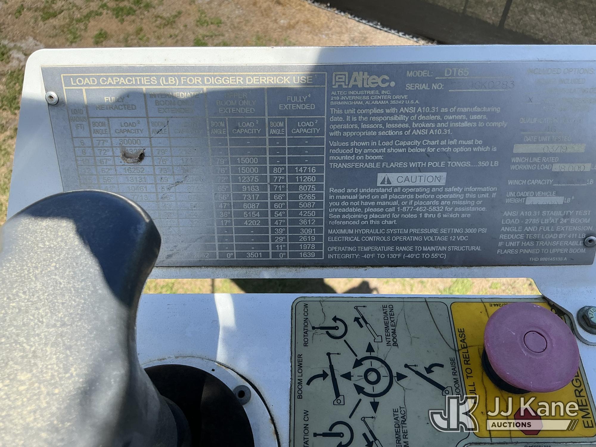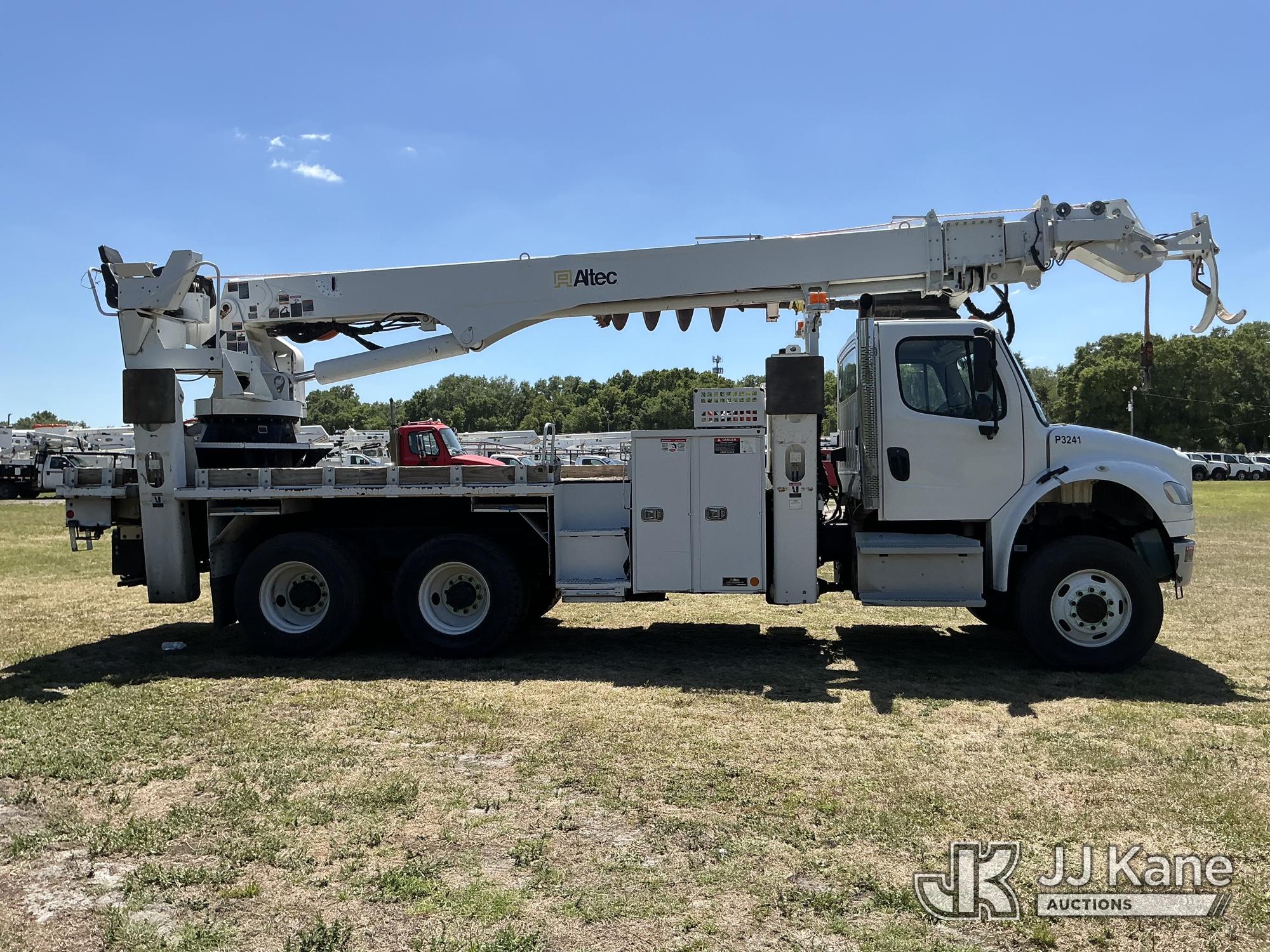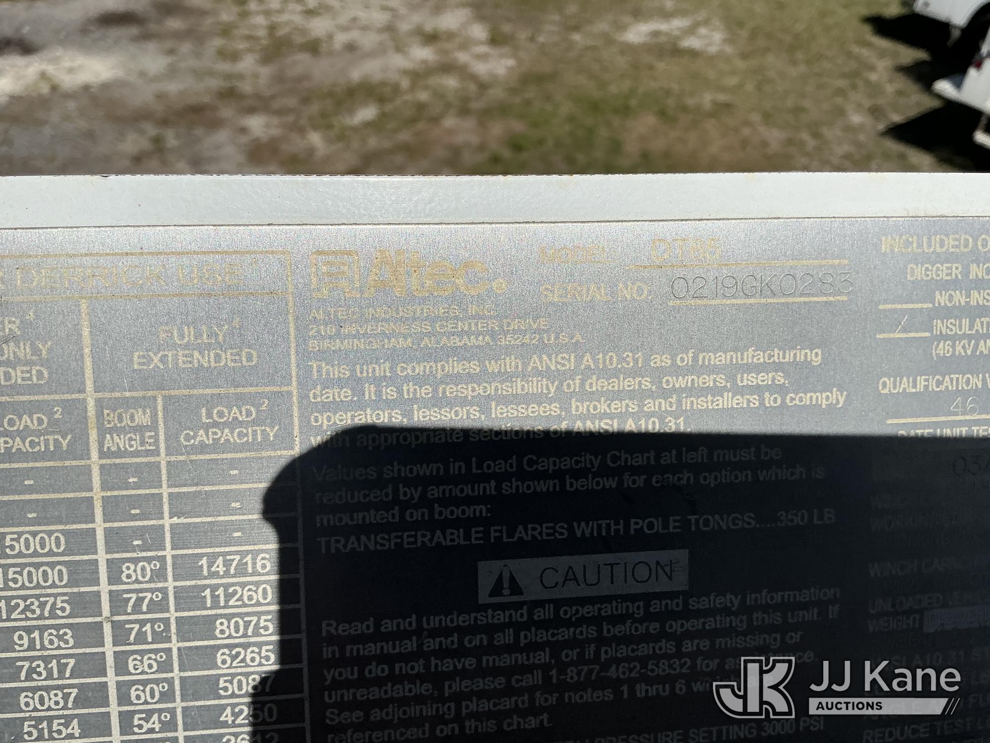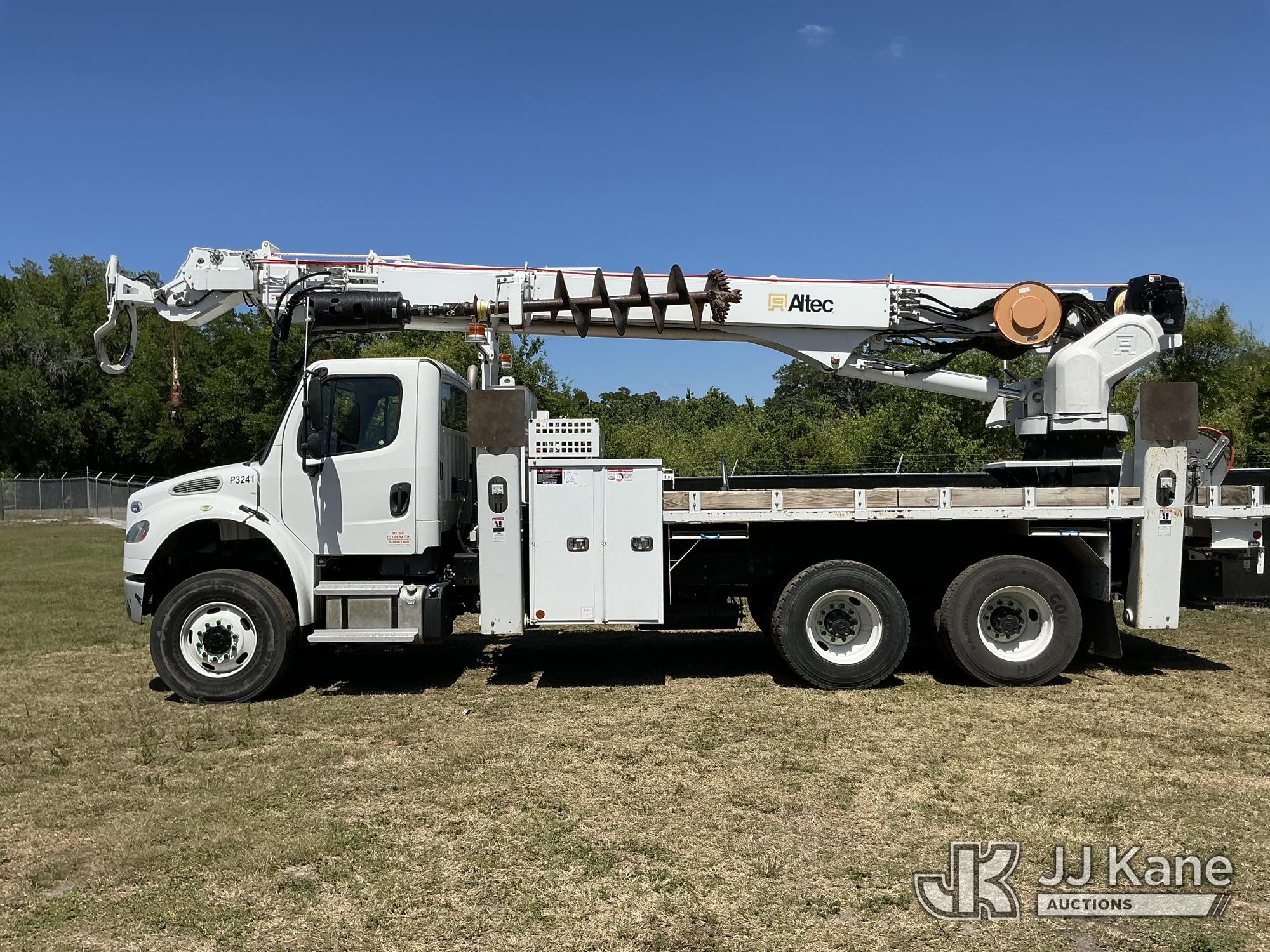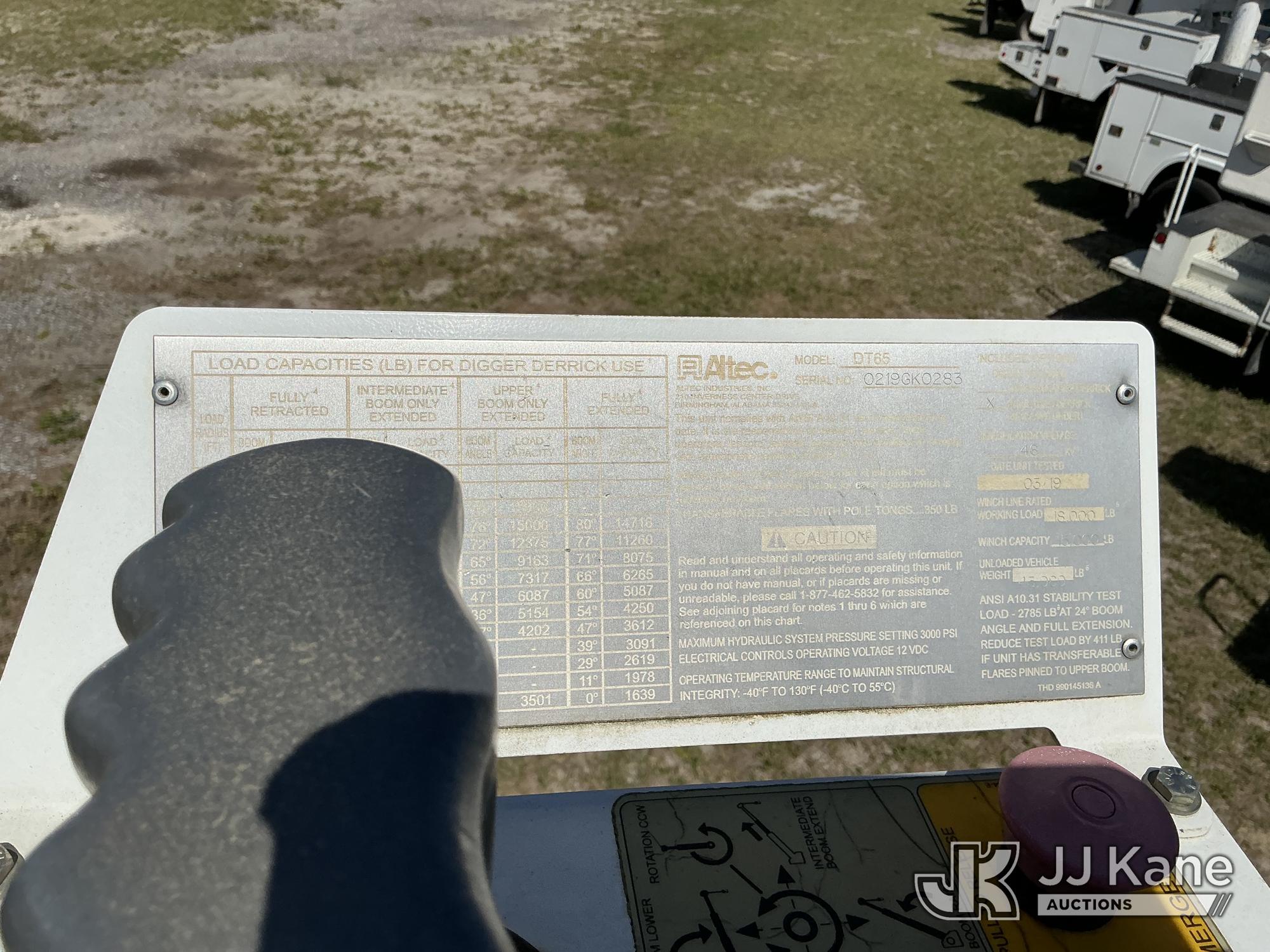 Altec DT65, 30,000 Lb Digger Derrick s/n 0219GK0283, with 65 ft. sheave height, 3 section hyd boom, 2 spd digger, heel winch, pole guides, riding console & 4 hyd outriggers, rear mounted on 2019 Freightliner M2 106 6x6 Flatbed/Utility Truck, Cummins L9 9.0L L6 diesel, Auto, A/C, (33,881 miles) (Runs, Moves, Upper Operates) (FL Residents Purchasing Titled Items – tax, title & registration fees will be collected at the maximum rate of $400.00 under 25,999 and $800.00 for Over 26,000 and $250.00 trailers – Proof of insurance is mandatory; Out of State Residents Purchasing Title Items – tax will be collected based upon your state rate.) (Reads 4,146 hours) This is a Titled Item*