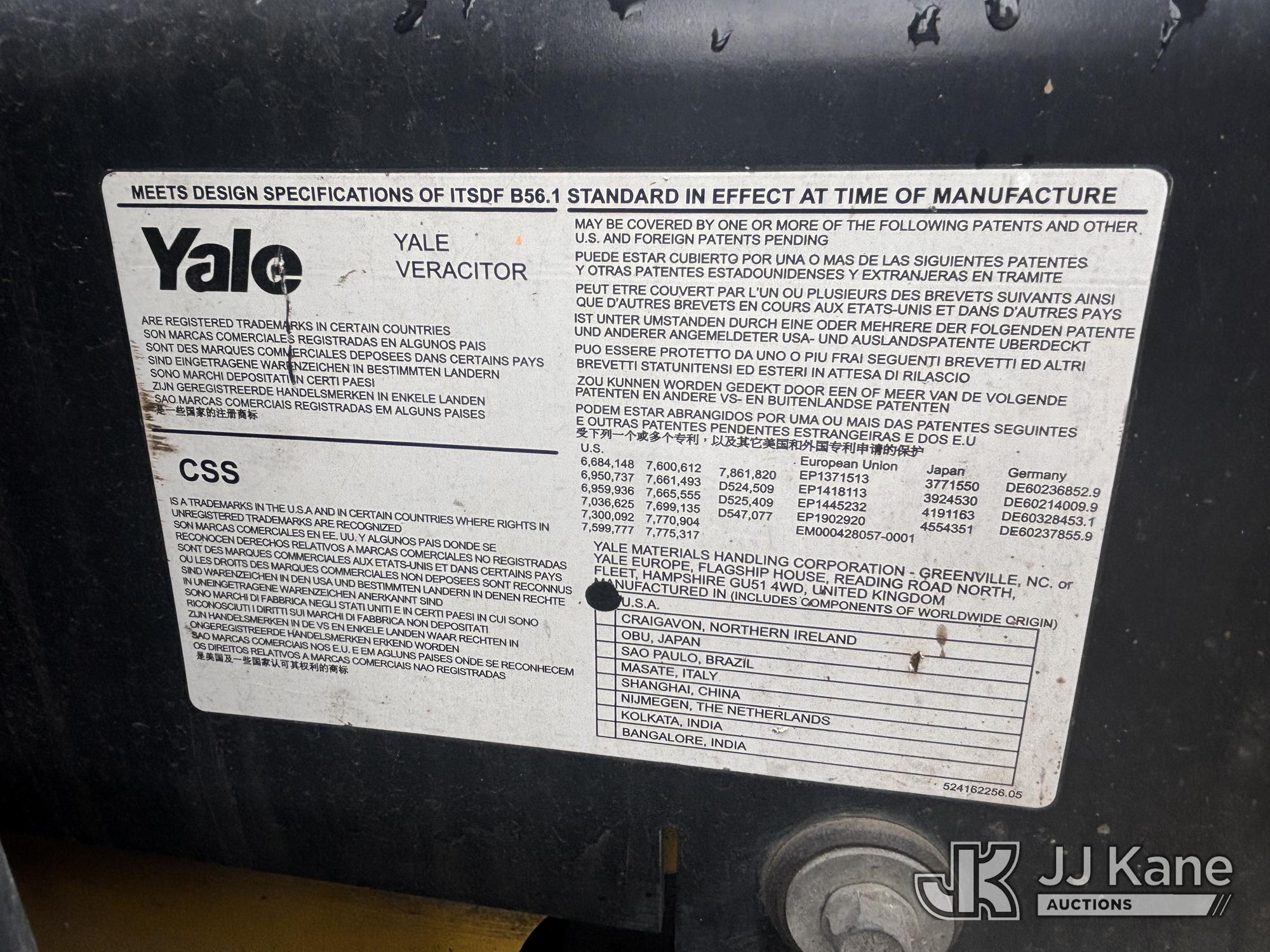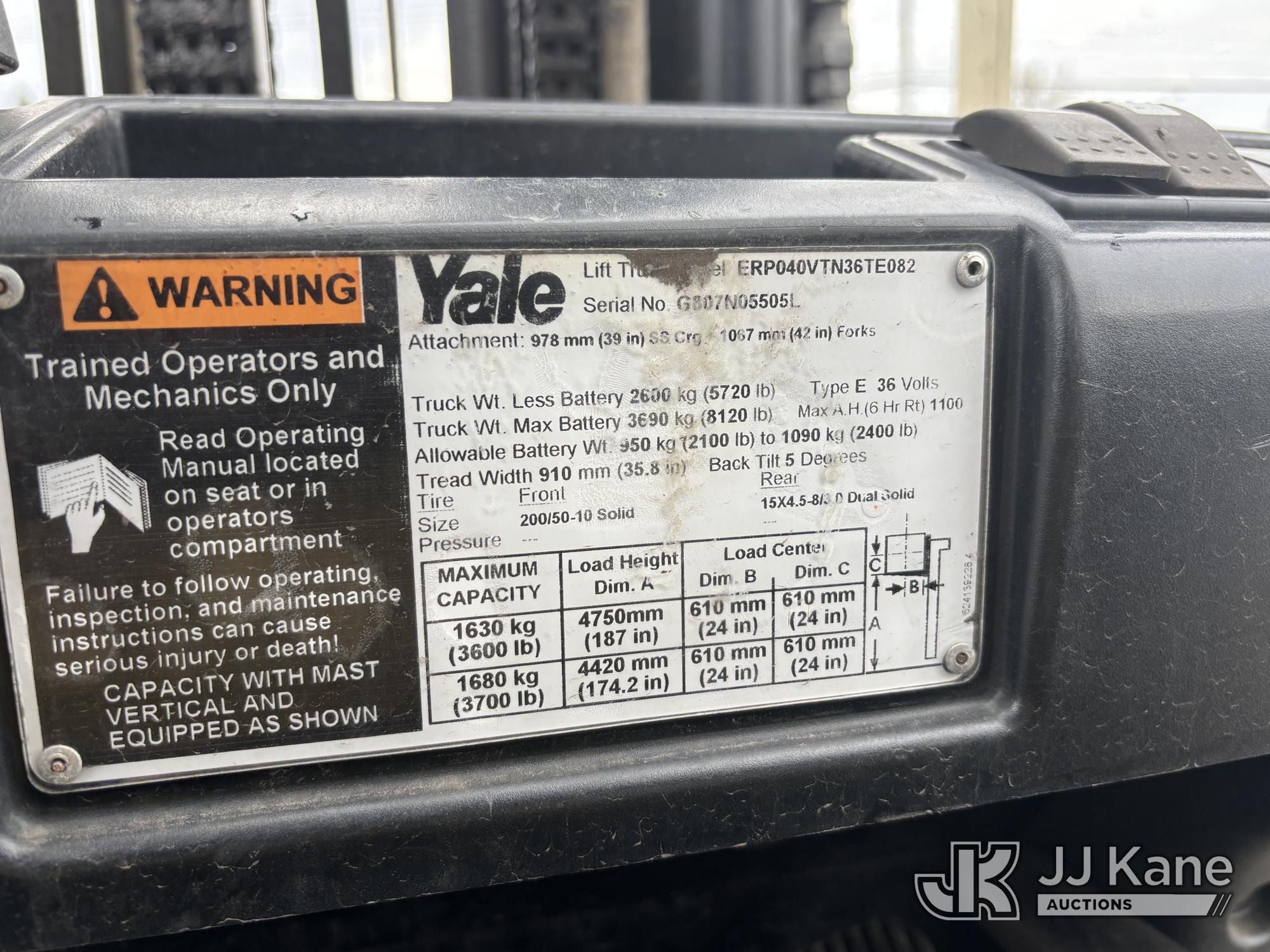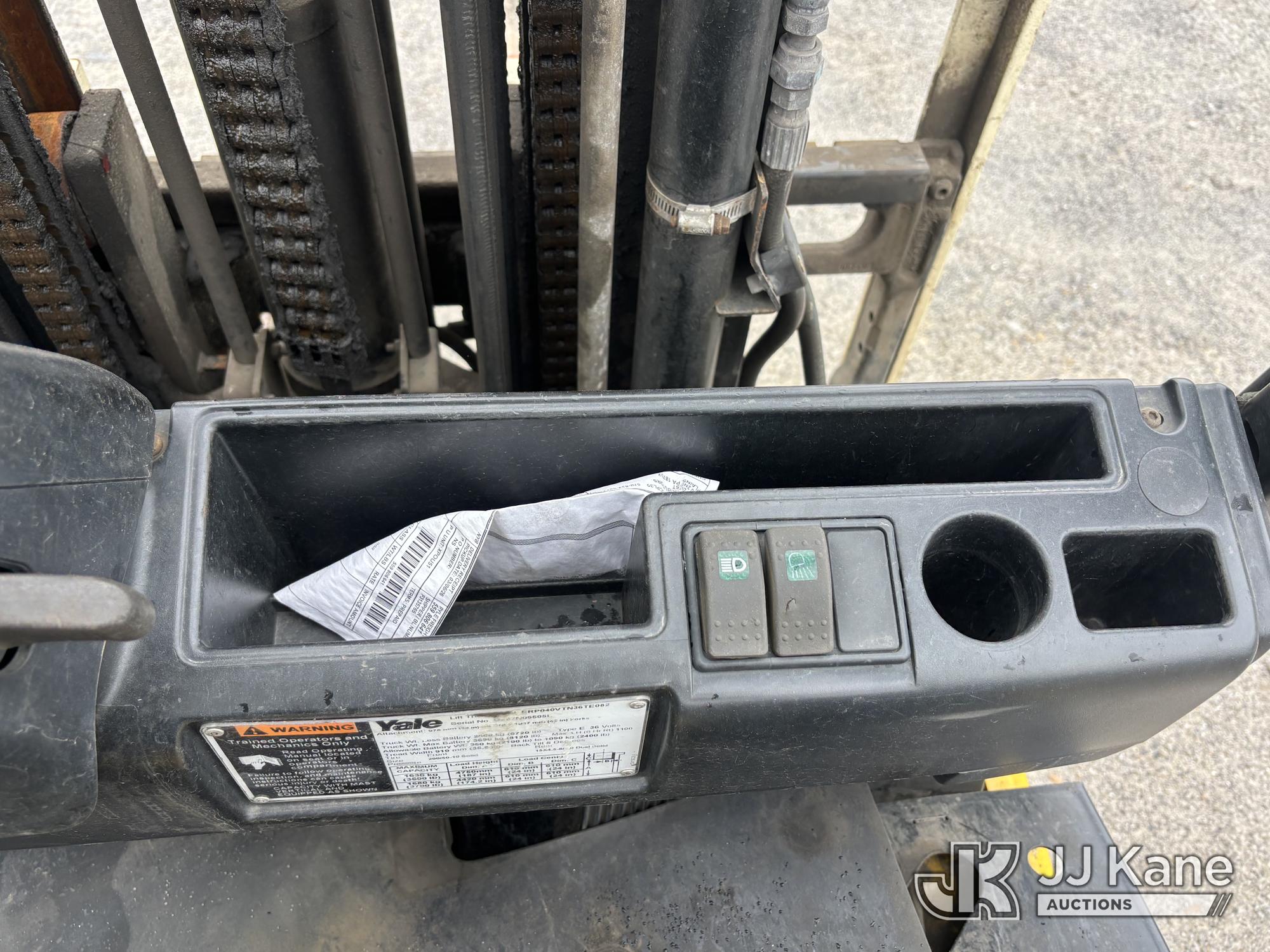 2013 Yale ERP040VTN36TE082 Forklift, s/n G807N05505L, Electric 36 V with 3,700 lb cap, side shift, (Runs, Moves, & Operates, Only Moves In Reverse, Operator's Seat Assembly Is Jammed, Buyer Responsible For Loadout, Scratches, Dings, & Dents, Rust Present)*
