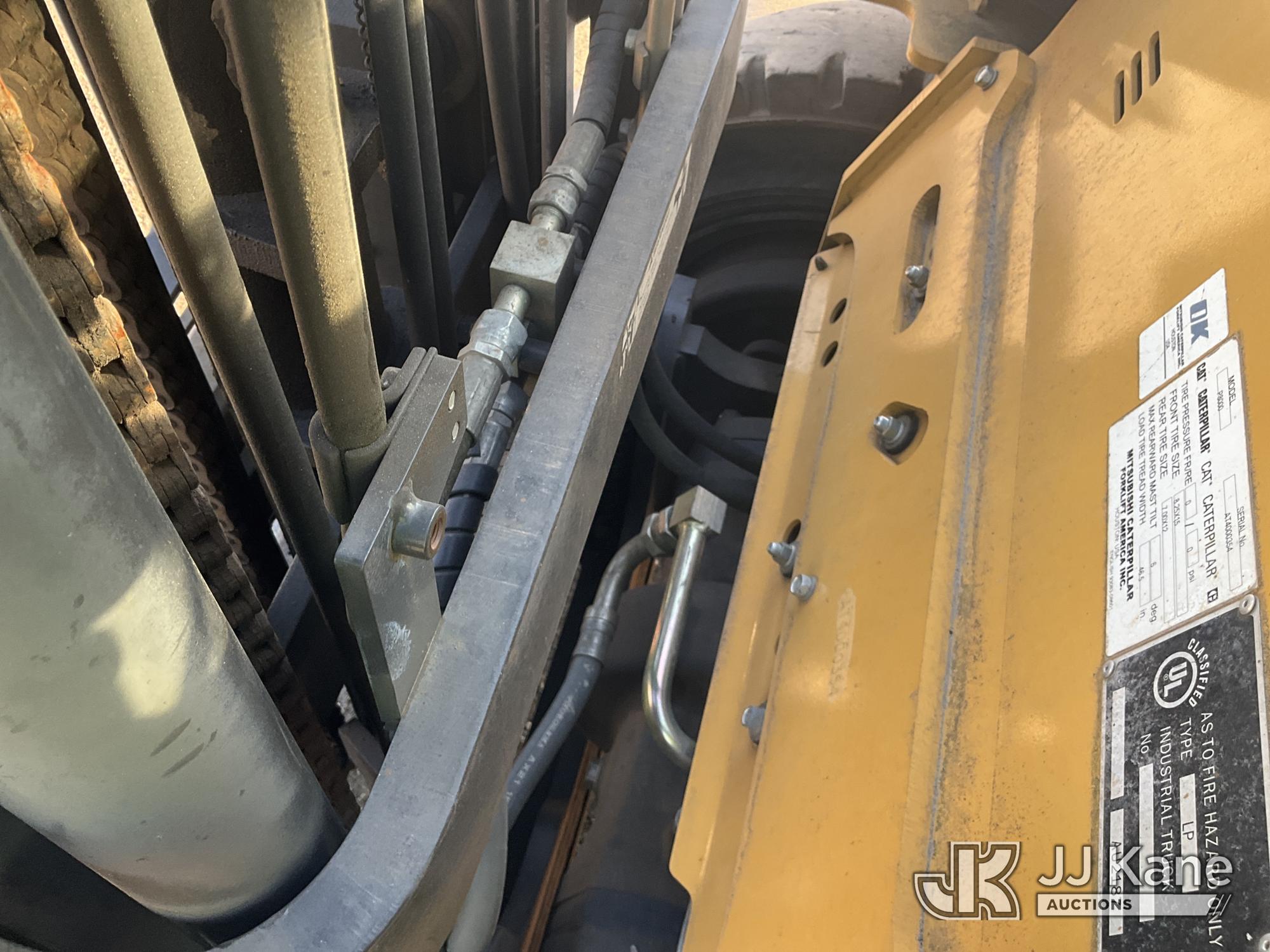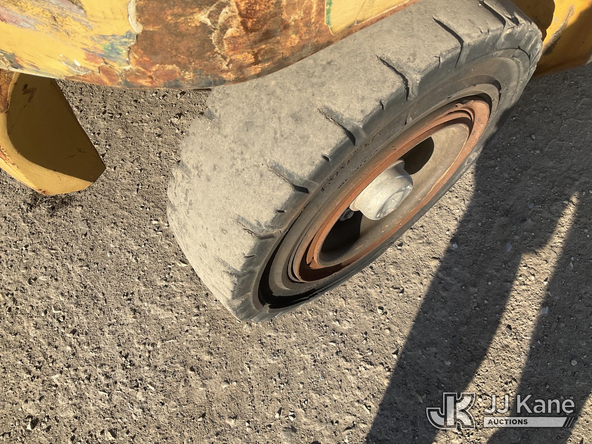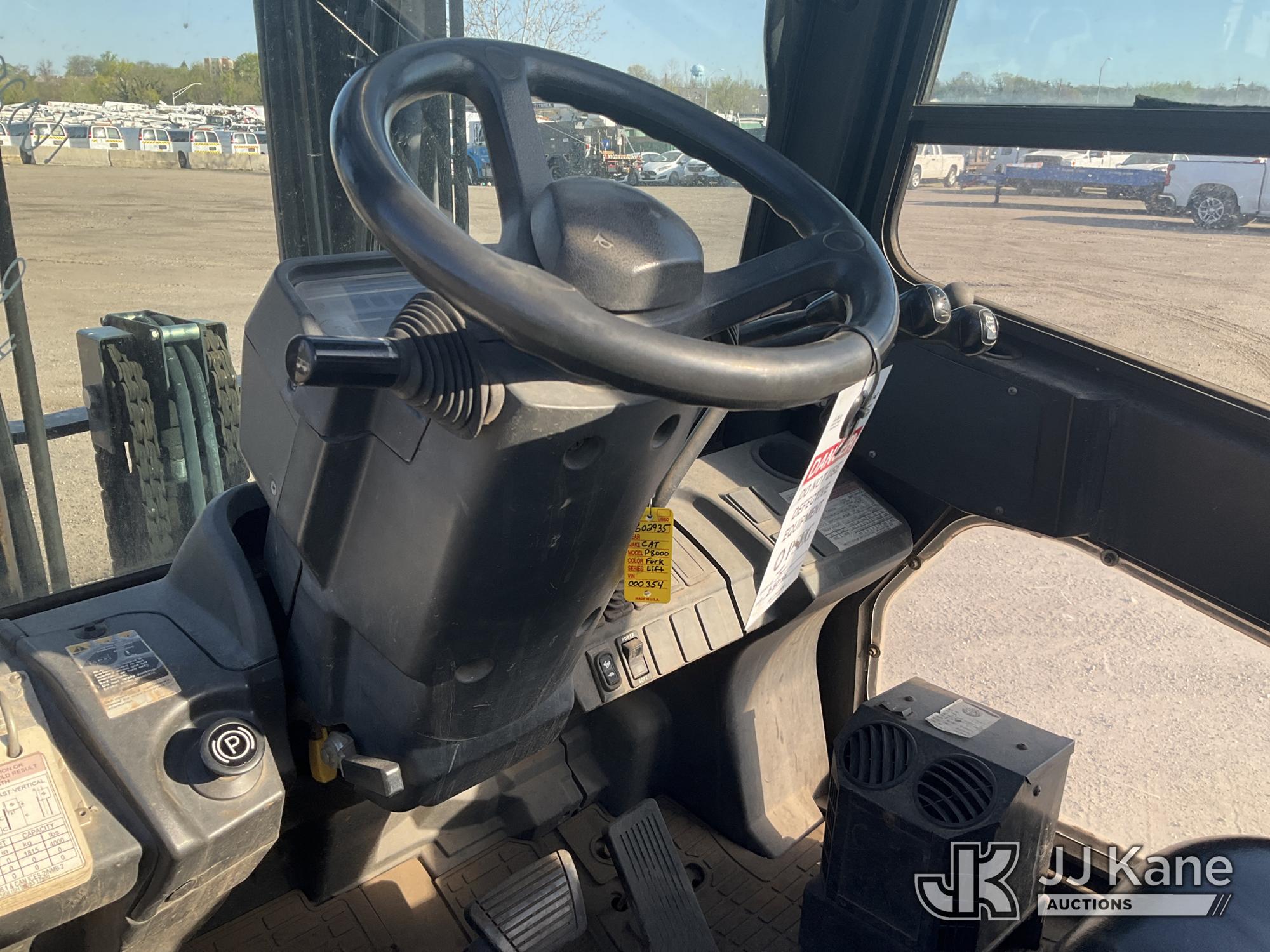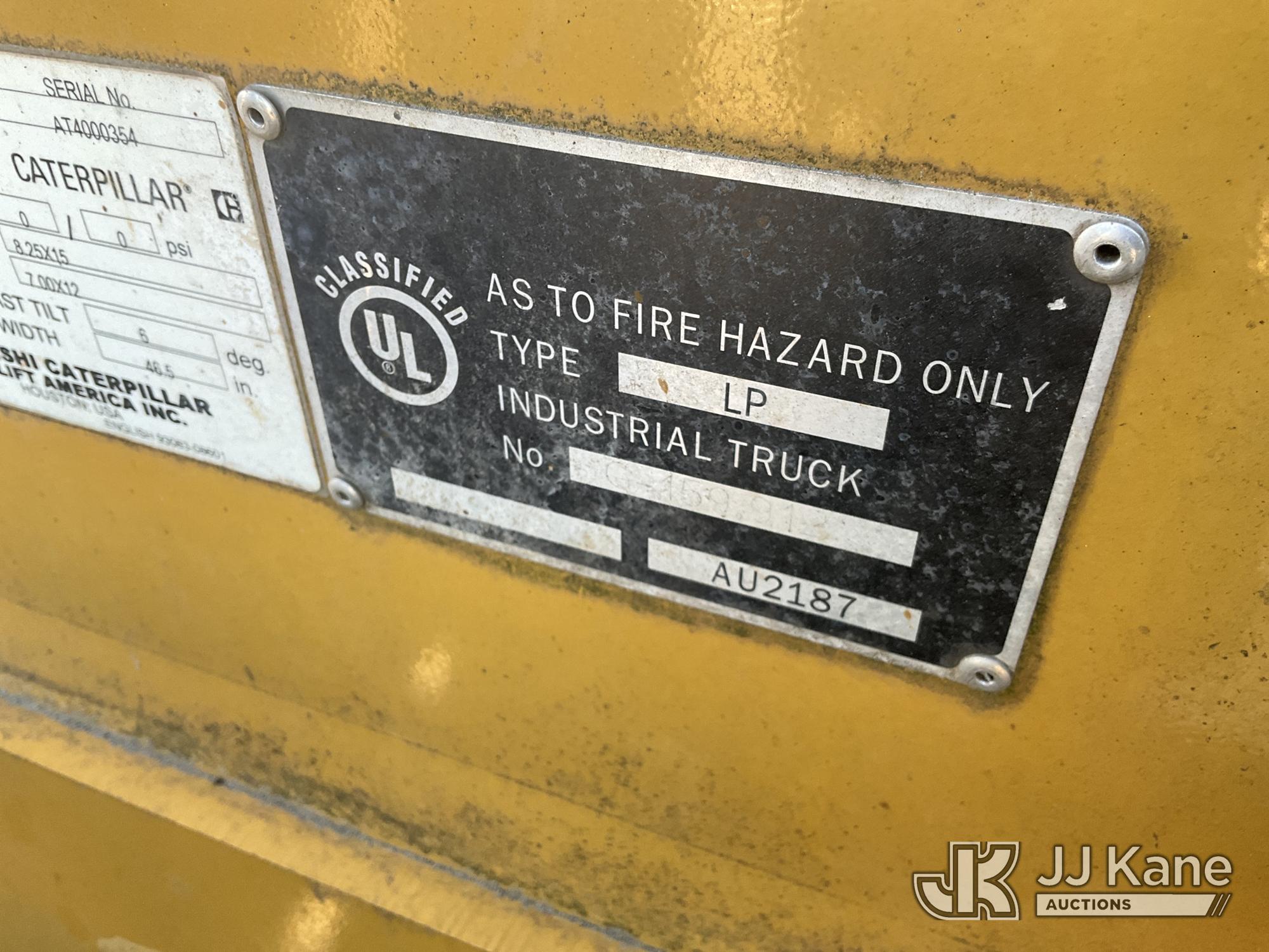 Caterpillar P8000 Solid Tired Forklift, s/n AT4000354, LPG, Shuttle, with 187in Mast Ht. 4000lb Cap., 60in Forks, EROPS, (Runs & Moves, Hyd. Leak At Main Mast Cylinder, Not Operating, No Parking Brake) (Reads 1,444 hours)*