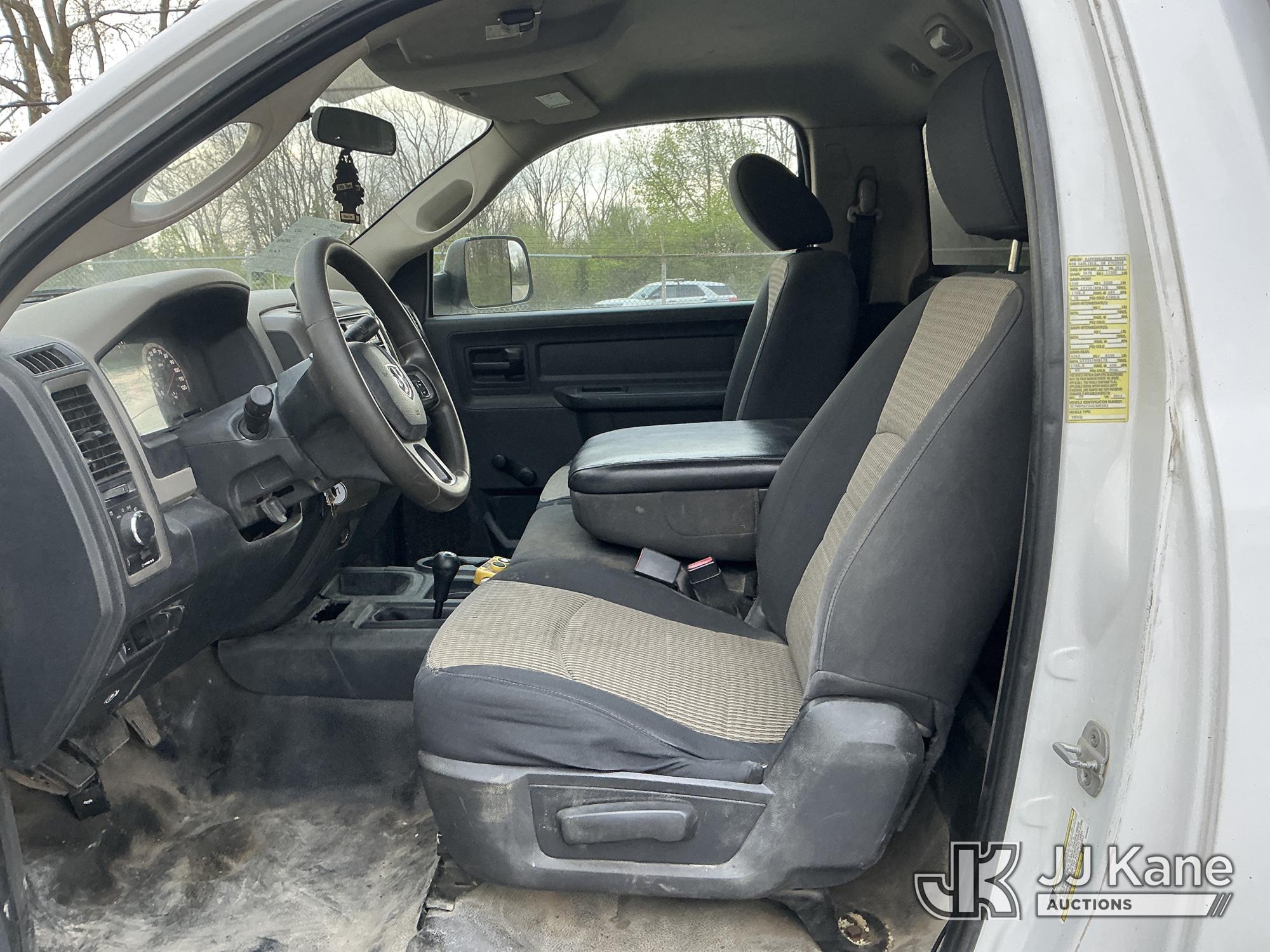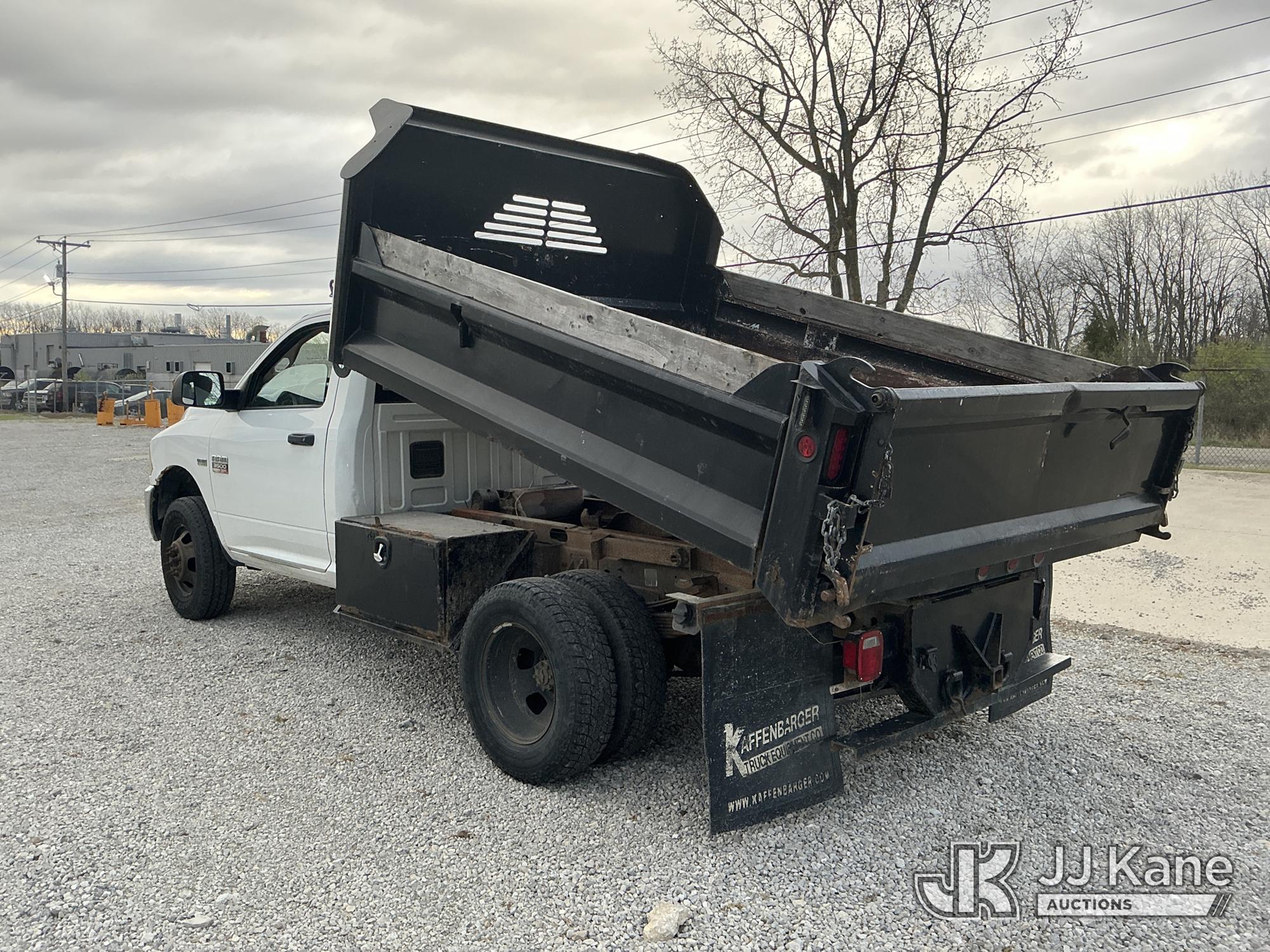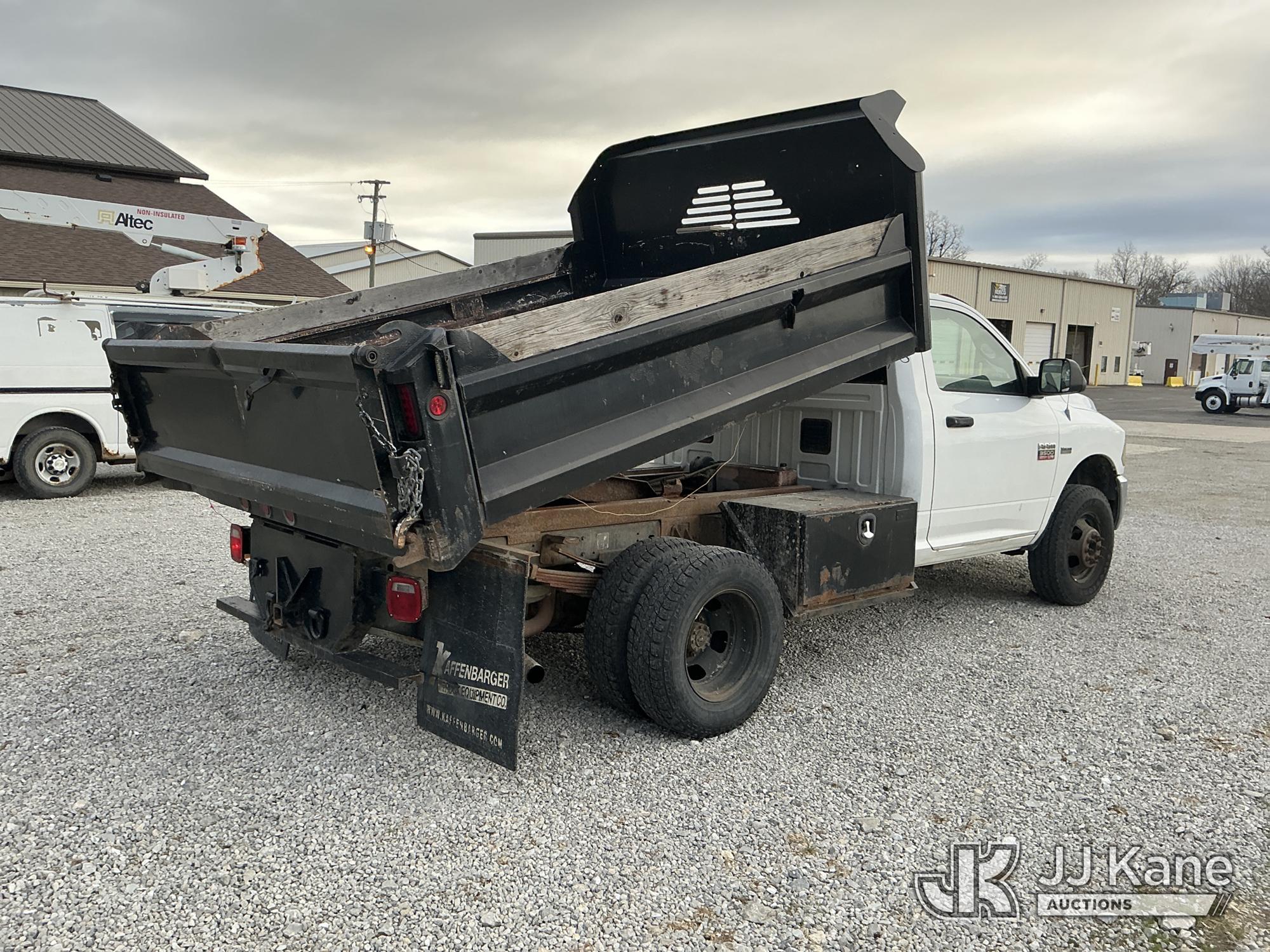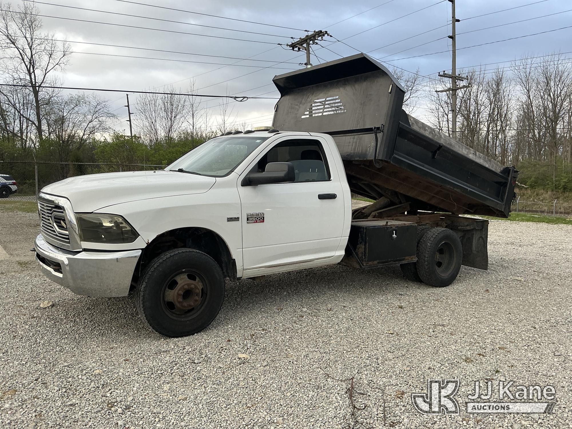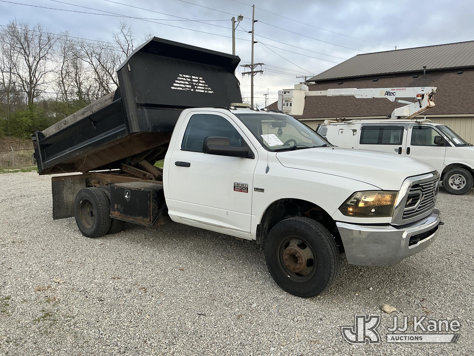 2012 Dodge Ram 3500 Dump Truck, s/n 3C7WDTAT2CG300392, 8-cyl gas, 4WD, Auto, A/C, with 3-5 yard body, (285,476 miles) (Runs, Moves & Operates) (Check Engine Light On, Body/Paint Damage) (Reads 14,518 hours) This is a Titled Item*