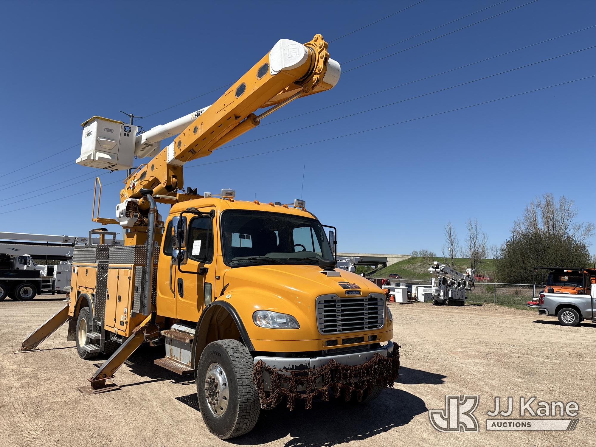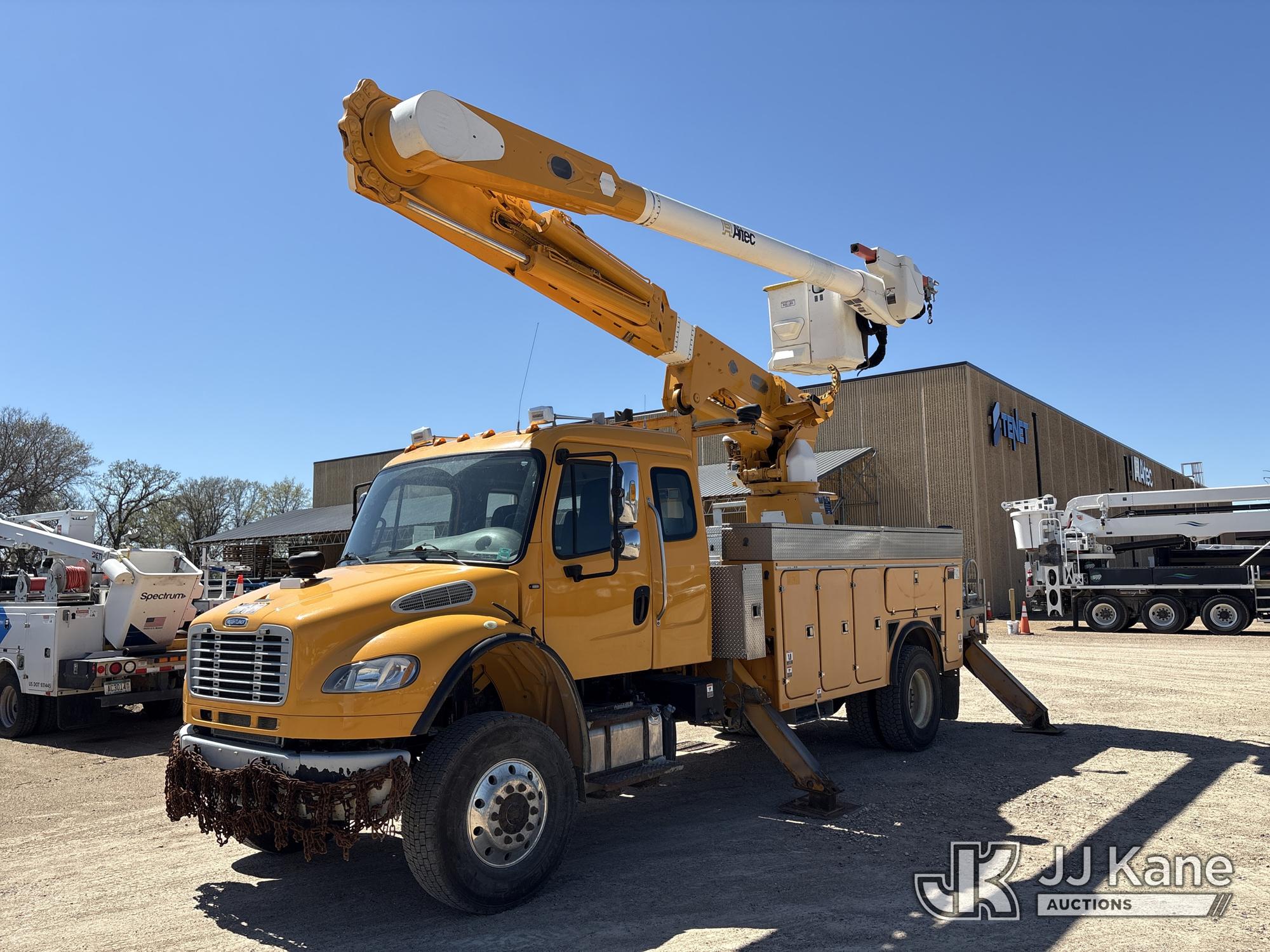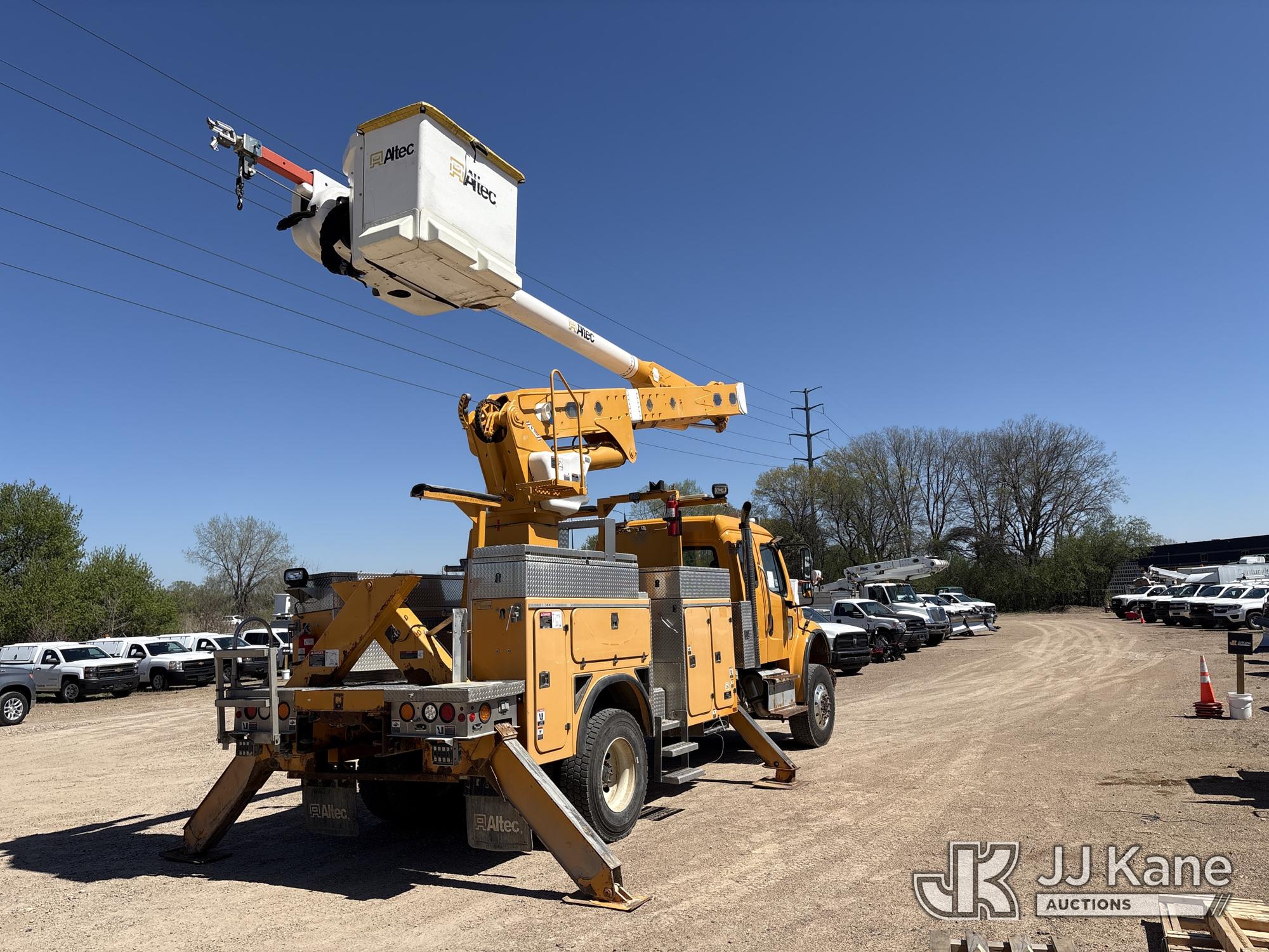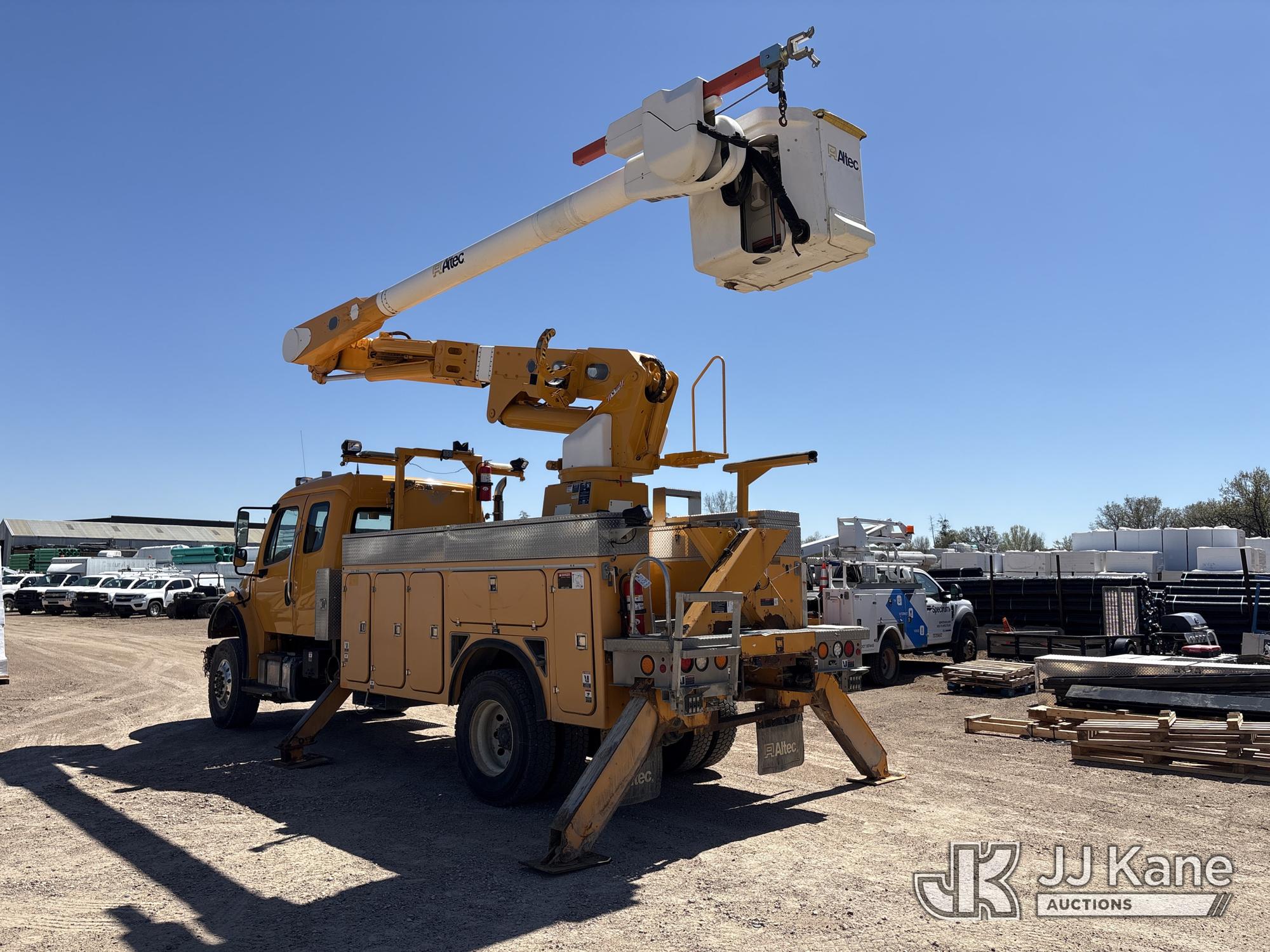 Altec AM50E, 55 ft, Over-Center Material Handling Bucket Truck s/n 1014DM5379, with 2-man bucket, 4 hydraulic outriggers, mounted behind cab on 2015 Freightliner M2 106 Extended-Cab Utility Truck, 8.9L 4X4, DIESEL, Auto, A/C, (195,304 miles) Co-op Owned ((Runs, Moves, Upper Operates)(Check Engine Light On) (Hole in Bucket) (Reads 12,867 hours) This is a Titled Item*