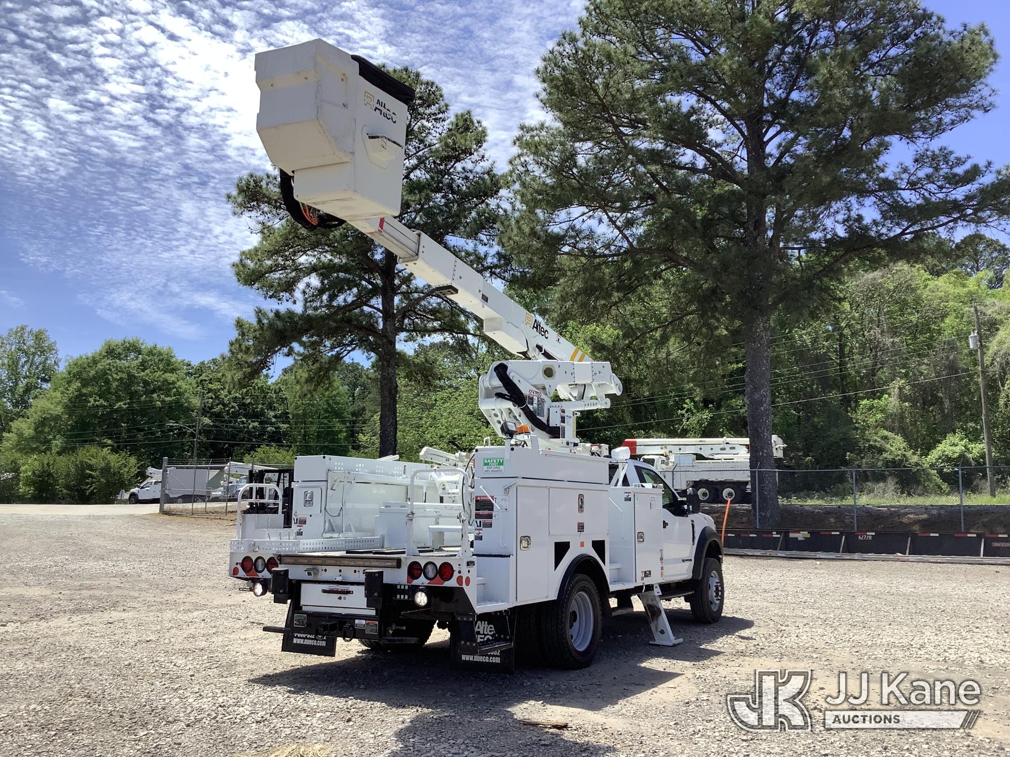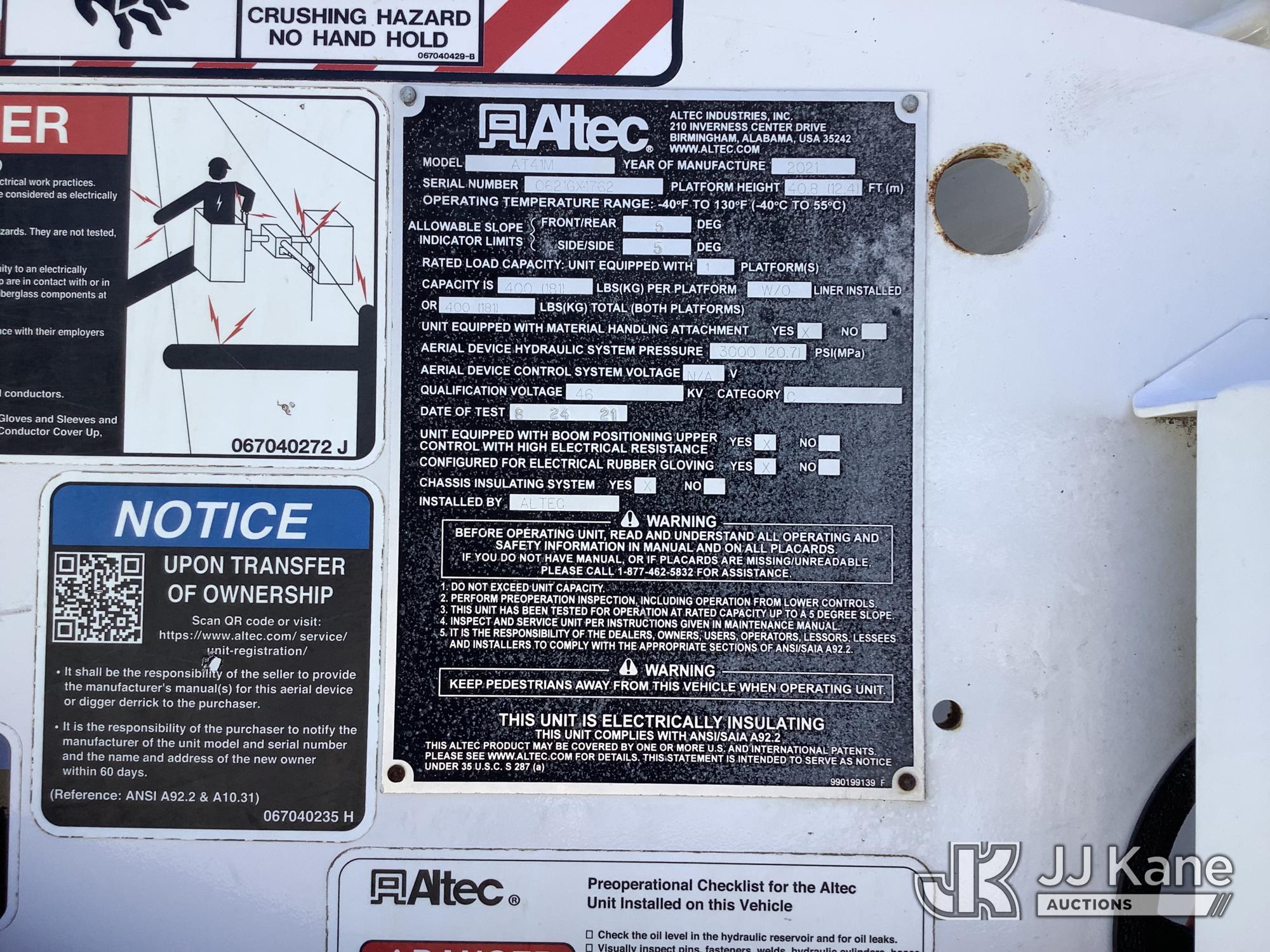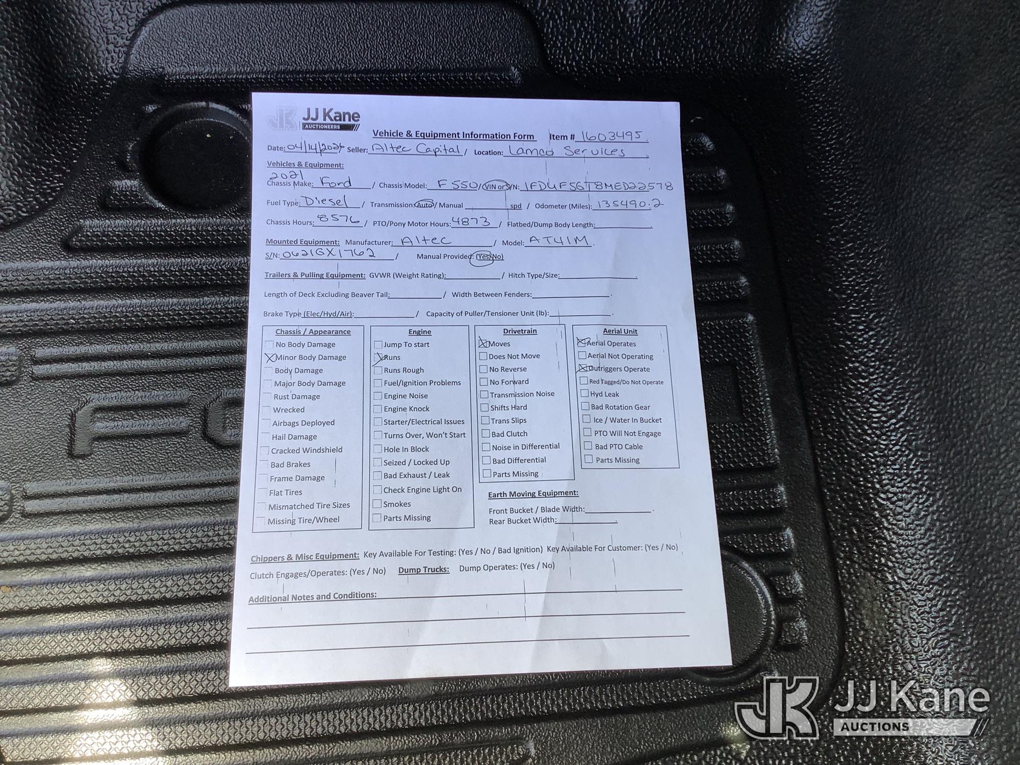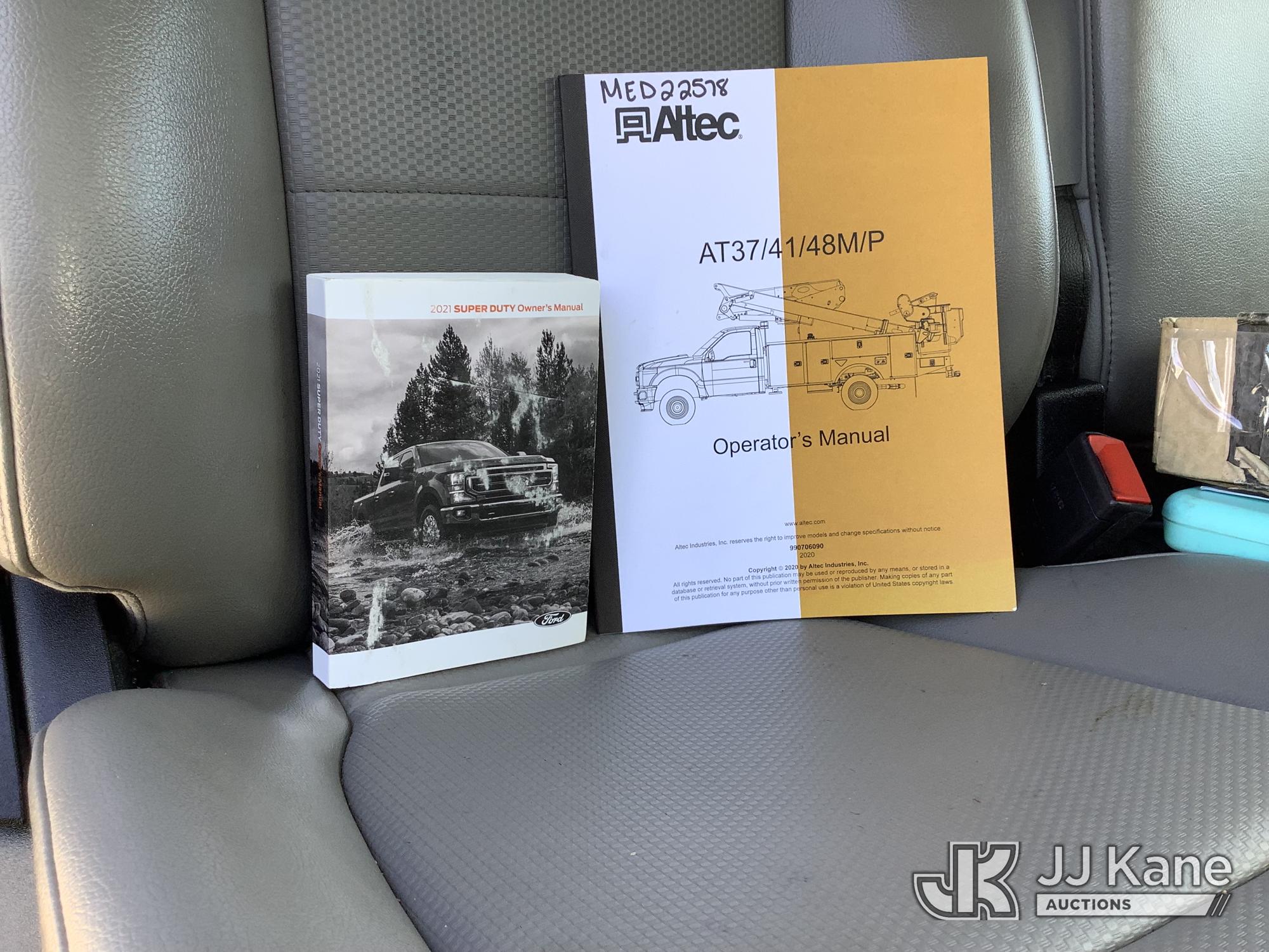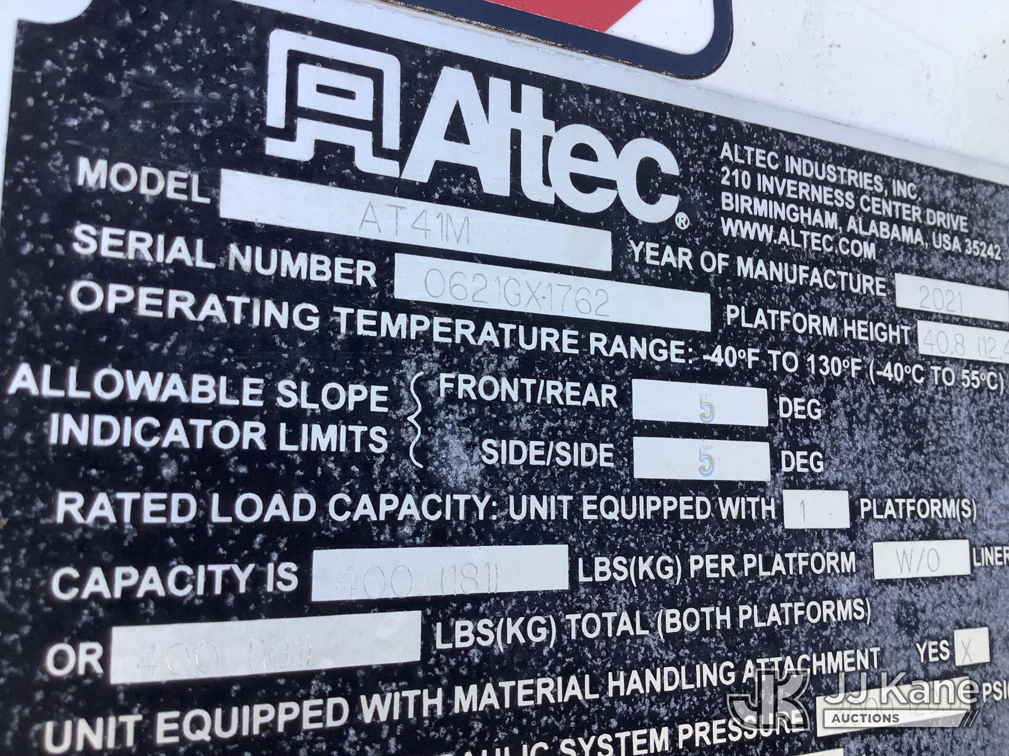 Altec AT41M, 46 ft, Articulating & Telescopic Material Handling Bucket Truck s/n 0621GX1762, with single-man bucket & 2 hyd outriggers, mounted behind cab on 2021 Ford F550 Service Truck, 6.7L Diesel, RWD, Auto, A/C, with front winch, (135,490 miles) (Runs, Moves & Upper Operates) This is a Titled Item*