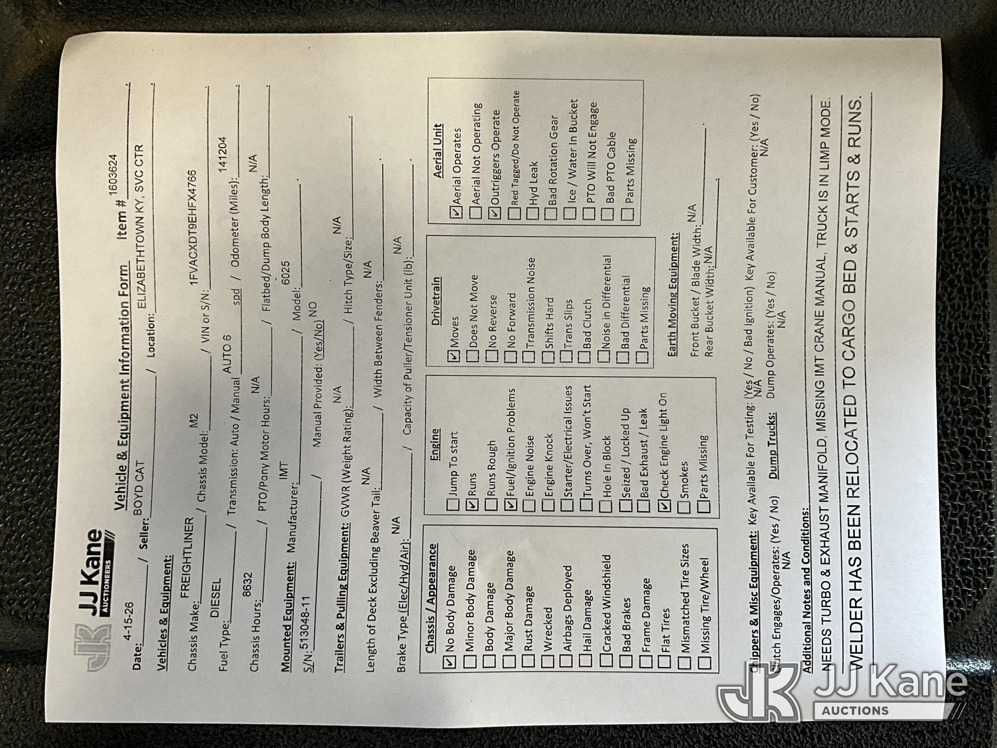 2014 Freightliner M2 106 Mechanics Service Truck, 6.7L L6 Diesel, 4X2, Auto, A/C, with IMT 6025 Material Crane, 10500 lbs., Miller Big Blue 500P Welder Generator & 2 Hyd. Outriggers (1 out & down) & Crane Remote, (141,204 miles) (Runs, Moves & Crane Operates, Check Engine & ABS Light On, Seller Note: Needs Turbo & Exhaust Manifold) This is a Titled Item*