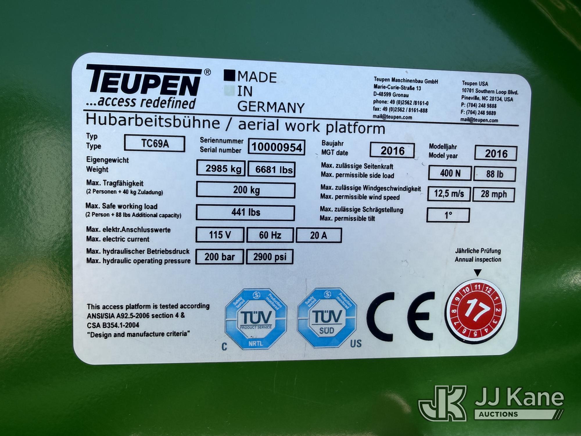2016 Teupen TC69A Articulating & Telescopic Manlift, s/n 10000954, diesel, Hydrostatic, (**Dealer Only**(Runs & Operates)(This item has been removed from service due to the listed safety repairs that were not completed. The safety items below must be completed by an approved OEM facility before the unit can return to service: REPLACE DAMAGED UPPER BOOM; LOWER BOOM DAMAGED AND BOOM STOW LOOSE - REQUIRES ANSI INSPECTION FOR REPAIR/REPLACEMENT REQUIREMENTS, COMPLETE ANY REQUIRED TESTING AND REPAIRS AFTER INSPECTIONS ARE COMPLETED) (Reads 711 hours) (Bidding Restricted to Licensed Vehicle Dealers Only),*