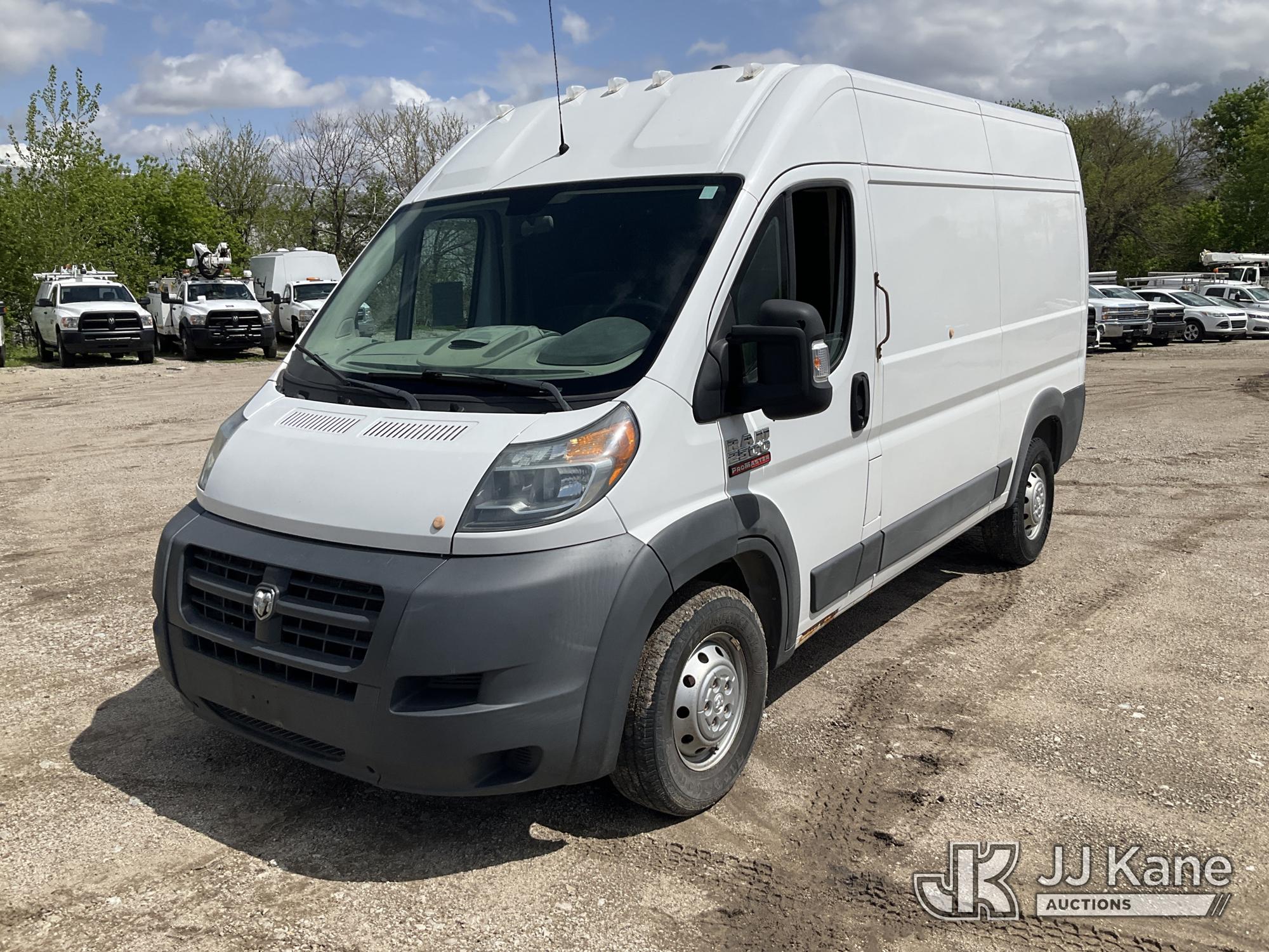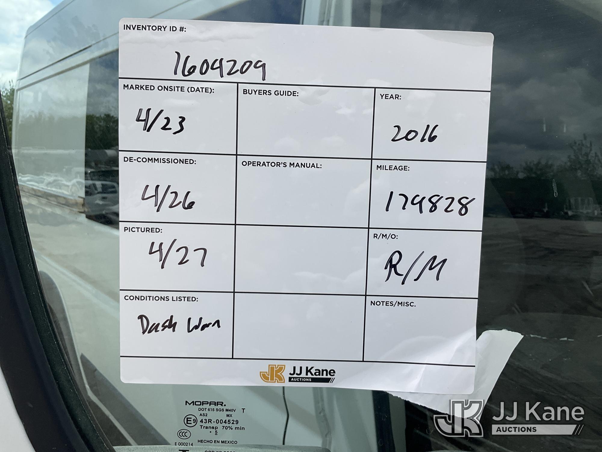 2016 RAM Promaster 2500 High Roof Sprinter Cargo Van, 6-cyl FWD, Gas, Auto, A/C, (179,828 miles) ((Runs & Moves) (Engine Won’t Stay Running Without a Battery Pack, Dash Warning Indicator On, Exterior Defects - Could Not Open Sliding Door)) This is a Titled Item*